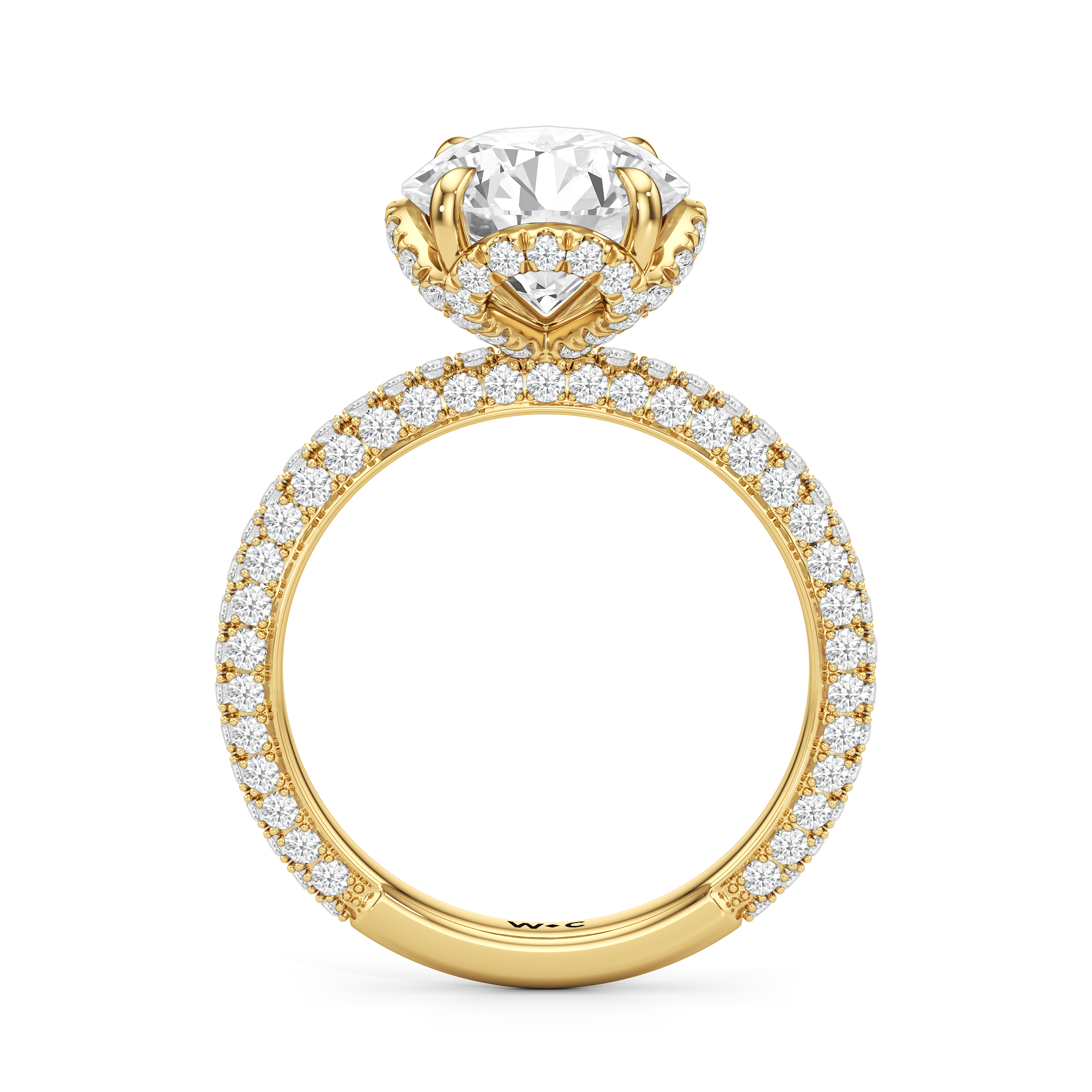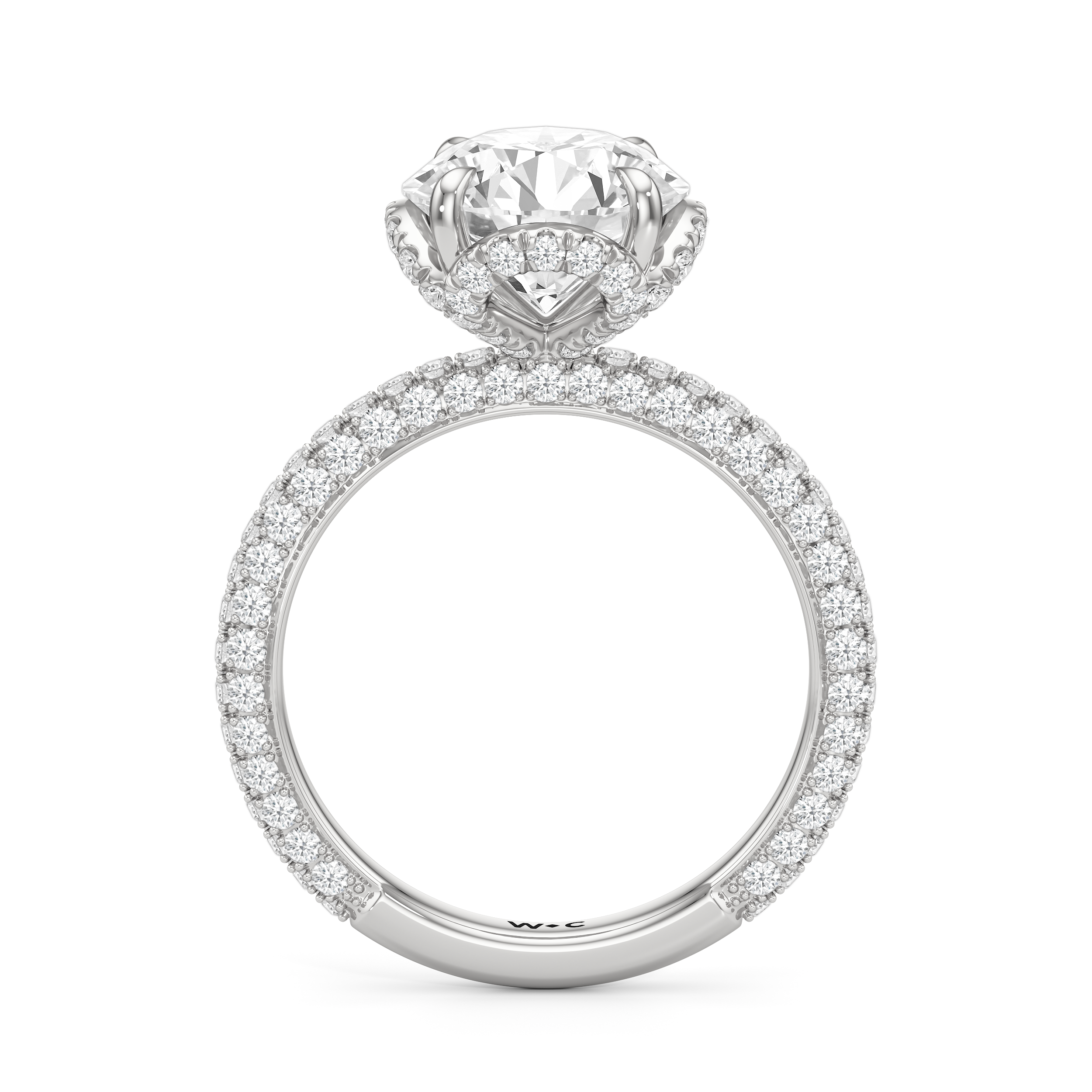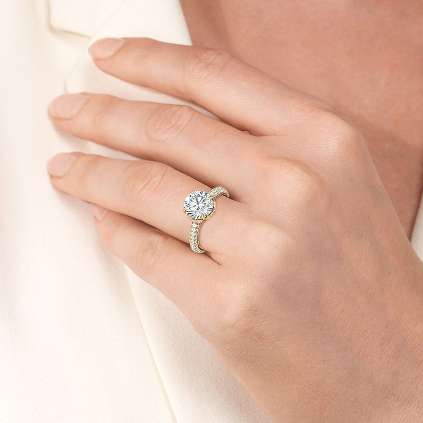 Boasting a radiant solitaire silhouette, the Sunburst ring is crowned with a single round diamond nestled in the signature diamond-adorned, petal-inspired basket of the Chrysler collection. The band features pavé-set diamonds on all three sides, shimmering like rays of light that brighten the ring's Art Deco glow.