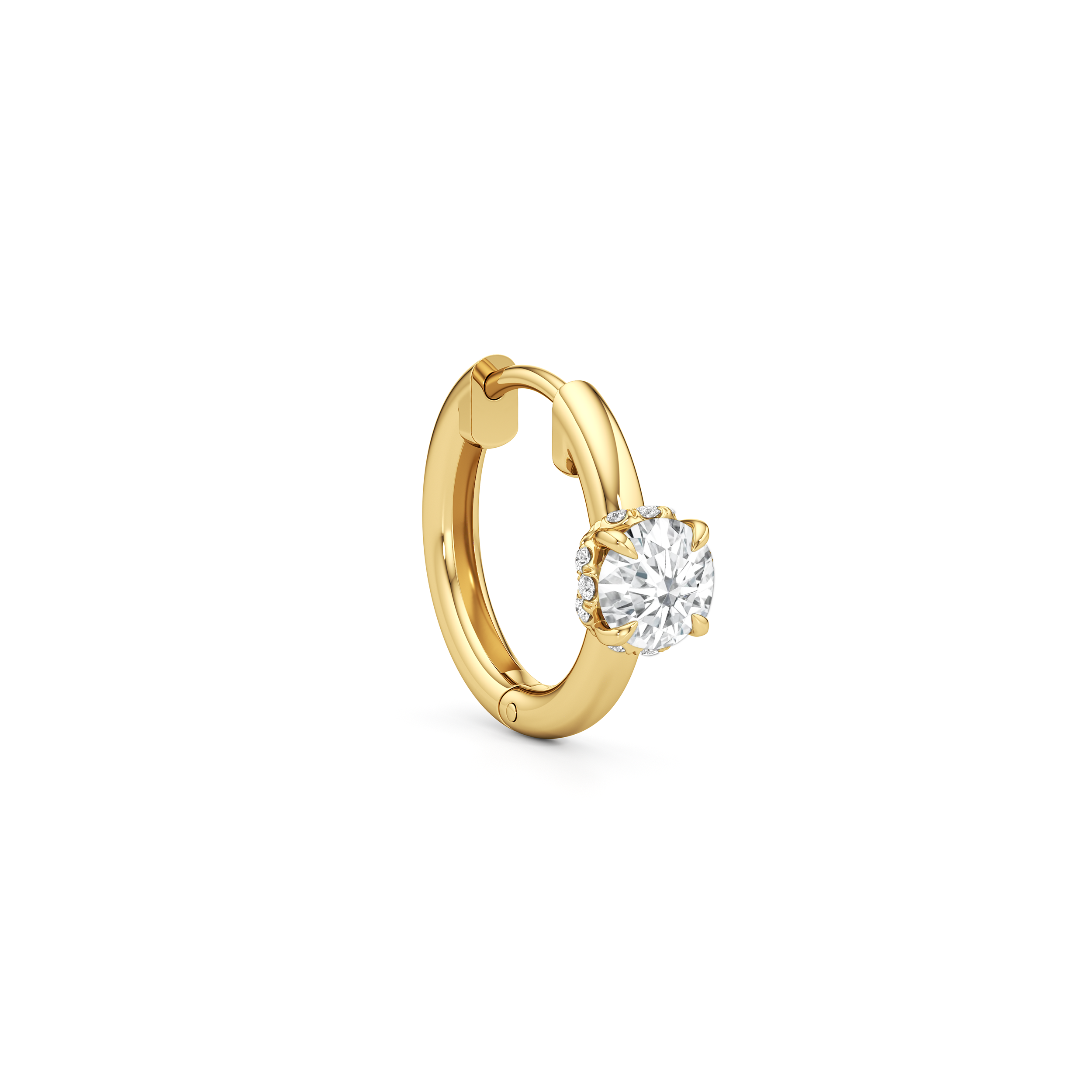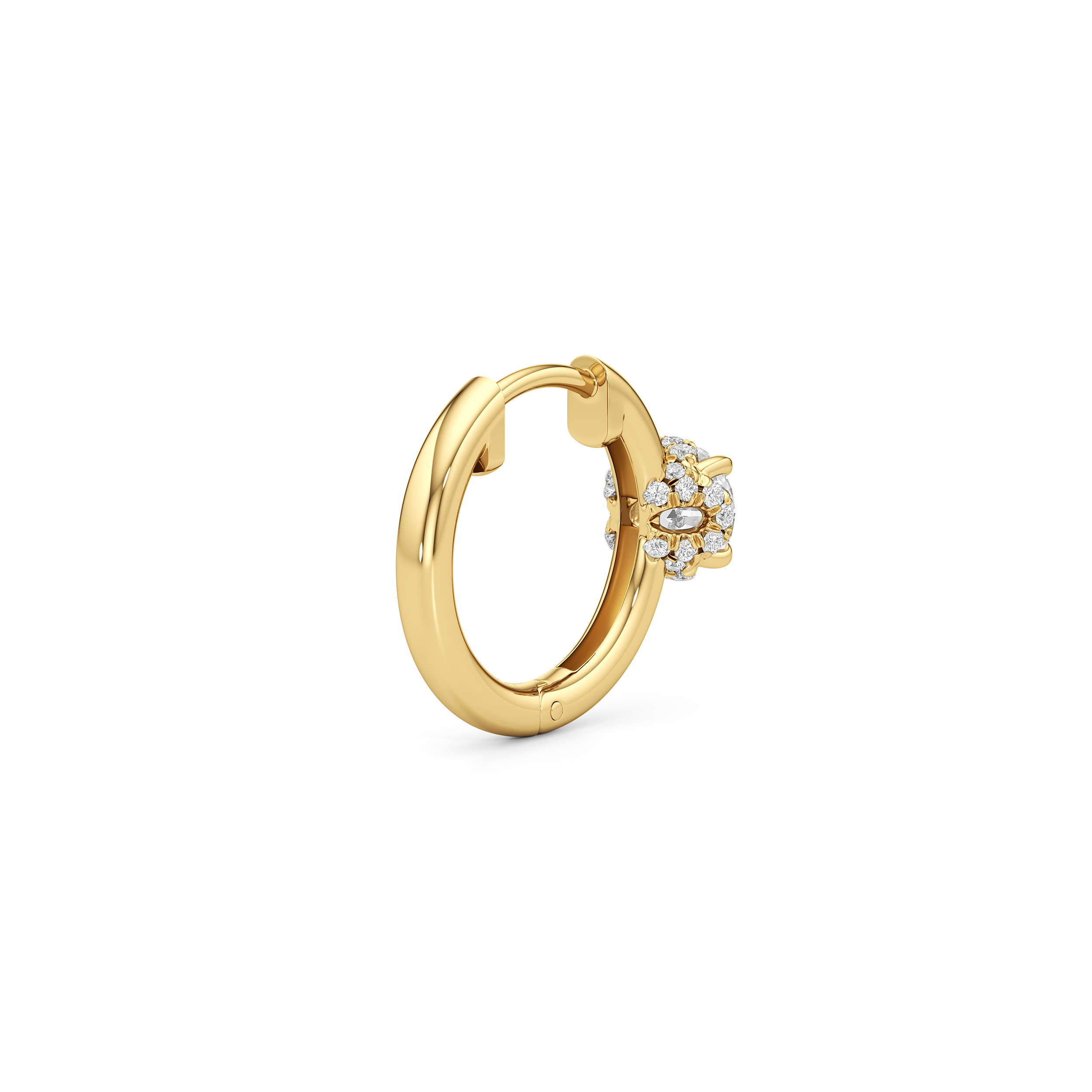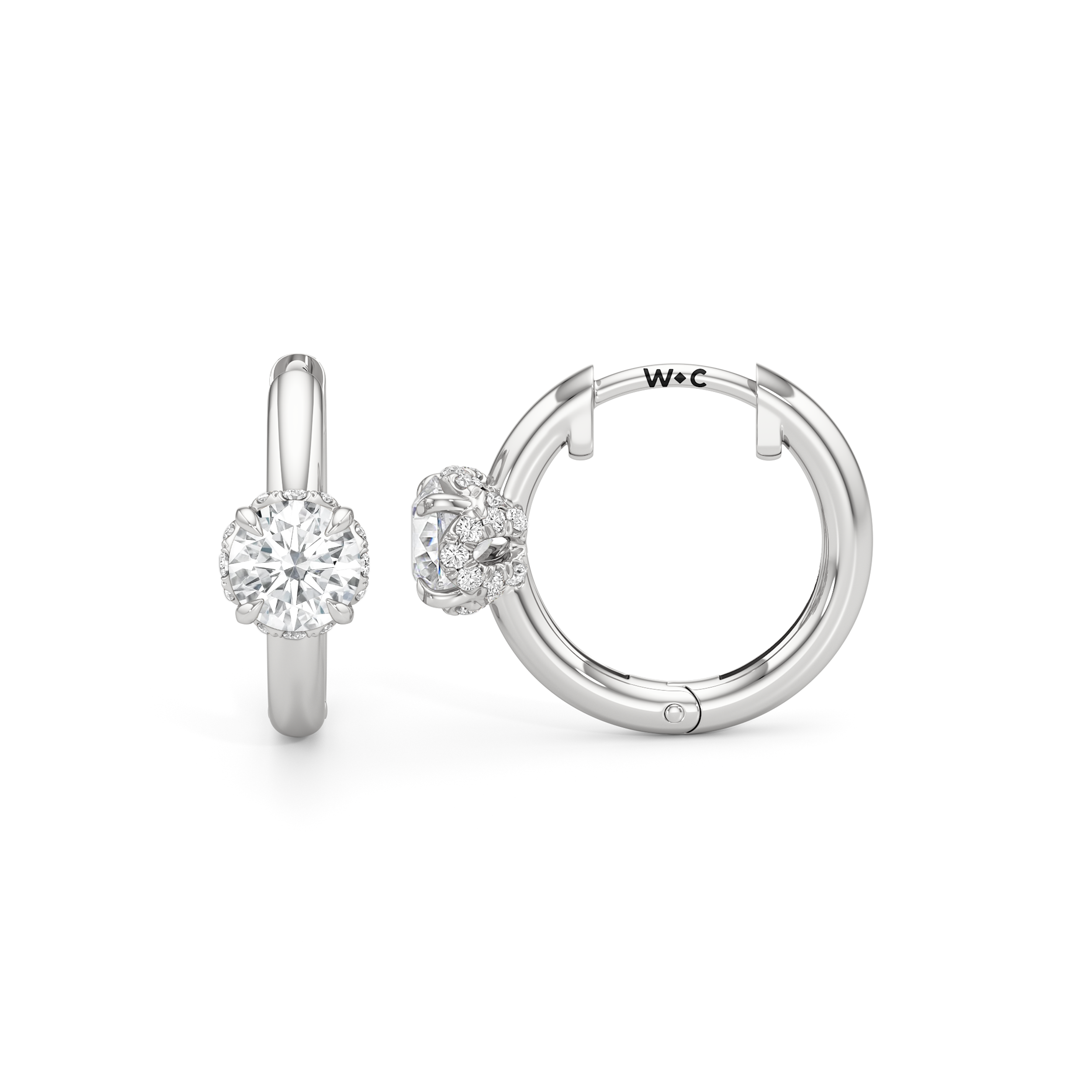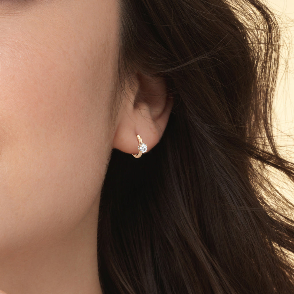Polished simplicity meets the city’s pulse in these sleek huggie hoops inspired by the heart of Midtown. The plain hoop earrings sit close to the earlobe with a secure hinged clasp. At the center front, a single diamond rests delicately in the signature diamond-studded, flower-inspired basket from the Chrysler collection.