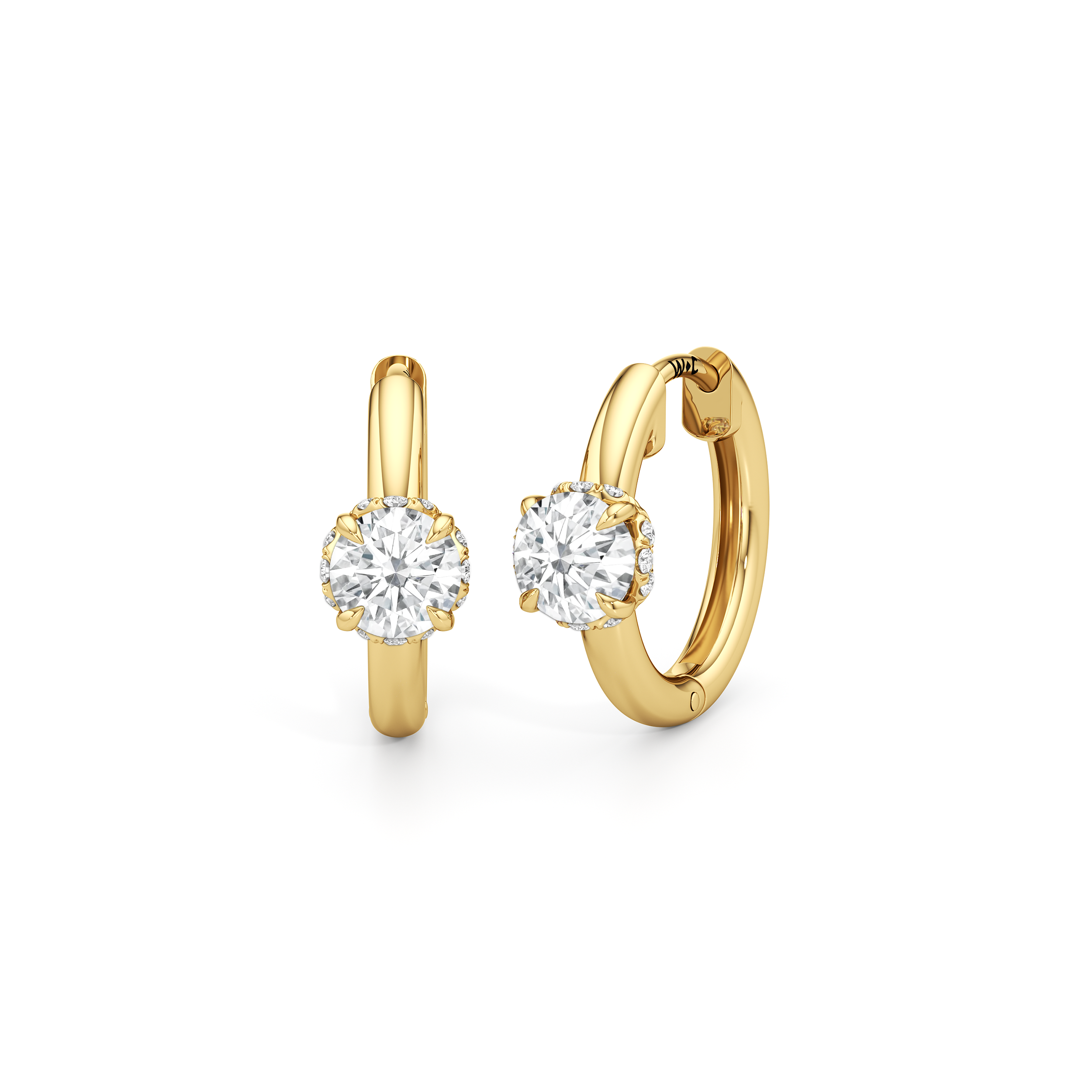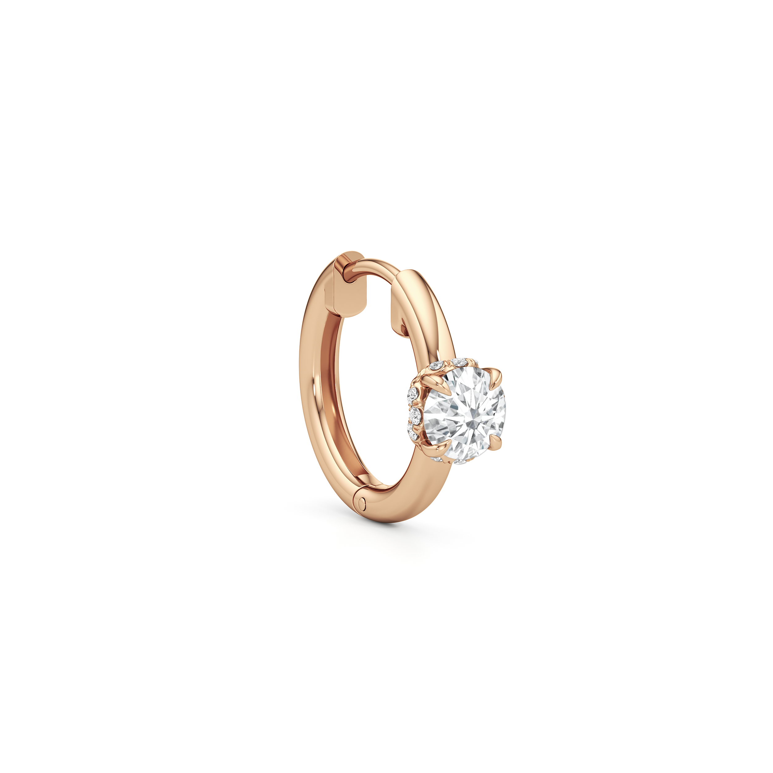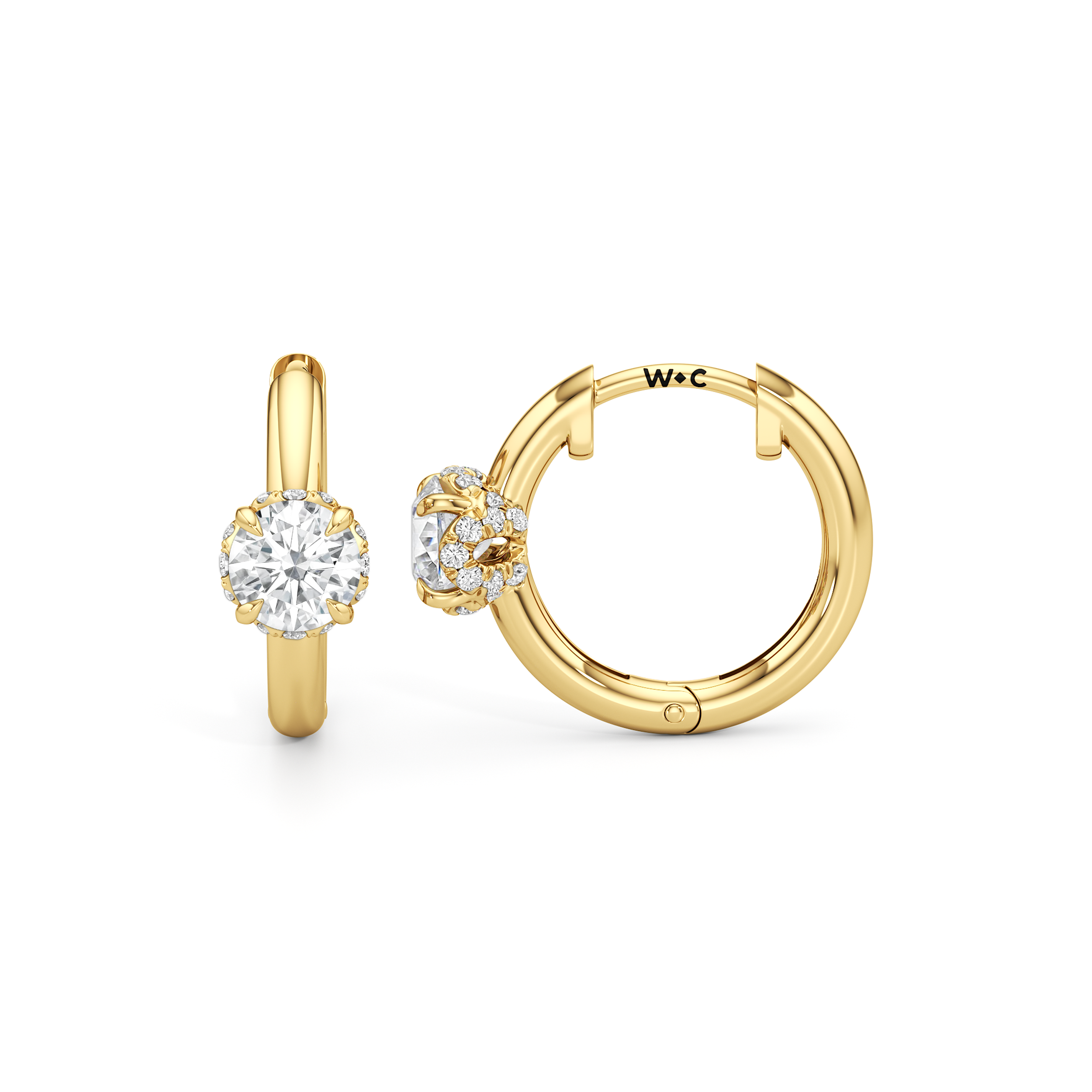 Polished simplicity meets the city’s pulse in these sleek huggie hoops inspired by the heart of Midtown. The plain hoop earrings sit close to the earlobe with a secure hinged clasp. At the center front, a single diamond rests delicately in the signature diamond-studded, flower-inspired basket from the Chrysler collection.
