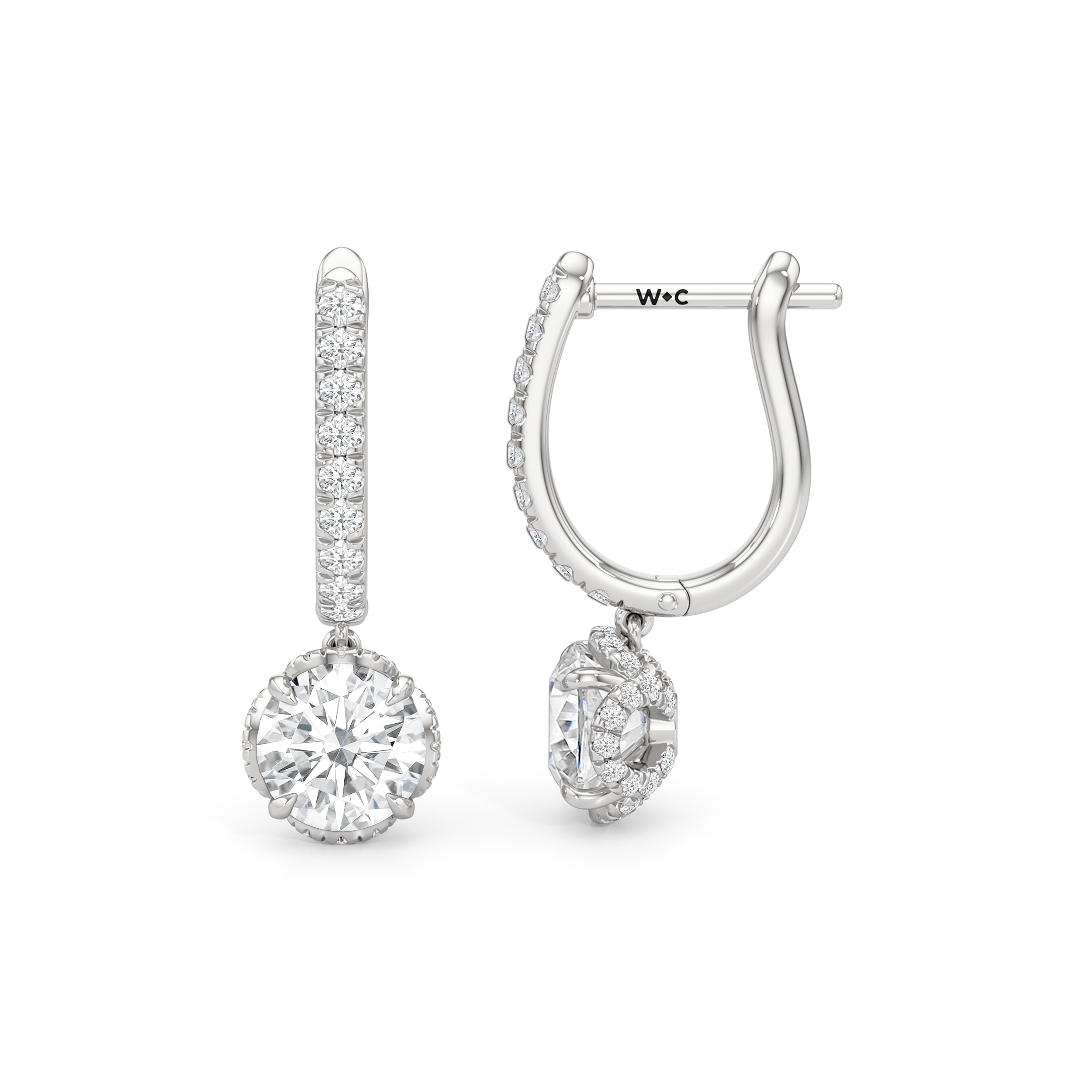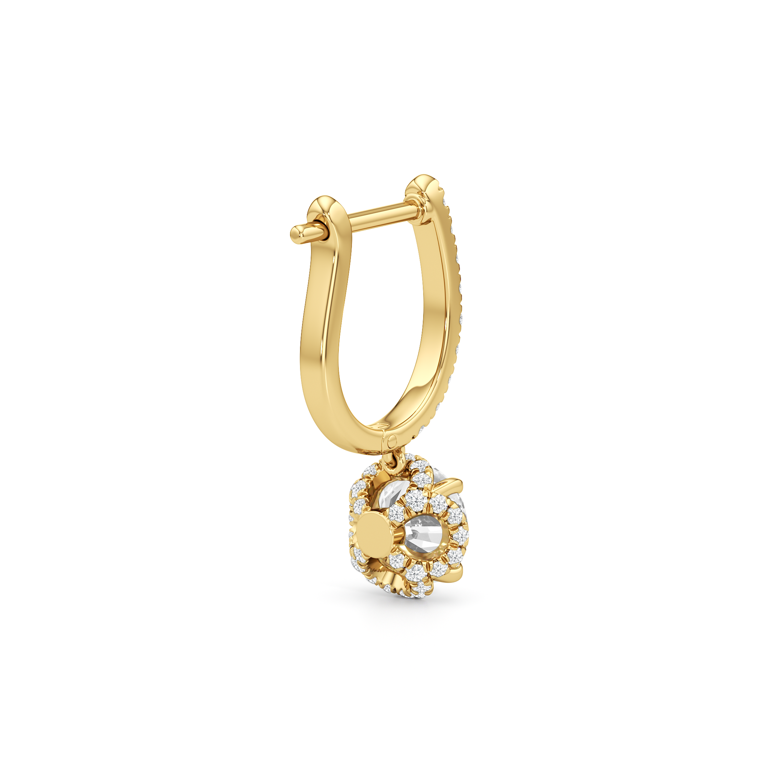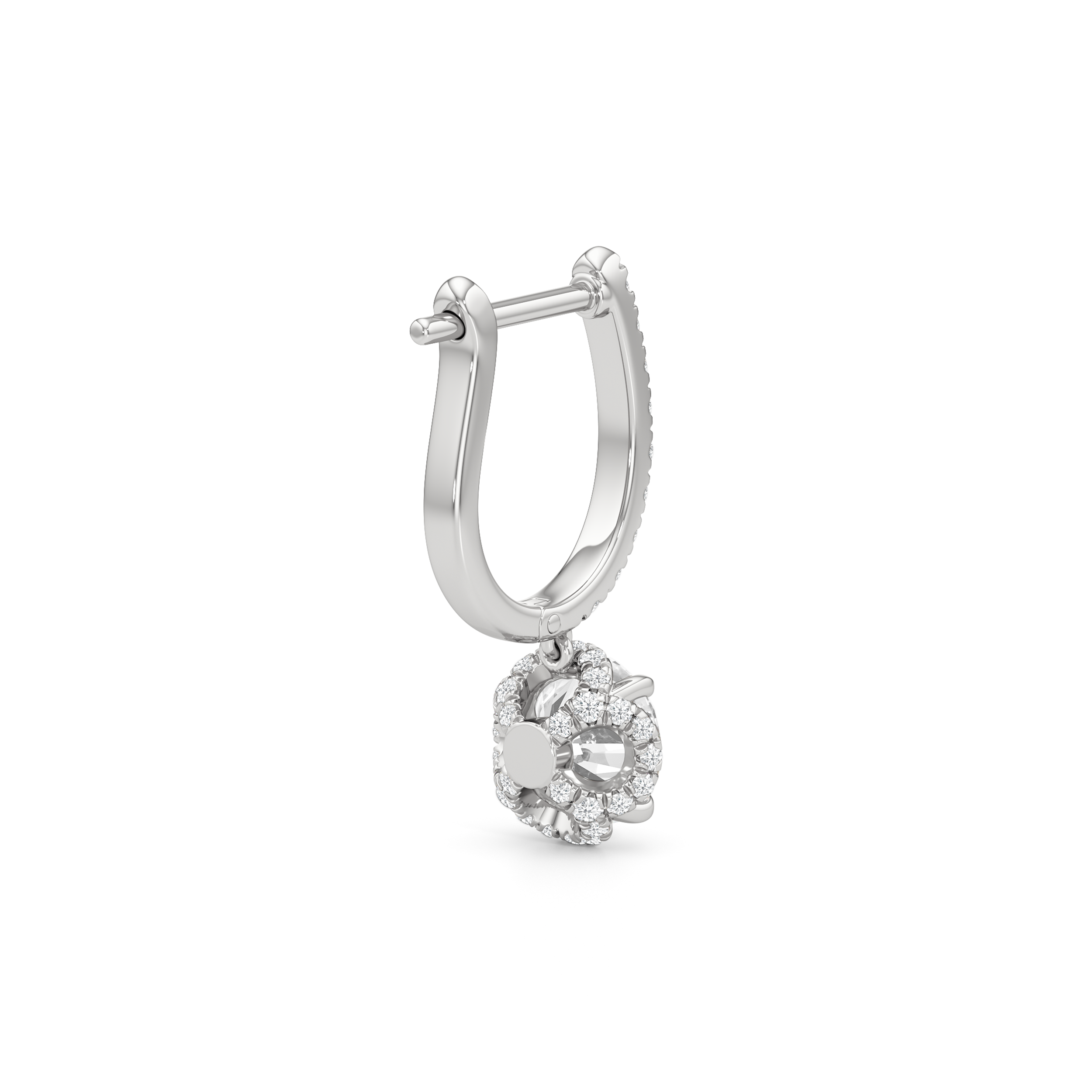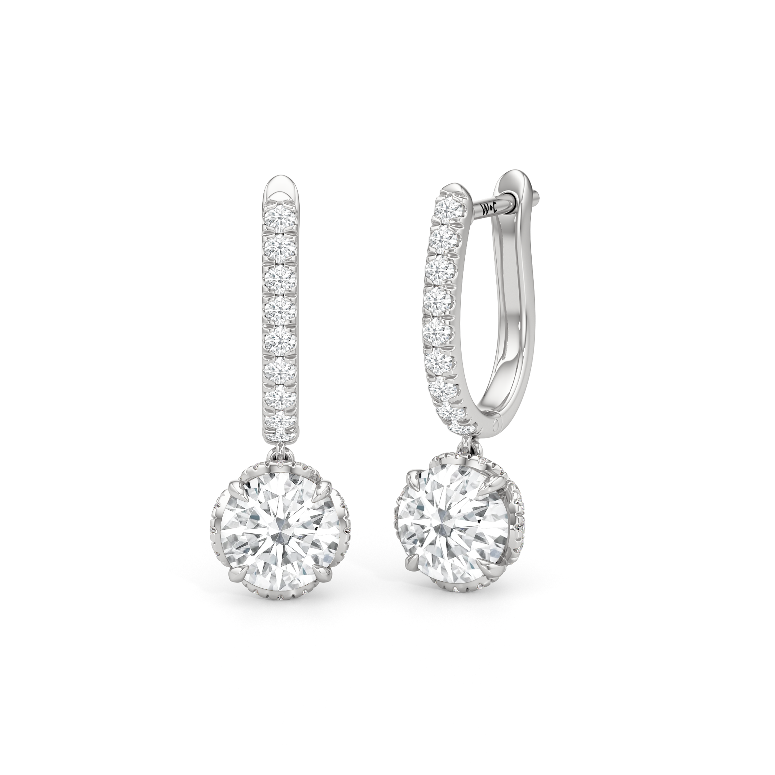 The huggies you need for a look that's simple, sharp, and city-smart. These huggie hoop earrings have their front edge lined with diamonds. Dangling from each hoop is a round diamond nestled in the signature flower-inspired basket of the Chrysler collection. Hidden diamonds peek from below the basket, revealing an unexpected flash of brilliance. The Flare earrings lock in place with a hinged clasp.