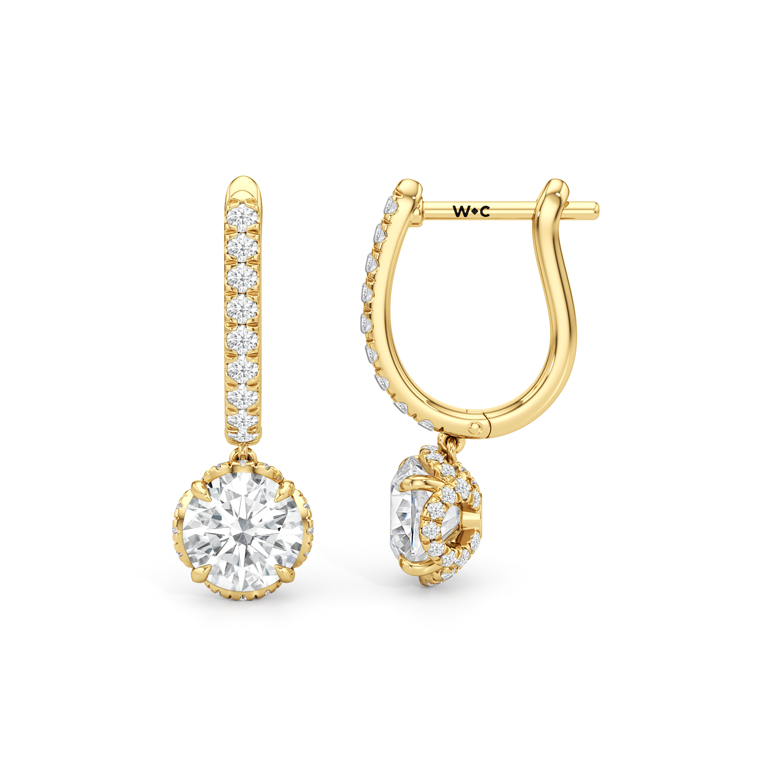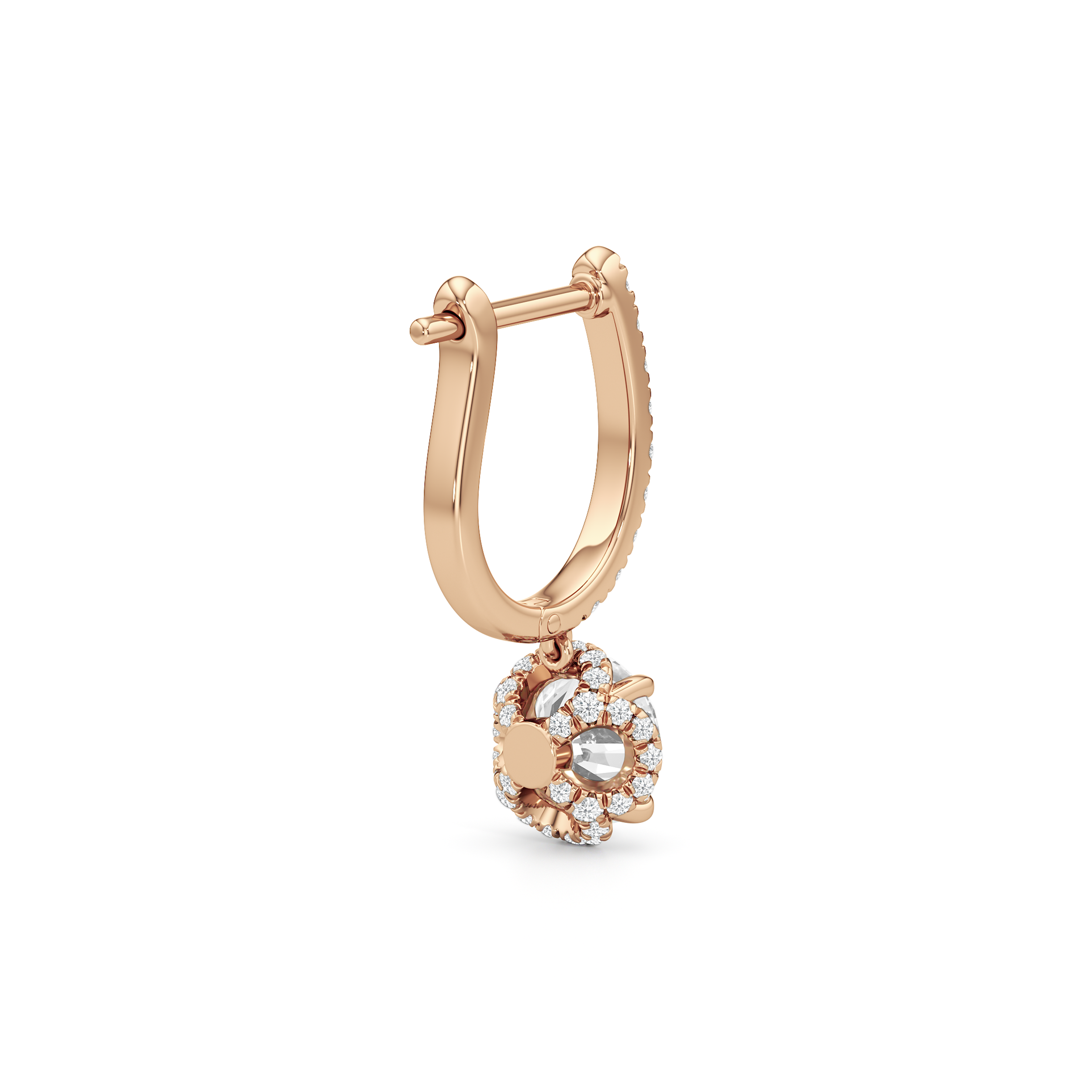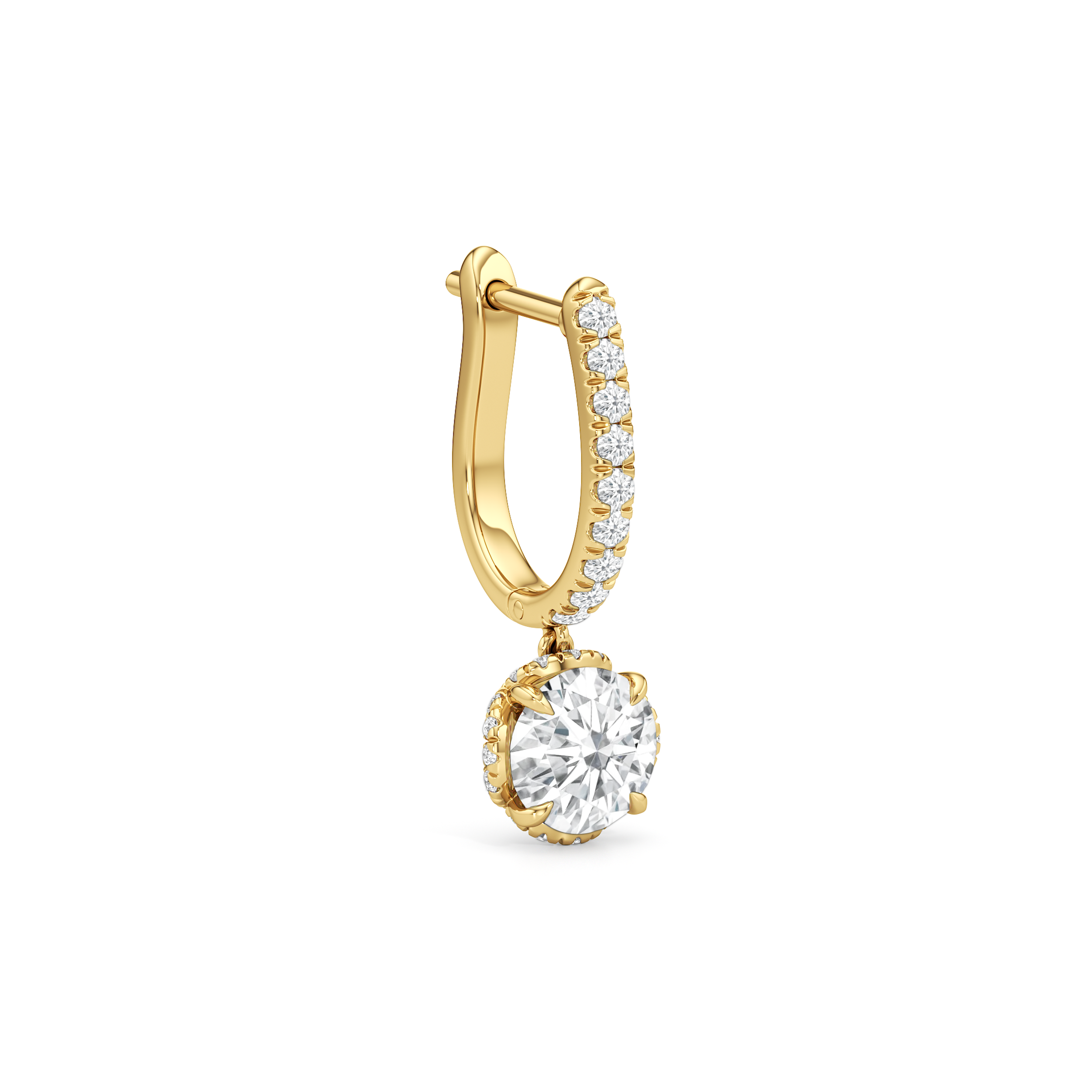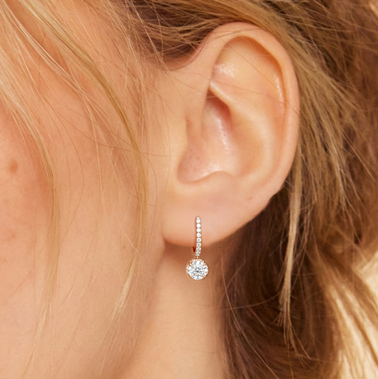 The huggies you need for a look that's simple, sharp, and city-smart. These huggie hoop earrings have their front edge lined with diamonds. Dangling from each hoop is a round diamond nestled in the signature flower-inspired basket of the Chrysler collection. Hidden diamonds peek from below the basket, revealing an unexpected flash of brilliance. The Flare earrings lock in place with a hinged clasp.