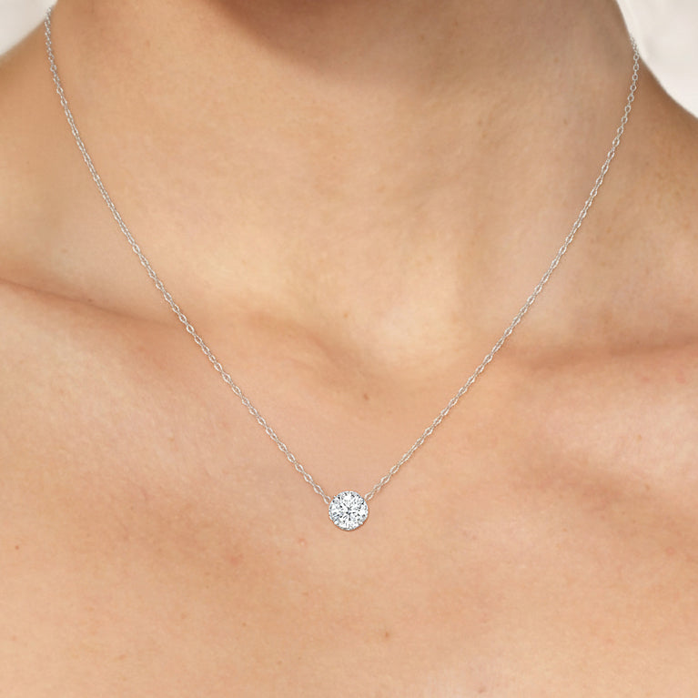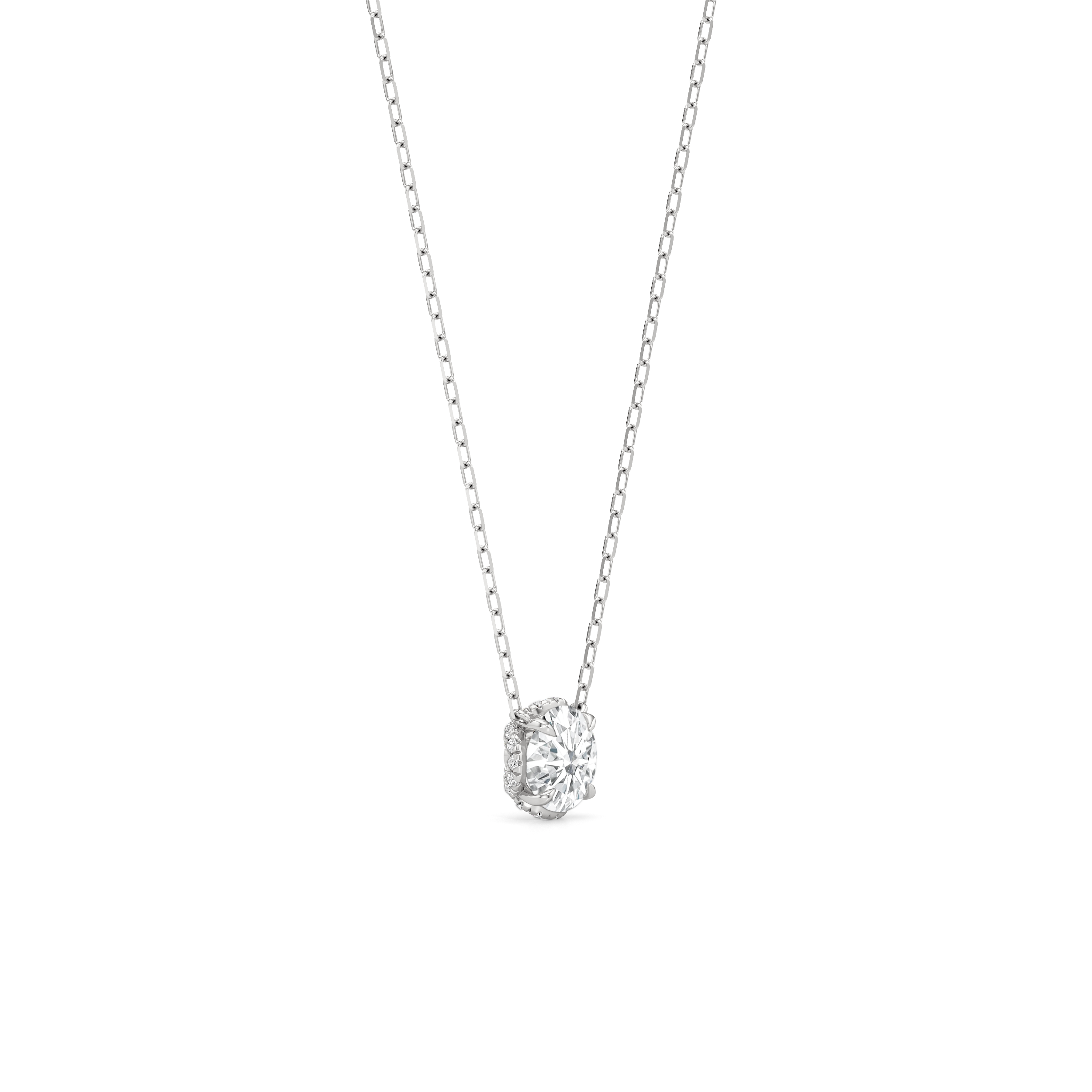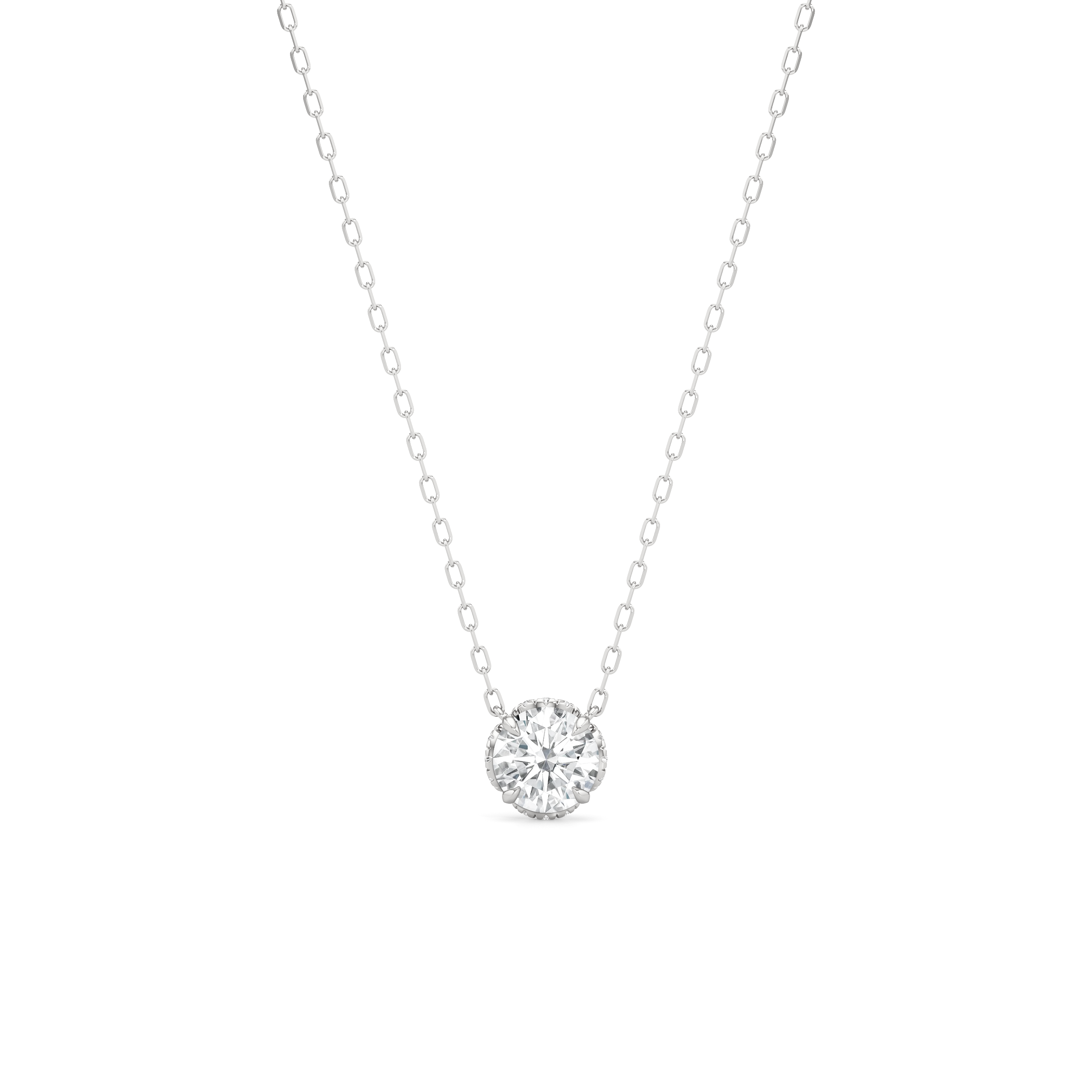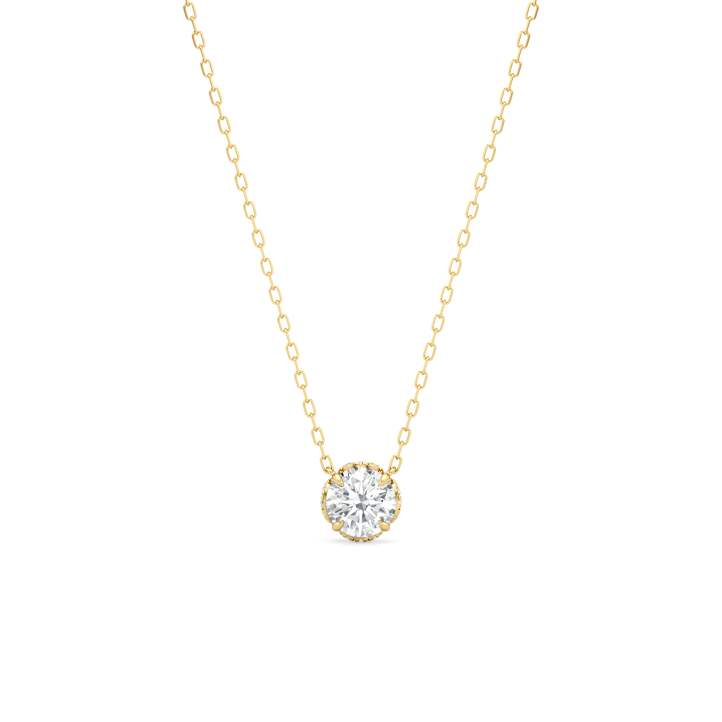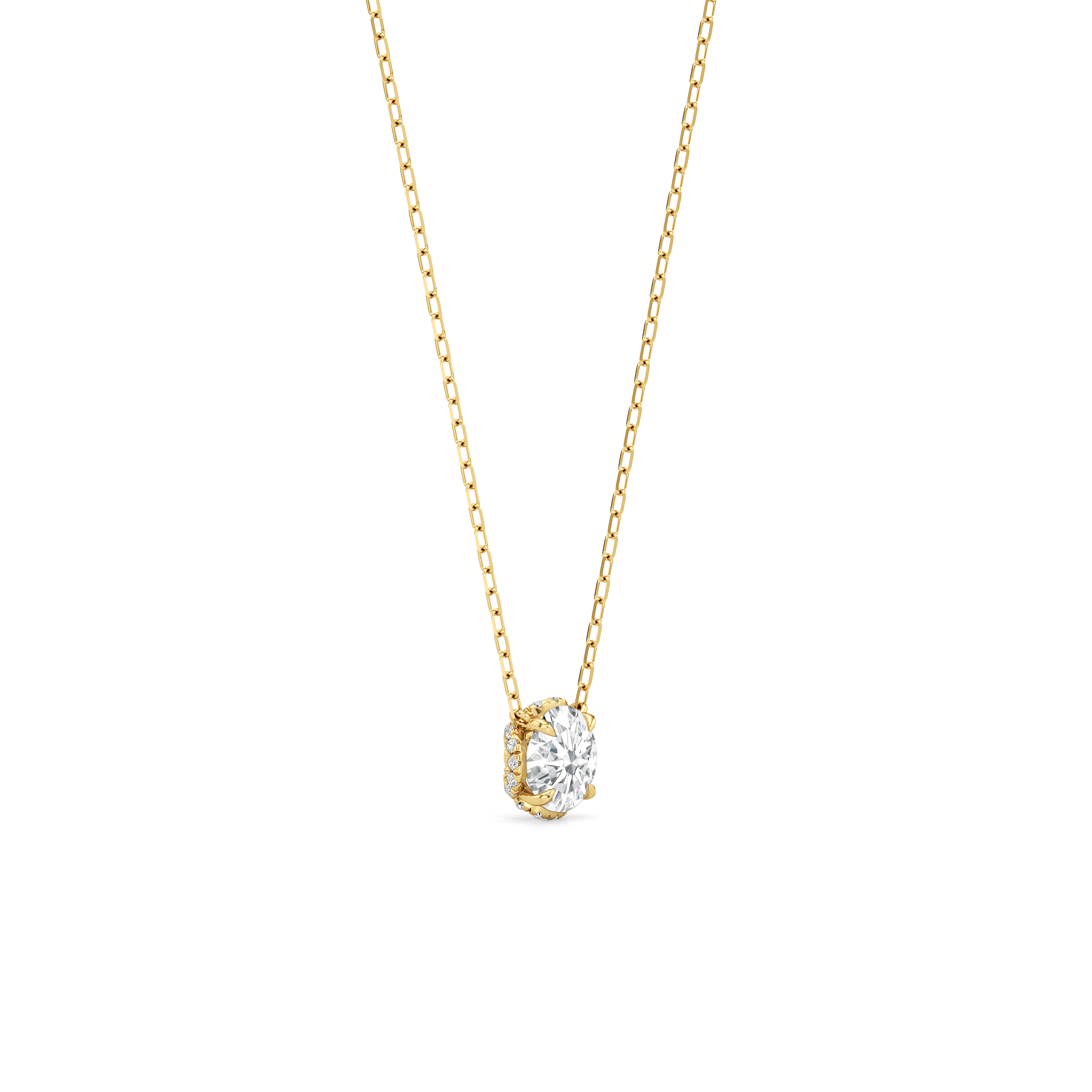 The Radiator Necklace offers a refined take on the petal-inspired basket of the popular Chrysler Ring. The piece includes a single round diamond pendant held by four prongs on a delicate flower-shaped setting. Hidden diamonds that trace the underside of the basket add a gentle sparkle for a look that's effortlessly modern.