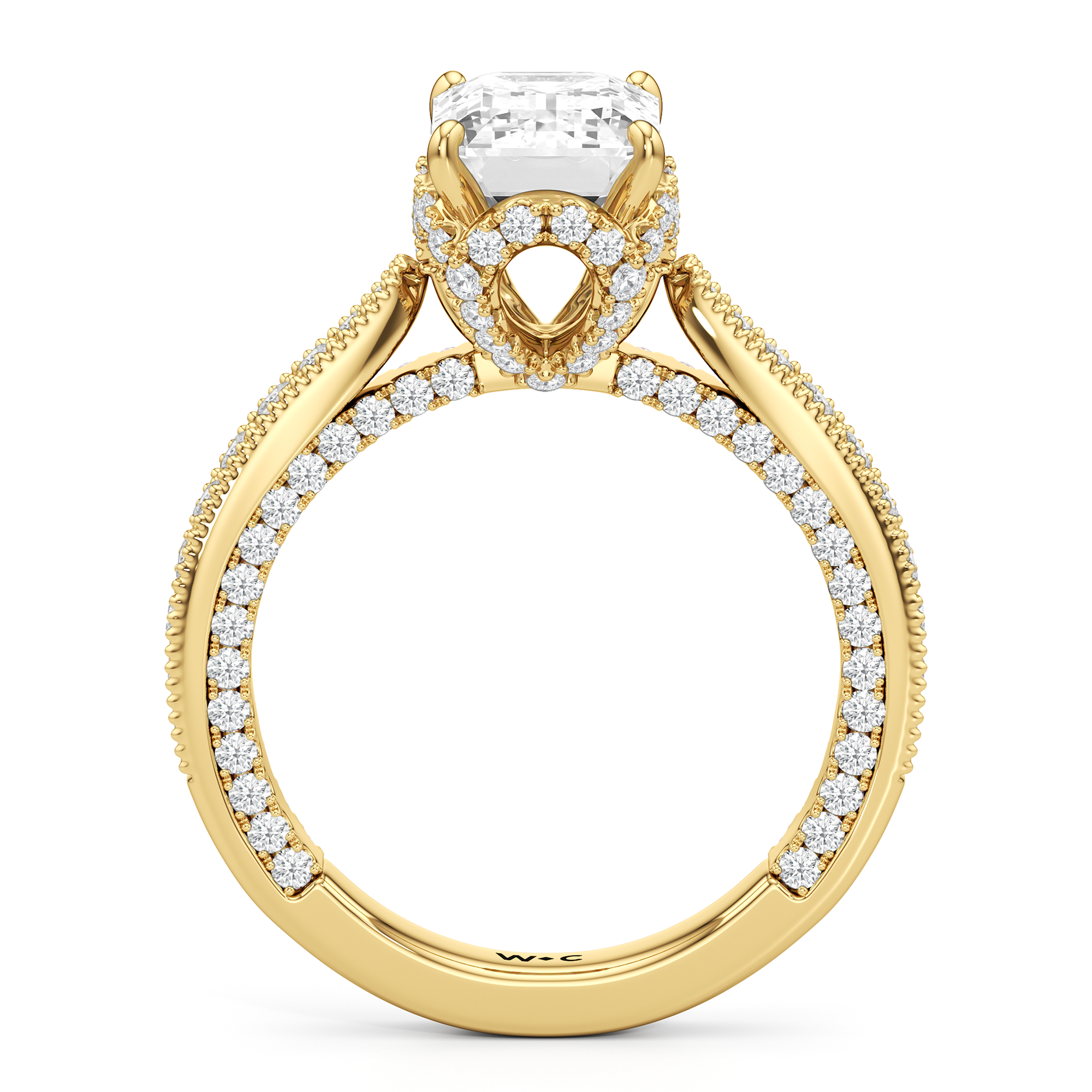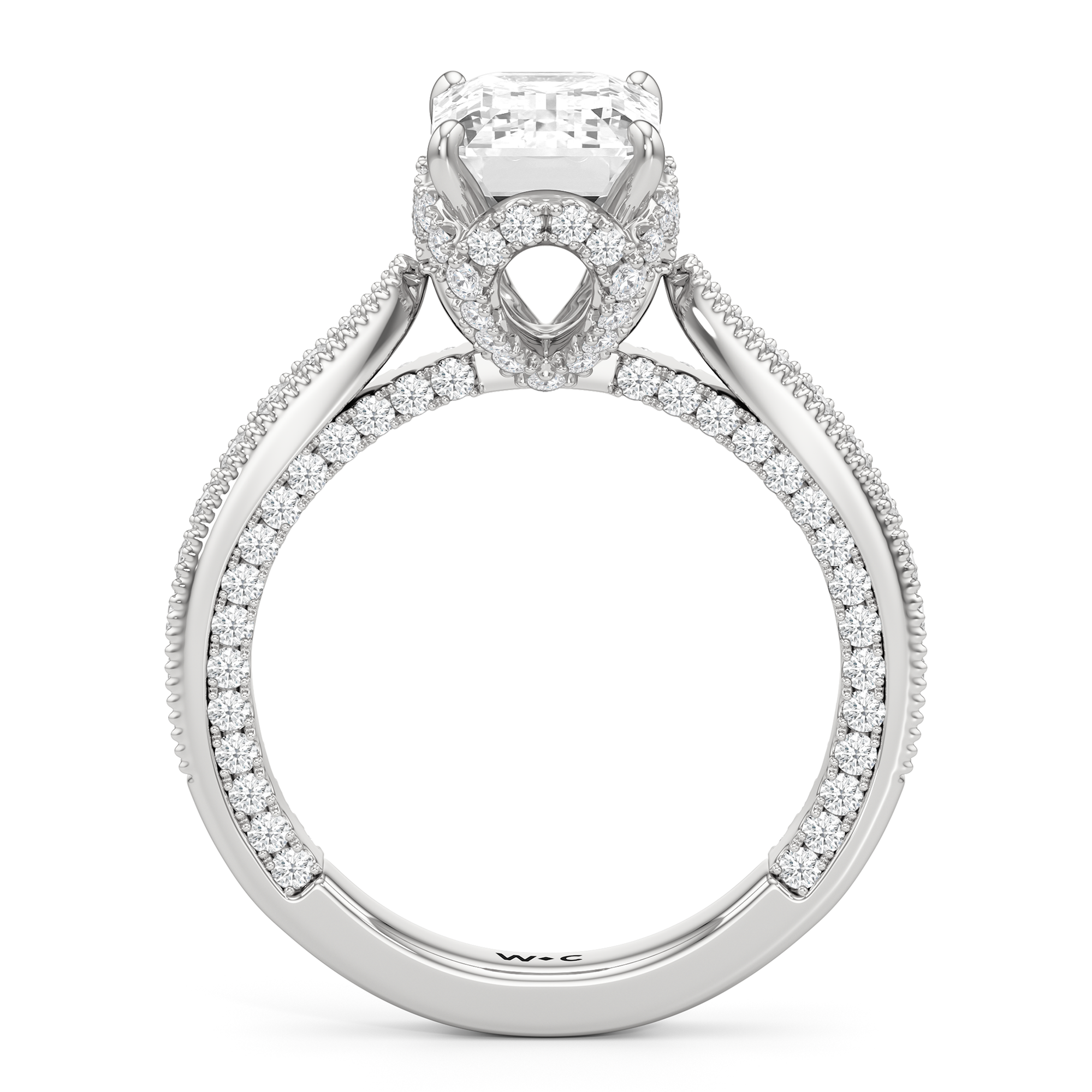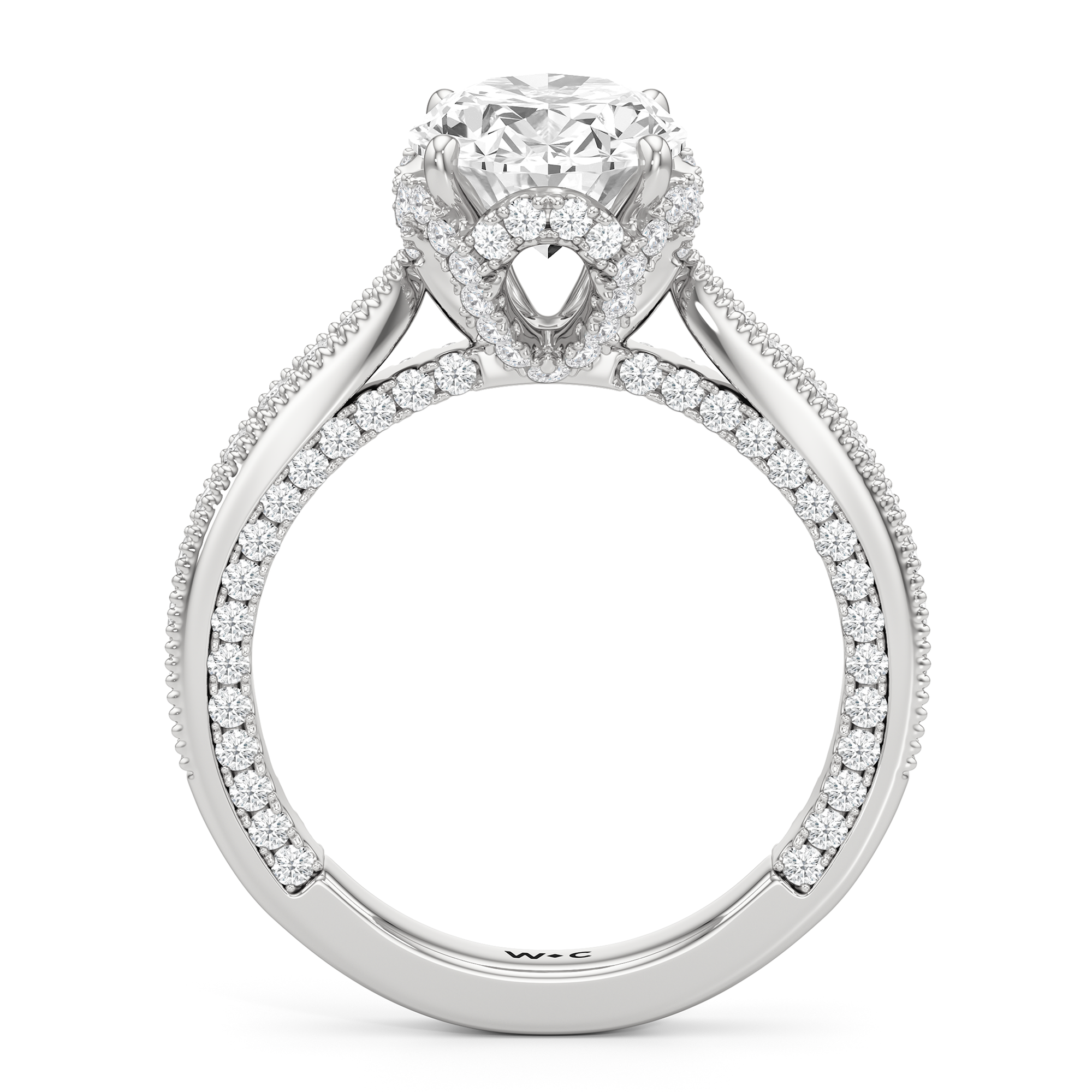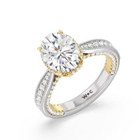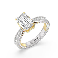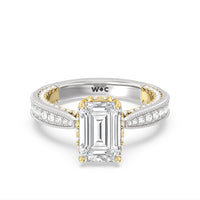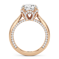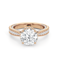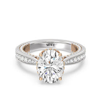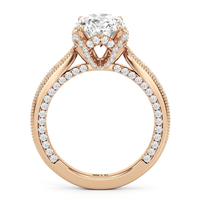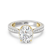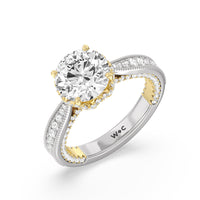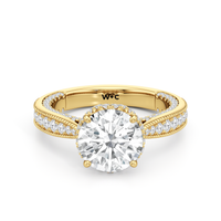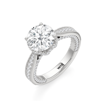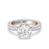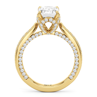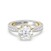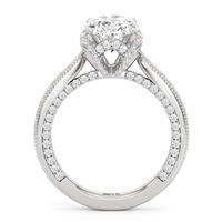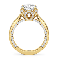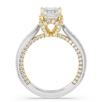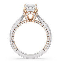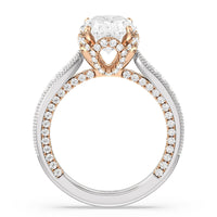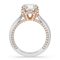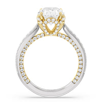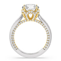 This luxe engagement ring is rooted in intricate design. It features a slender cathedral shank, which is adorned with a milgrain pavé setting. Diamonds trace the arching shoulders, with additional sparkle visible from the front view. At the center, a stunning diamond is held in a 4-prong flower-shaped basket lined with more diamonds, while the brilliance continues along the bridge and sides of the band. The two-toned finish lends a modern heirloom vibe, making this a breathtaking choice for those seeking milgrain diamond engagement rings with timeless elegance.