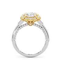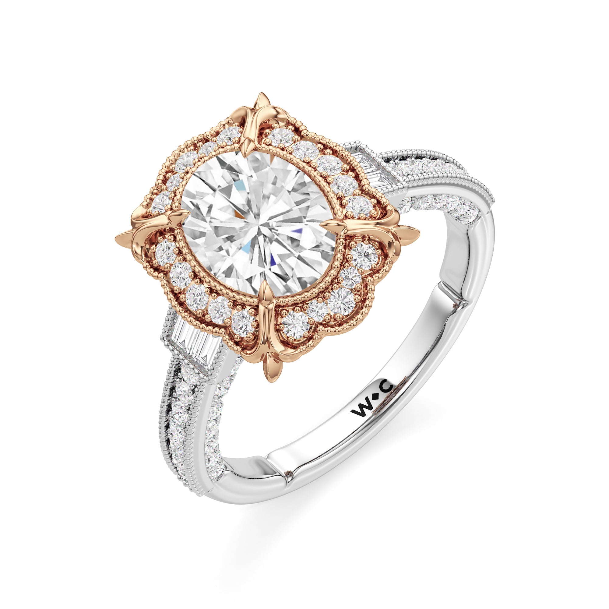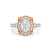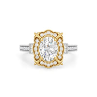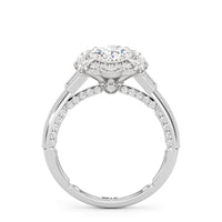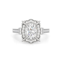 A luxurious ring presenting a design inspired by Art Deco's showcase of industrial might and delicate artistry. This architectural jewel features a prong-set center stone surrounded by a decorative frame with milgrain outline. A fleur-de-lis motif sits on each of the four corners of the frame, mirroring how the Chrysler Building’s gargoyles accentuate its iconic silhouette. More diamonds cascade from the center like a glowing skyline, starting with a pair of baguette side stones and continuing with round diamonds flowing gracefully along the cathedral shank. And like the unexpected details of the Chrysler Building, this ring also features hidden diamonds on the bridge ready to be discovered by those who look closer.