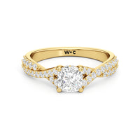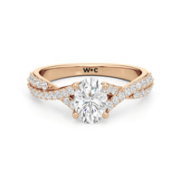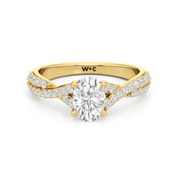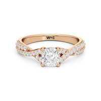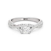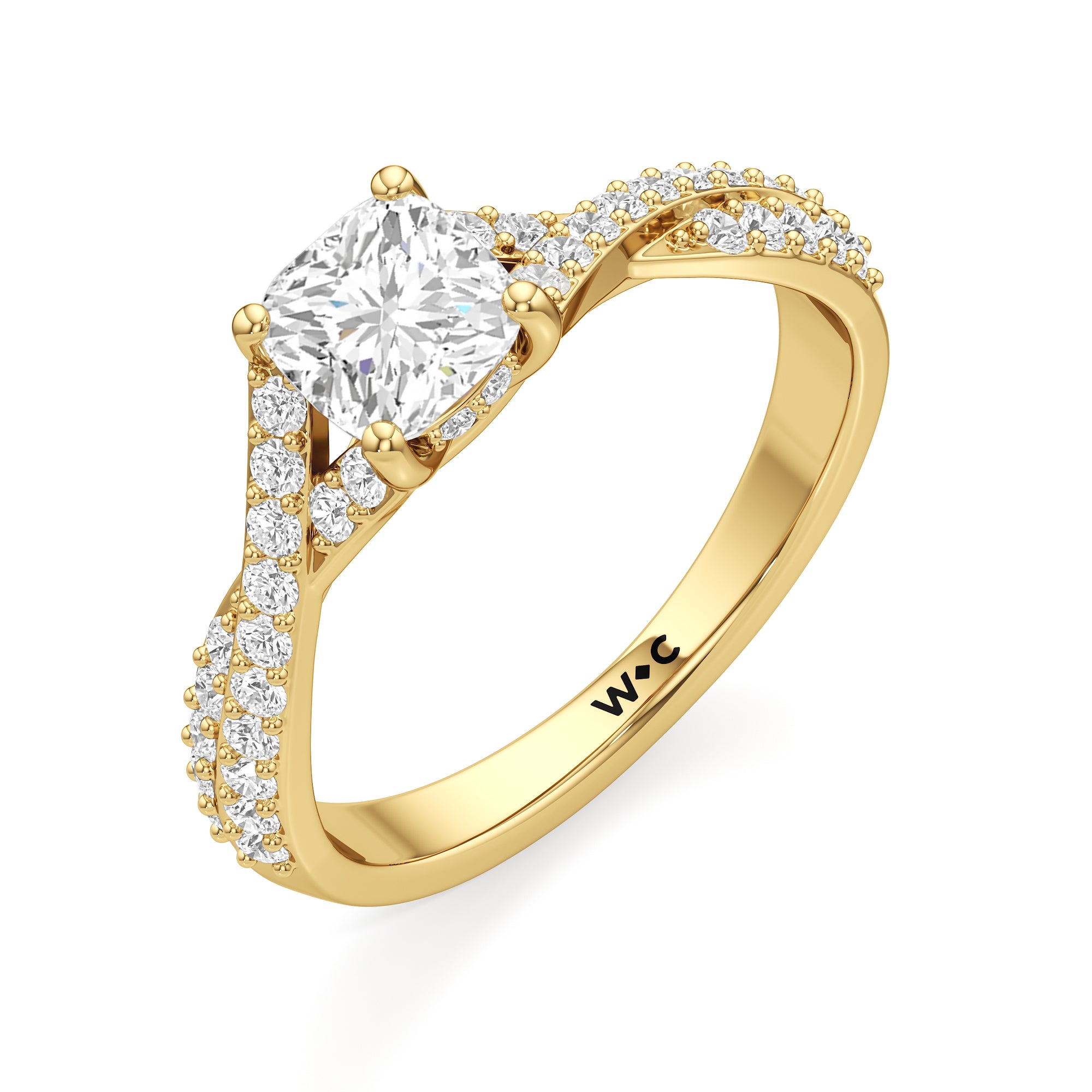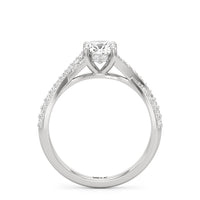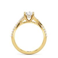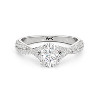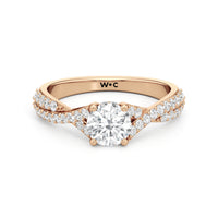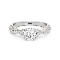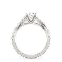 It boasts a round diamond on a brilliant cross-over split band. The shank's split and intertwined shoulders carry 32 diamonds in total, weighing 0.4 carat. A view from the ring's sides will show duos of diamonds punctuating the sides of the central gem, enhancing its radiant beauty. v