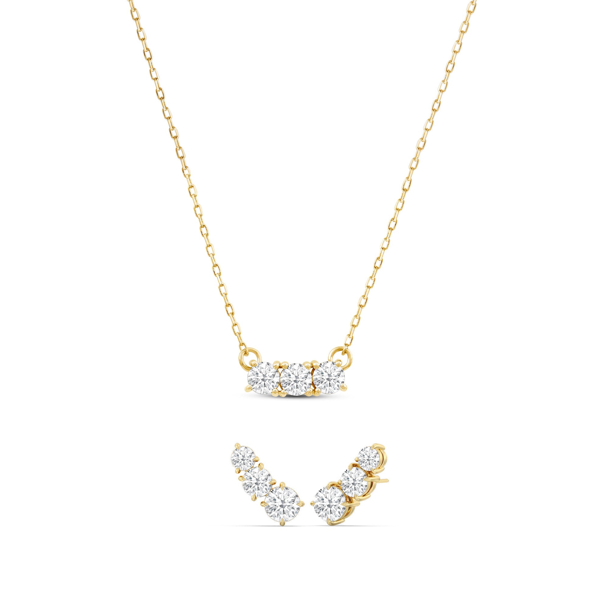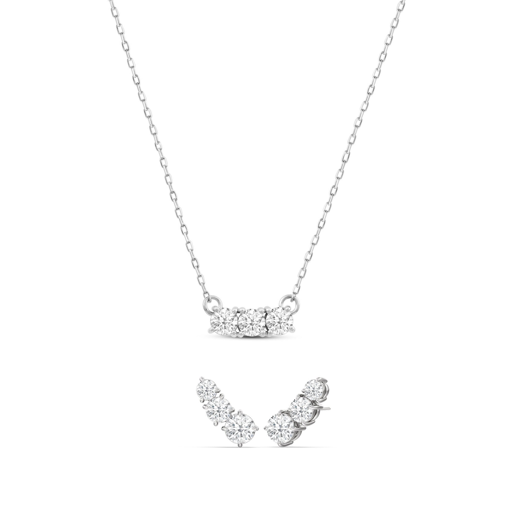 The best things in life comes in threes. The Cluster Set features climber earrings with three diamonds in tapering sizes, set in a slanted orientation, creating an effortless appearance on the ear. The necklace boasts a slightly curved bar of three petite round diamonds that offer a beautiful soft shimmer.