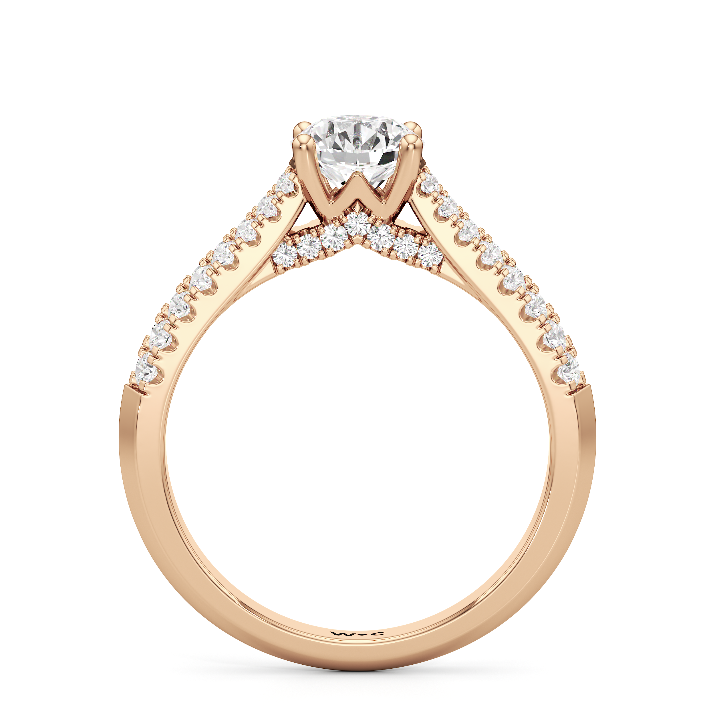 A ring with a sculptural appeal. This betrothal ring showcases a sharp edge protruding from the middle of the band. The angular look is softened by the brilliance of the round diamonds set on the ring's shoulders. Sitting high on the band is a diamond centre held securely by four prongs. A hidden row of diamonds line the stylised bridge, adding depth and sparkle to the ring.