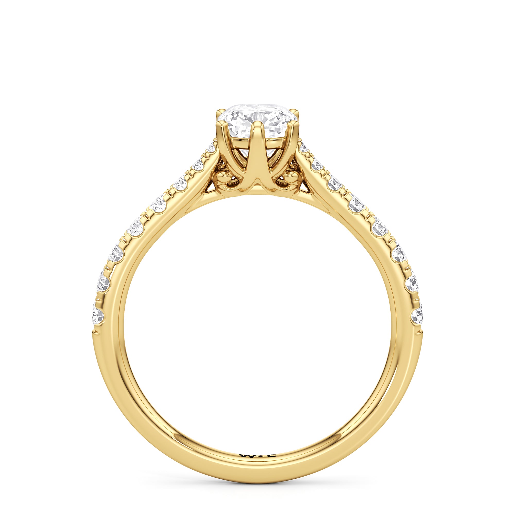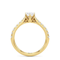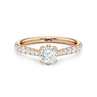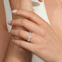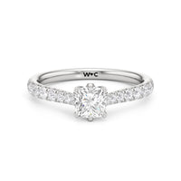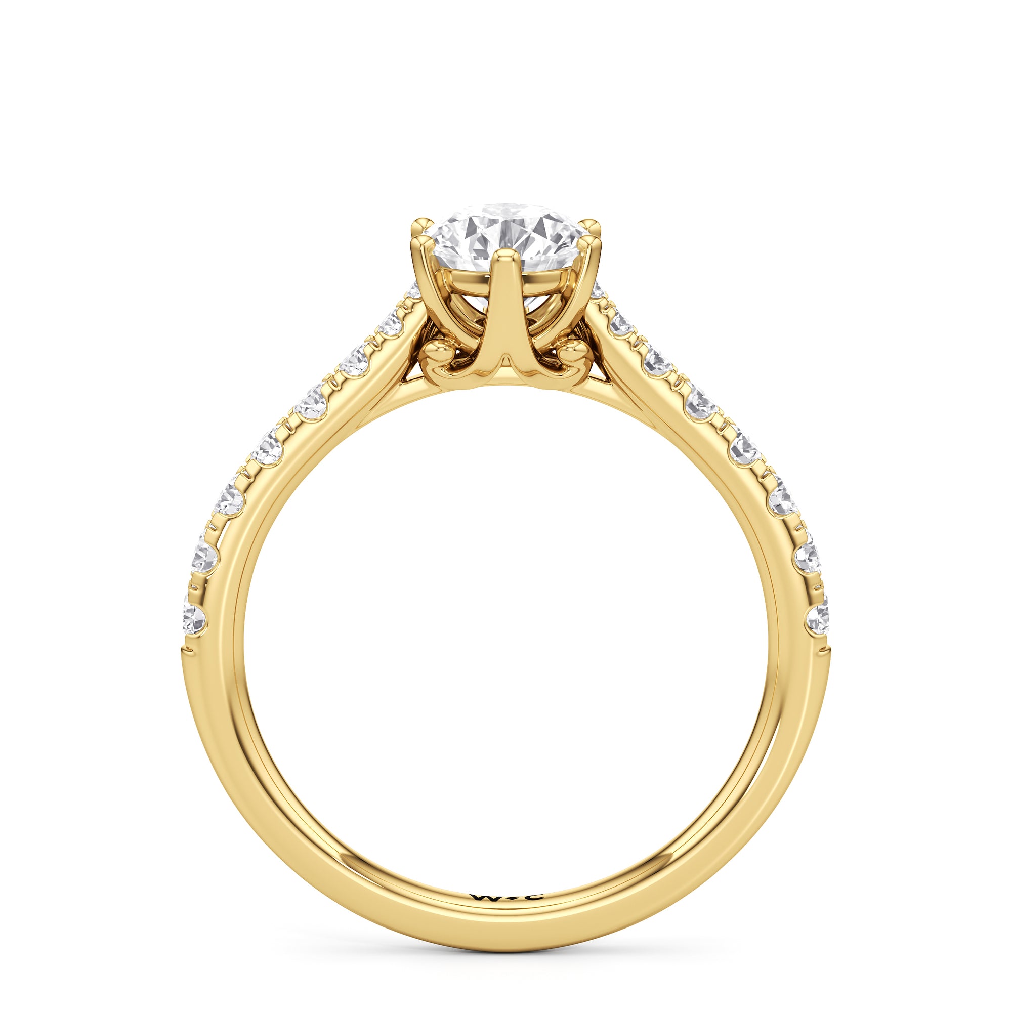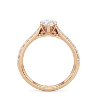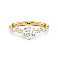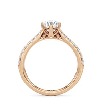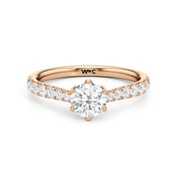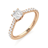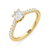 A diamond is securely set upon a stylised six-prong head atop a reverse tapered cathedral shank. Round diamonds that gradually taper in size, following the narrowing width of the shank, flow from the shoulders of the ring. They bring a feminine look to the band while drawing eyes to the precisely cut round diamond centre stone.