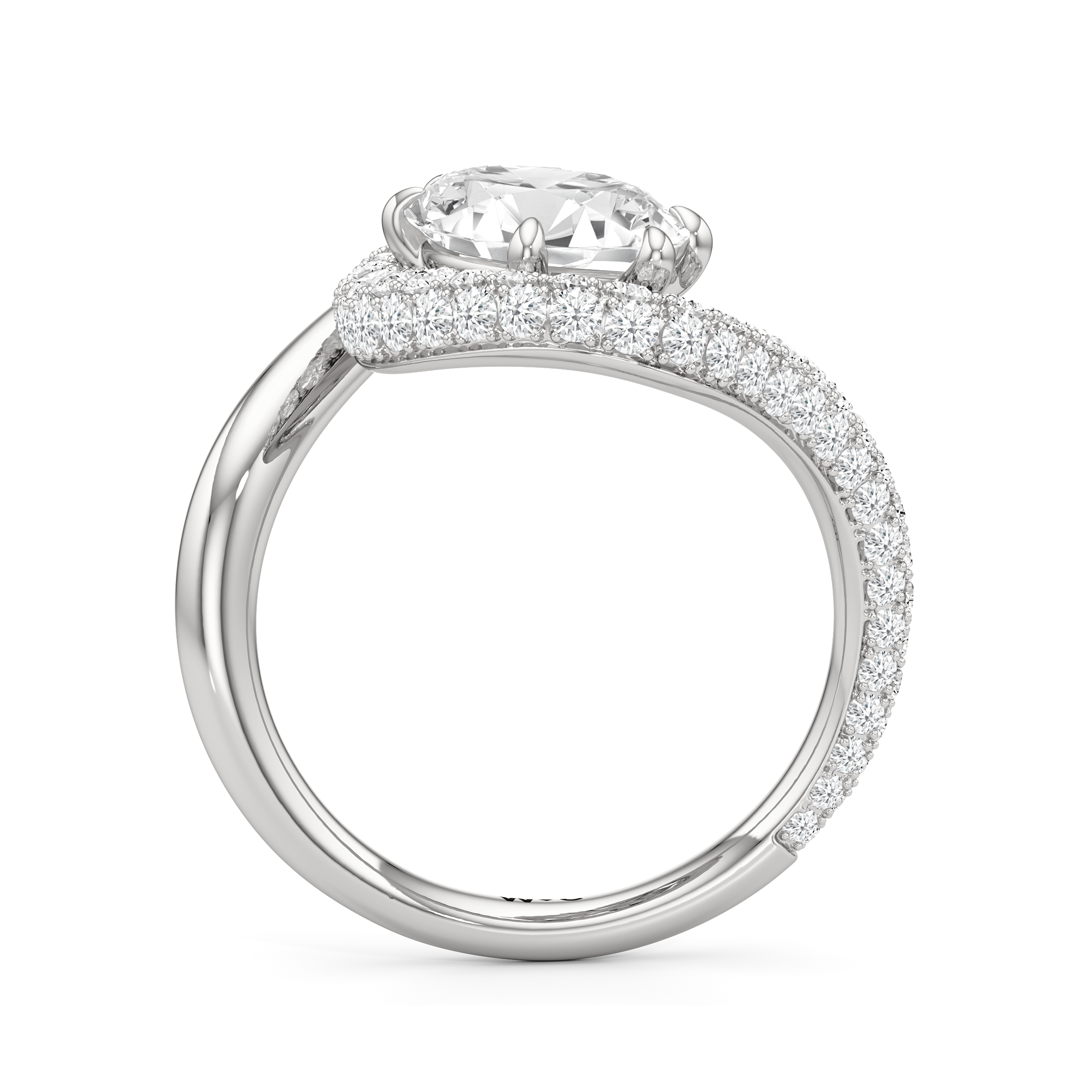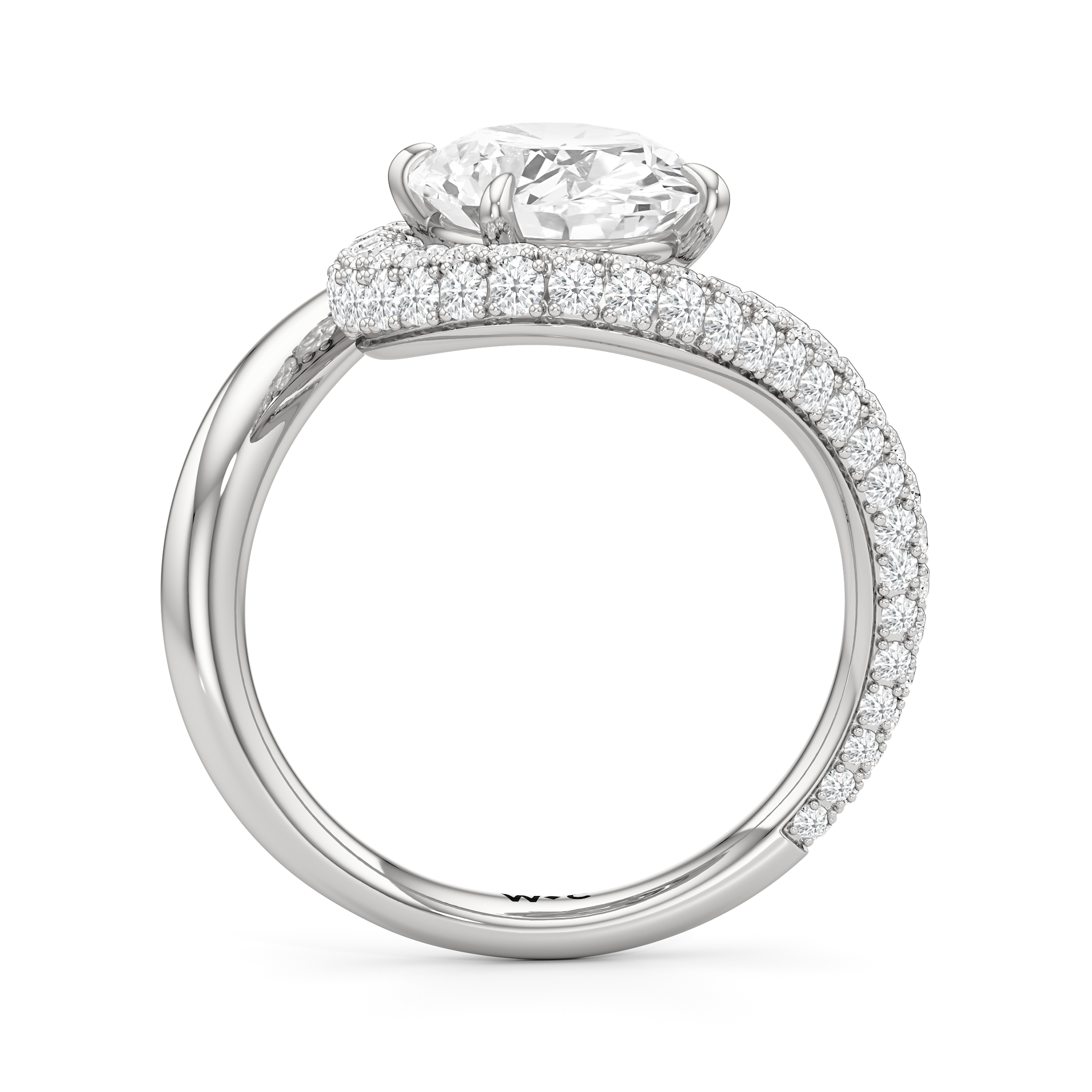 Serene yet striking. The wavy contours of this ring create a graceful rhythm, mirroring the brilliance and fire of diamonds. Half of the undulating band is studded with diamonds, guiding the eye toward the pear-shaped centerpiece.