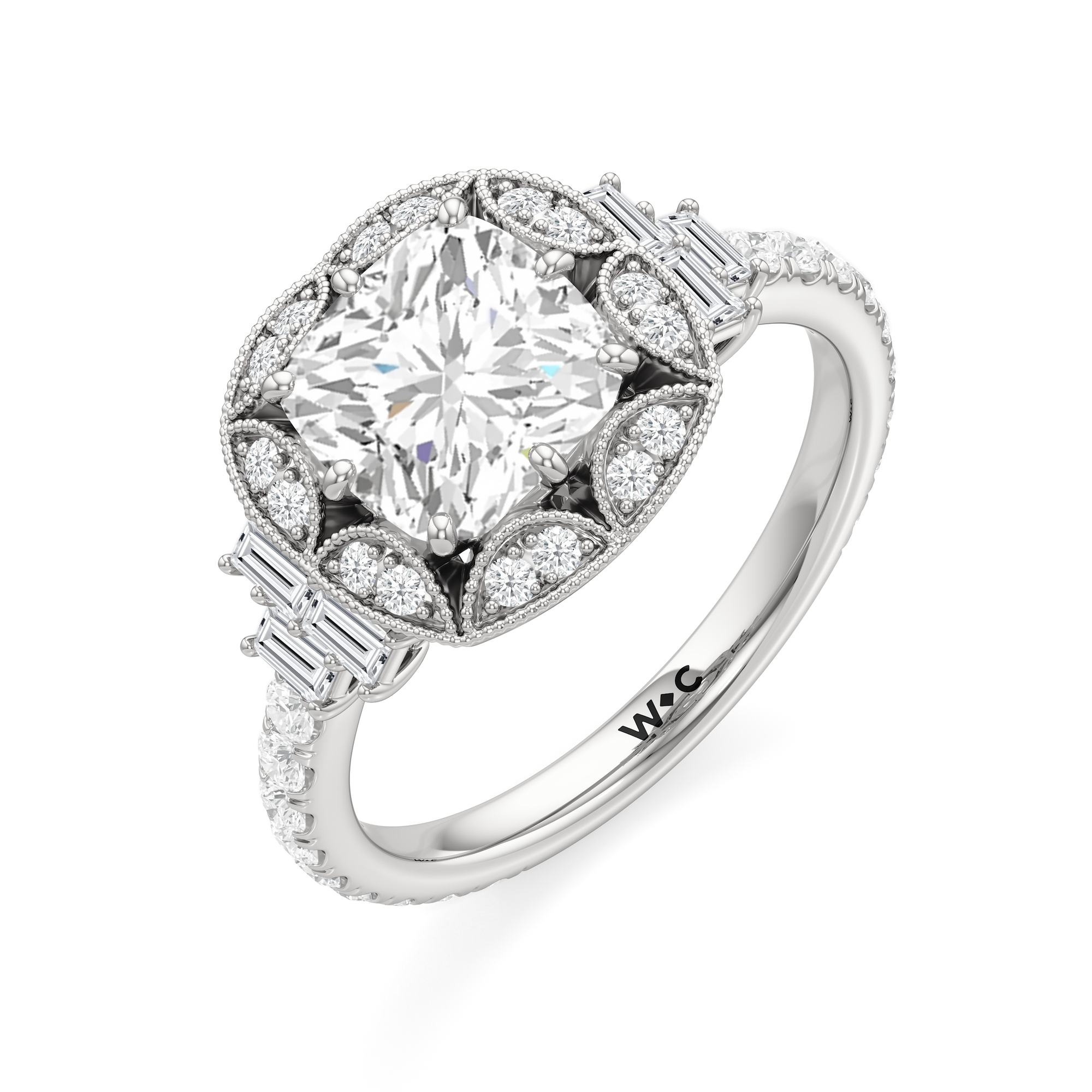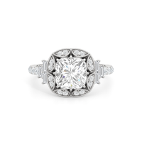 Just as the Art Deco crown of the Chrysler Building stands out boldly above Manhattan’s crowded skyline, the Crown Ring attracts the eye with its distinctive design. It captures the vivid spirit of the building’s iconic arched steelwork, with its striking scalloped pattern surrounding the cushion-cut diamond center stone. With trios of baguette diamonds serving as side stones and round diamonds tracing the band, this bold yet refined ring embodies the timeless glamour of New York and its soaring Art Deco masterpieces.