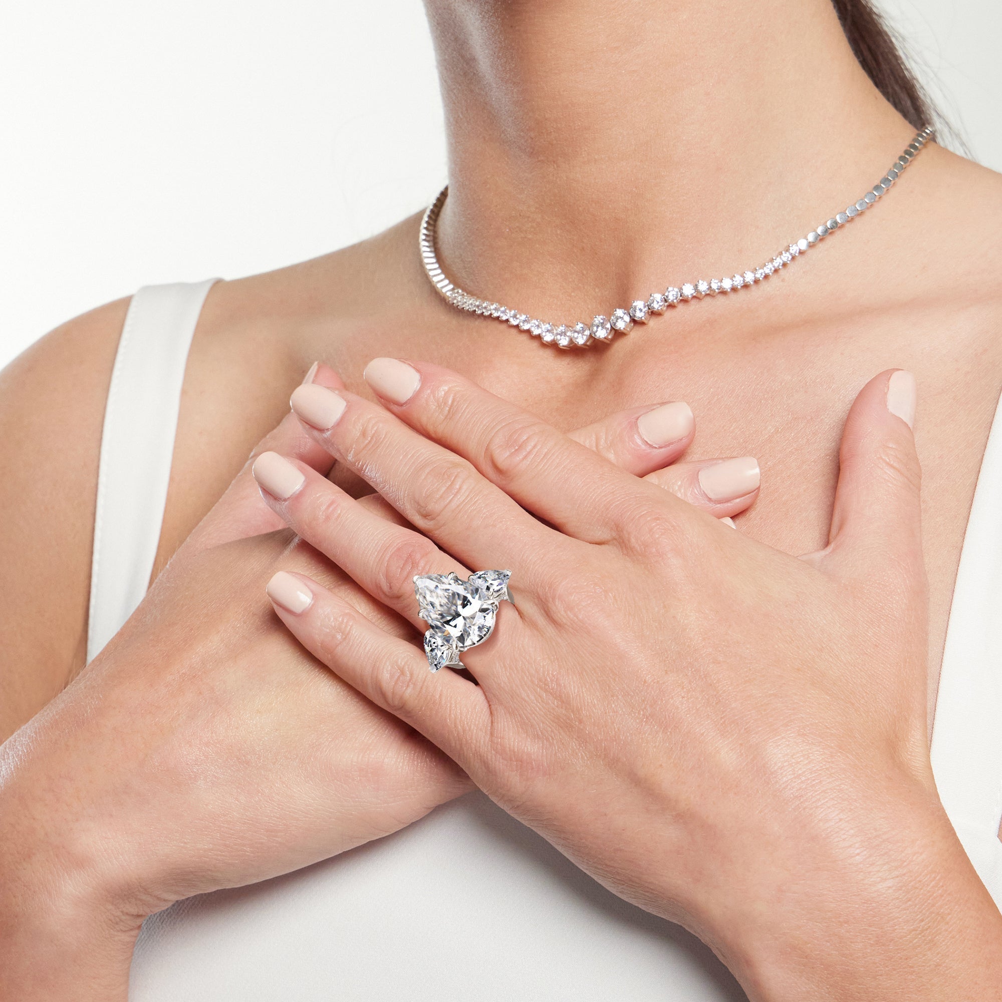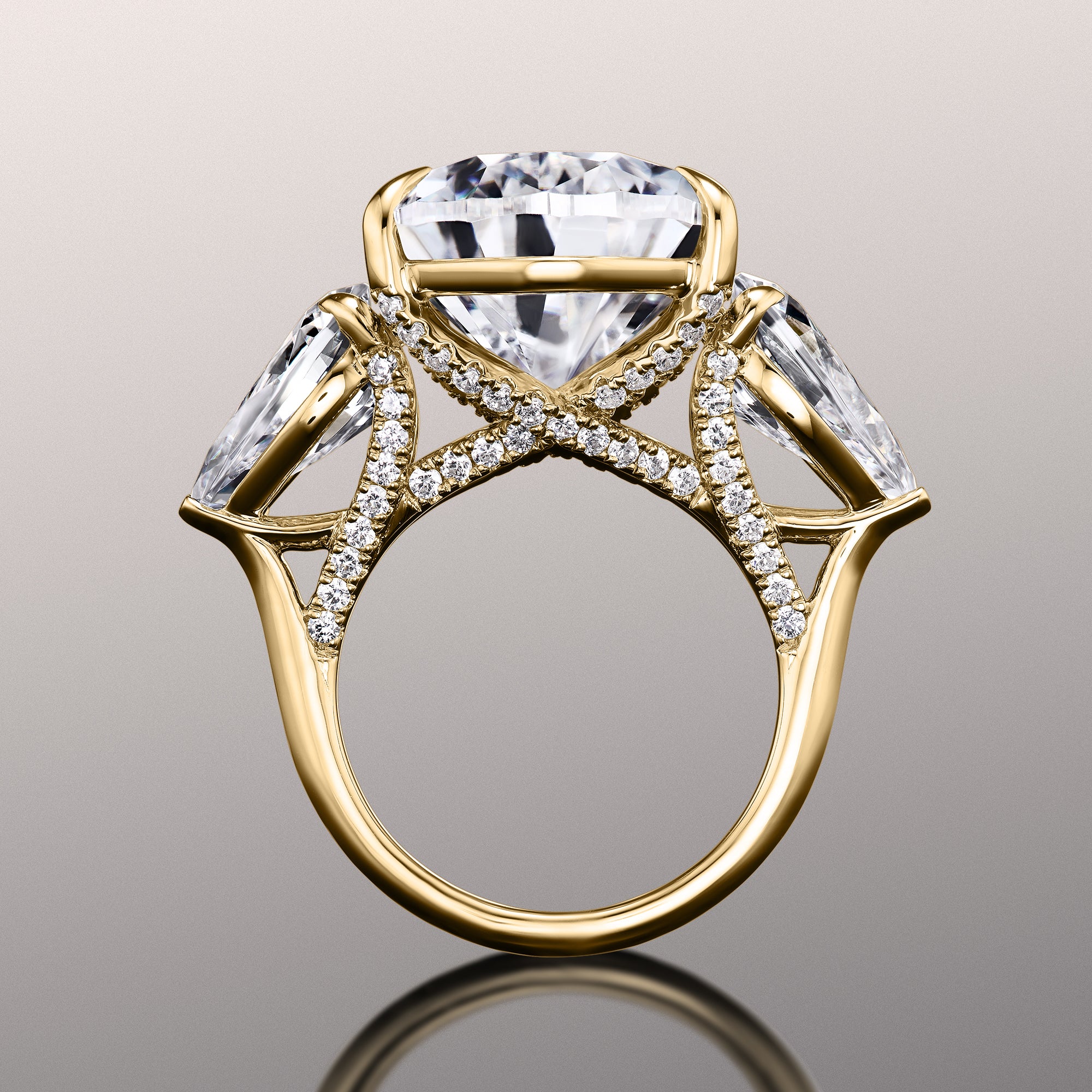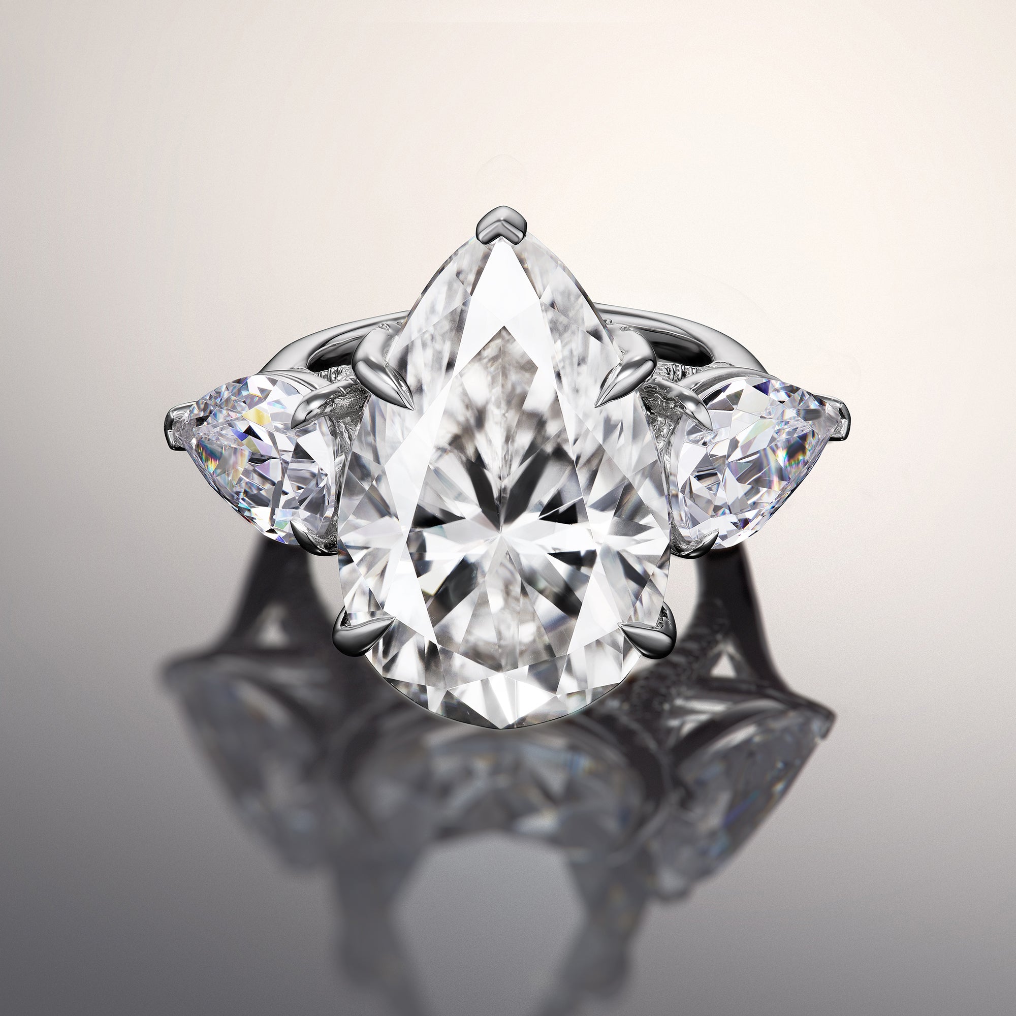 A true masterpiece that is a bright and beautiful symbol of love. Designed with meticulous attention to detail, this iconic ring has a pear diamond center stone that casts its entrancing brilliance atop a polished band with knife-edge style. Two pear diamond side stones flank the prominent central gem for an enviable glow. Each of the three main stones rests on a prong setting with a diamond-encrusted trellis gallery, earning admiration from anyone who sees it.