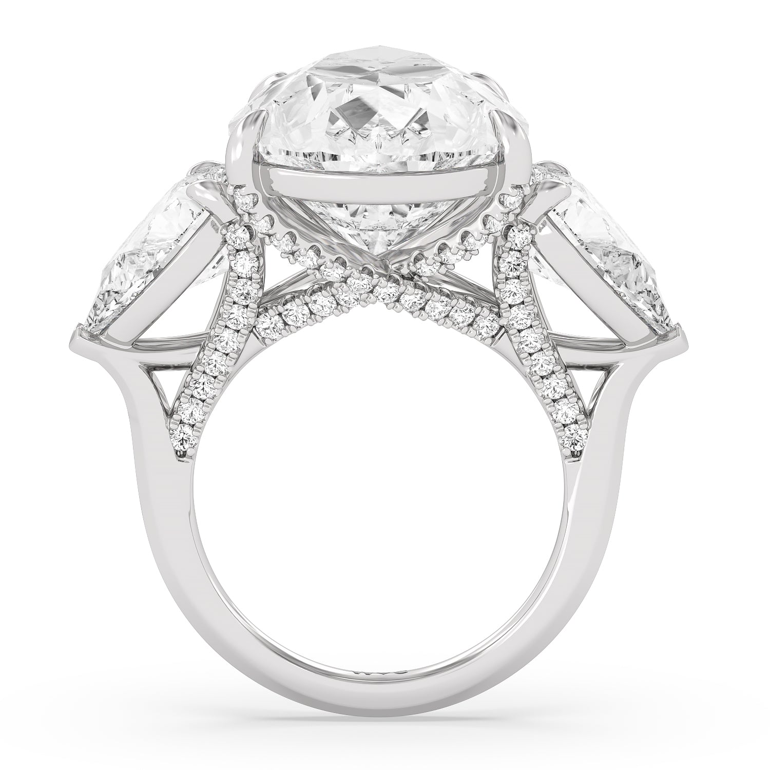 A true masterpiece, the da Vinci ring is a bright and beautiful symbol of love designed with meticulous attention to detail. It has a 15.0 ct pear diamond center stone that casts its entrancing brilliance atop a polished band with knife-edge style. Two 2.0 ct pear diamond side stones flank the prominent central gem for an enviable glow. Each of the three main stones rests on a prong setting with a diamond-encrusted trellis gallery.