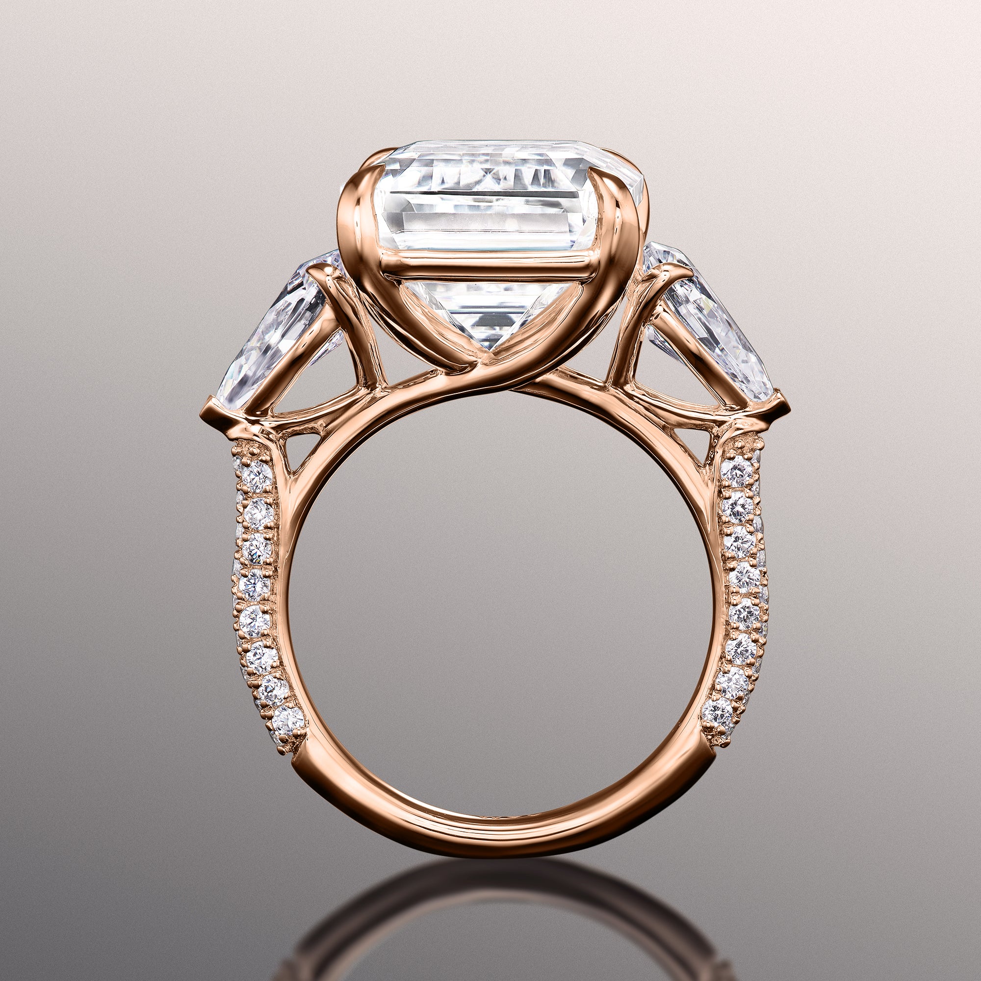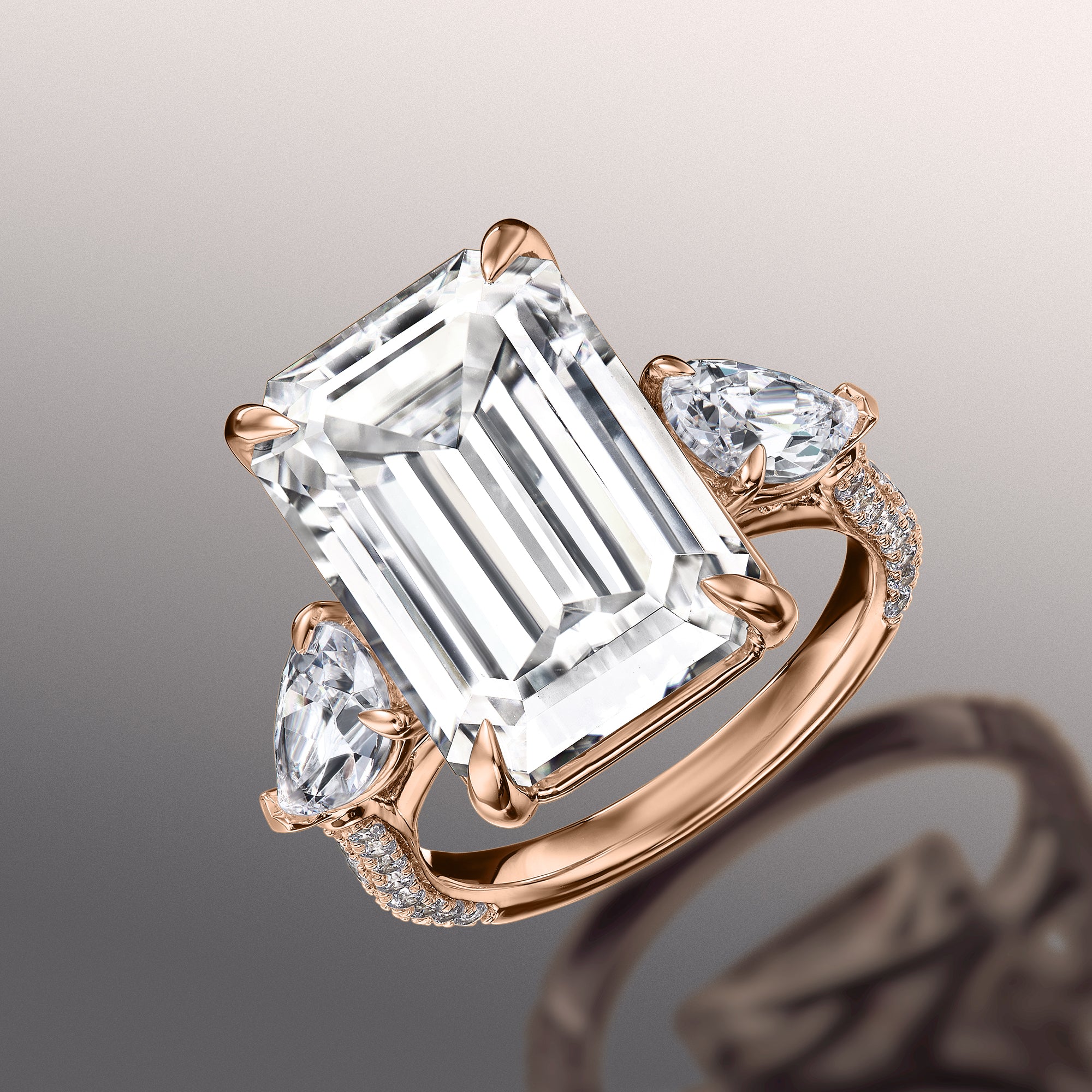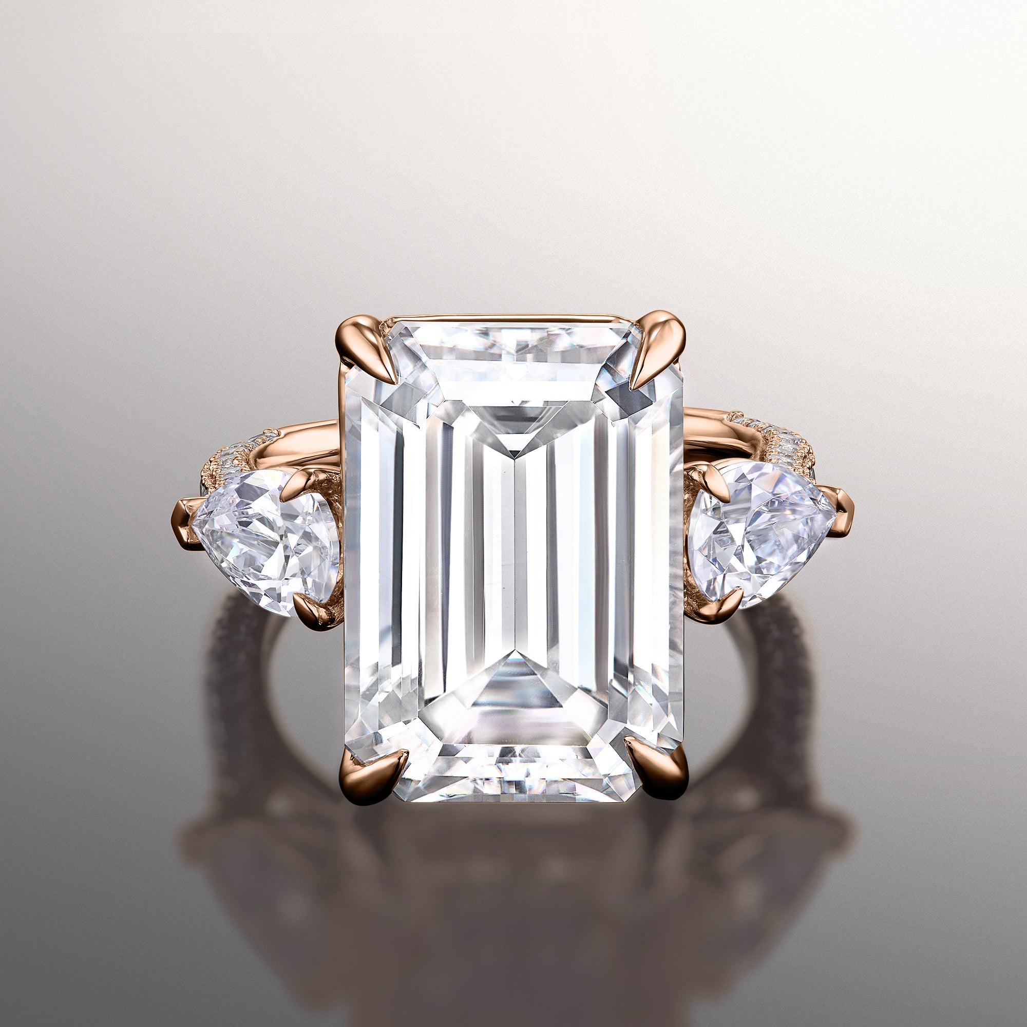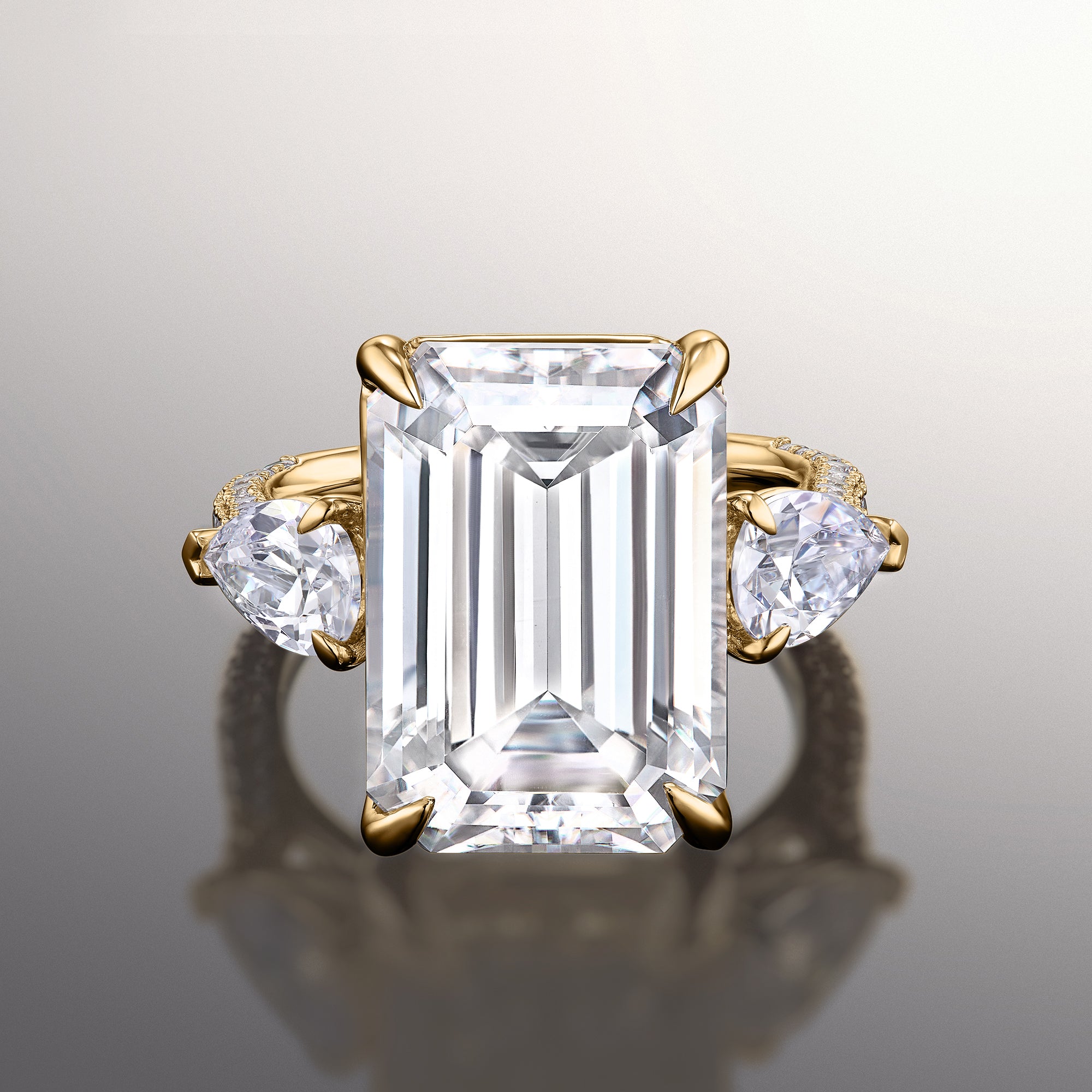 Known for its glittering salute to yesterday, today, and tomorrow, this three-stone ring boasts a dominant emerald-cut diamond center stone set in between pear diamonds. The main stone is secured by cross-over prongs for added style. For added brilliance, the band's shoulders are fully covered with rows of round diamonds that all create a meaningful token of your promise and commitment.