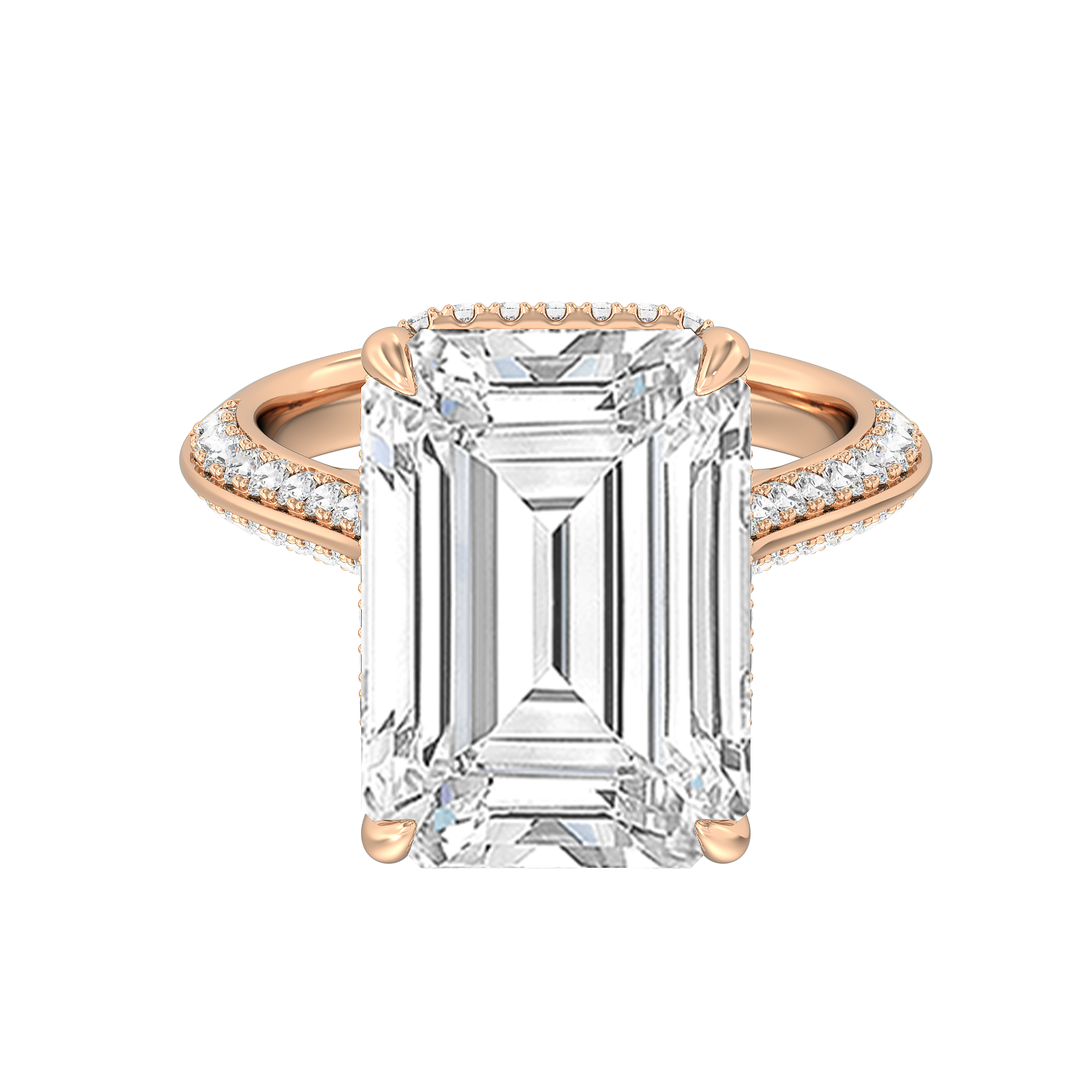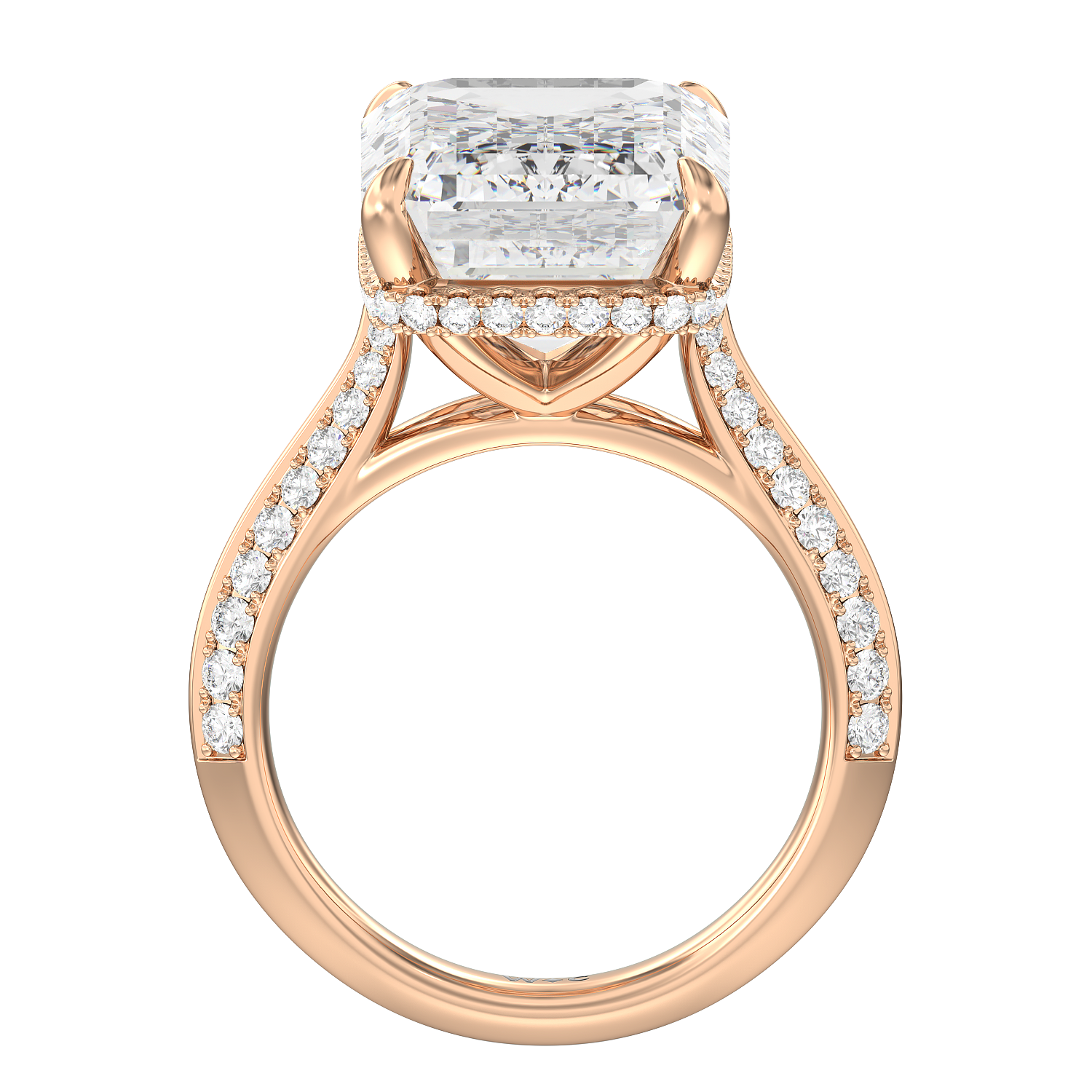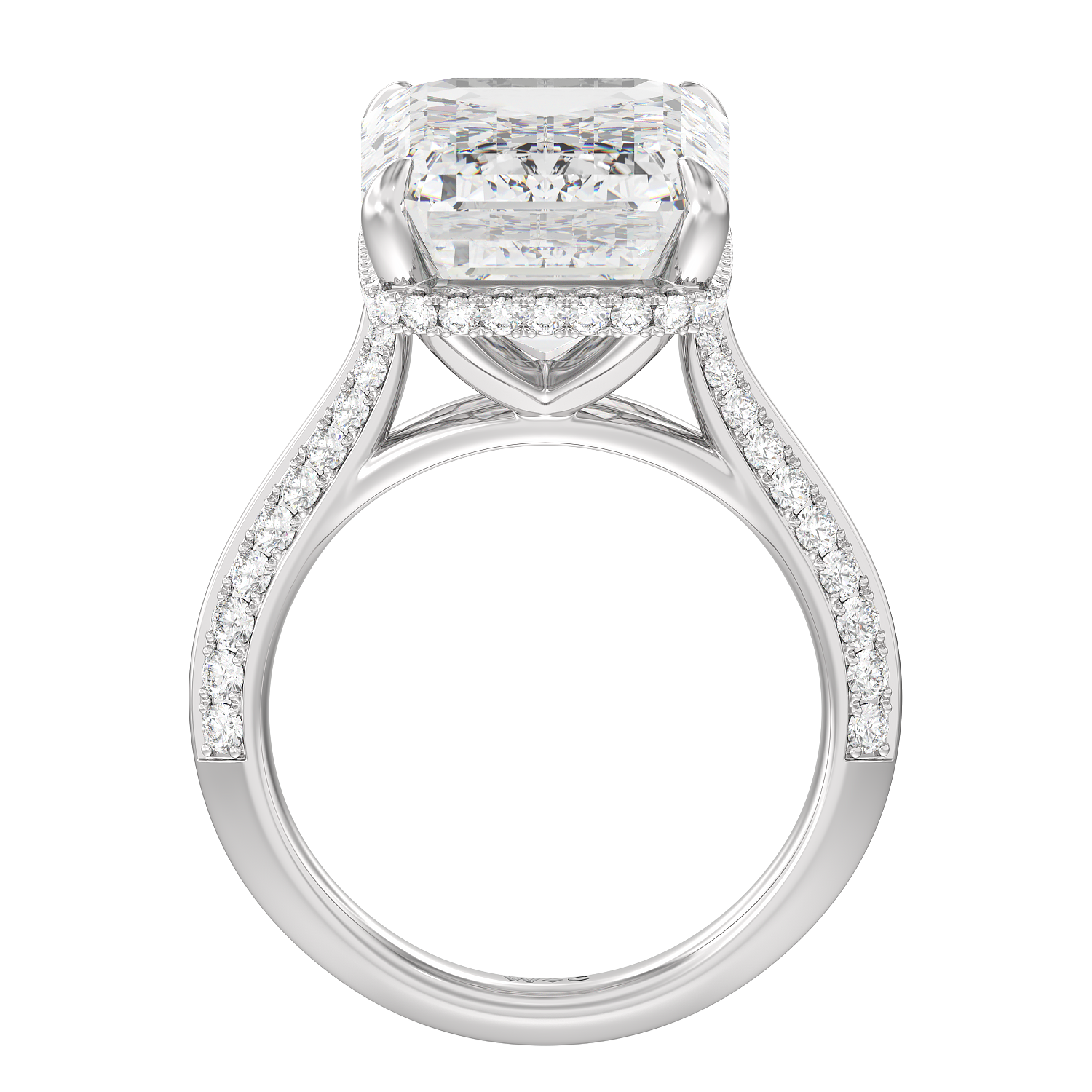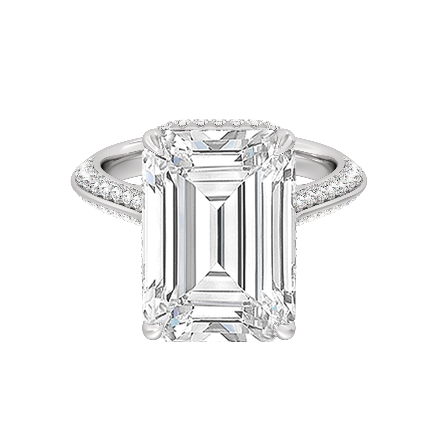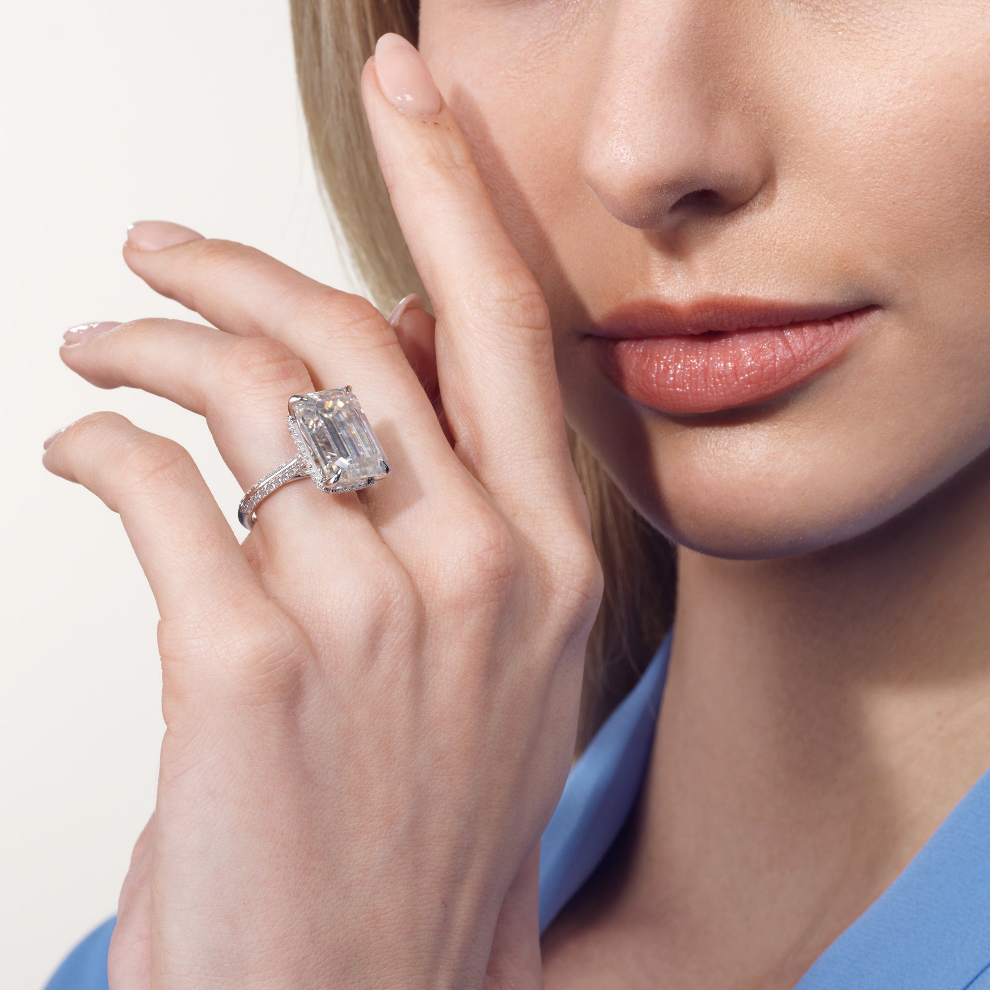 Impossible to ignore, the Dalí ring demonstrates remarkable elegance. It features a central emerald-cut diamond weighing 15 carats, cradled by four prongs and embraced by a glistening hidden halo. The centerpiece is supported by the tapering shoulders of a knife-edged cathedral shank encrusted with pavé-set round diamonds.
