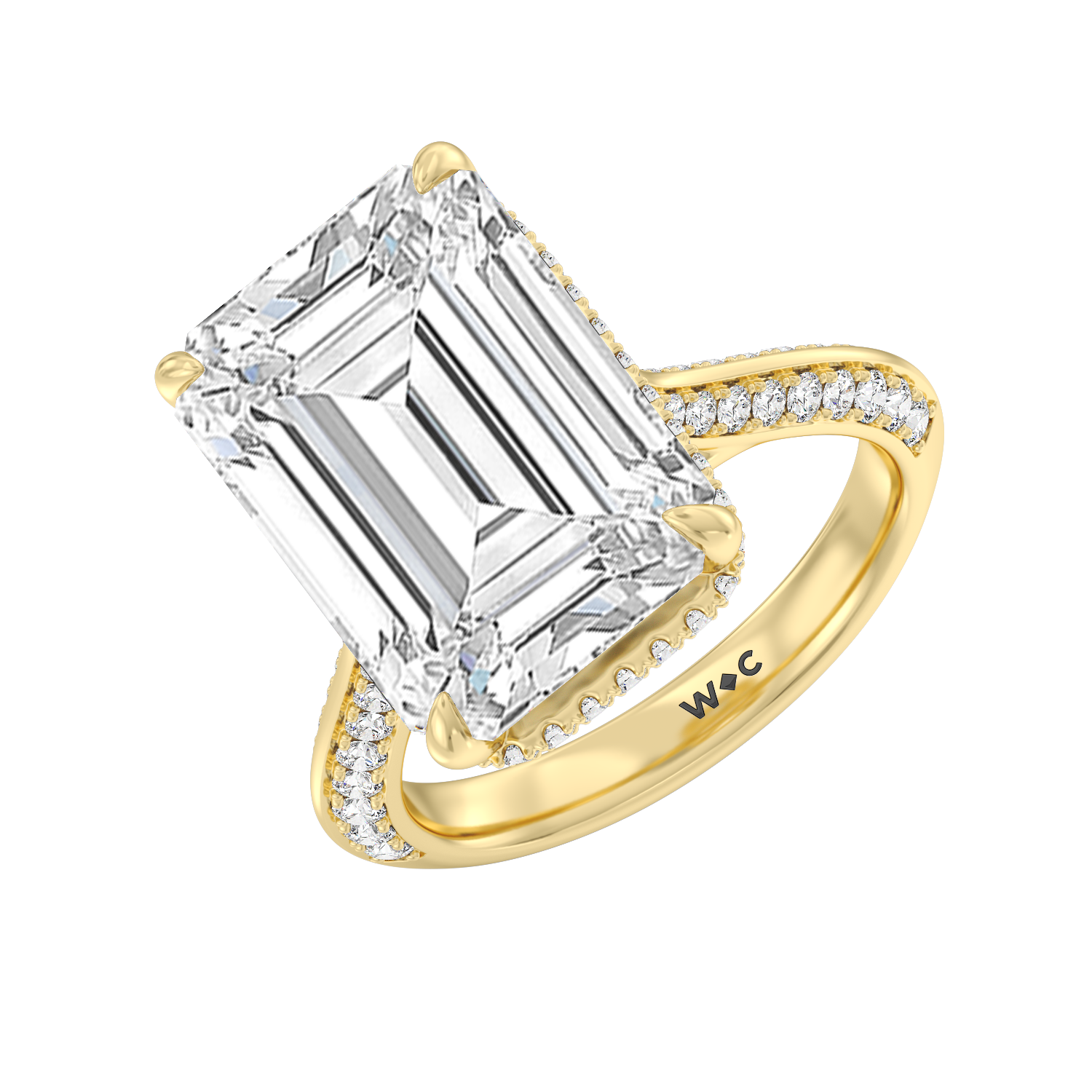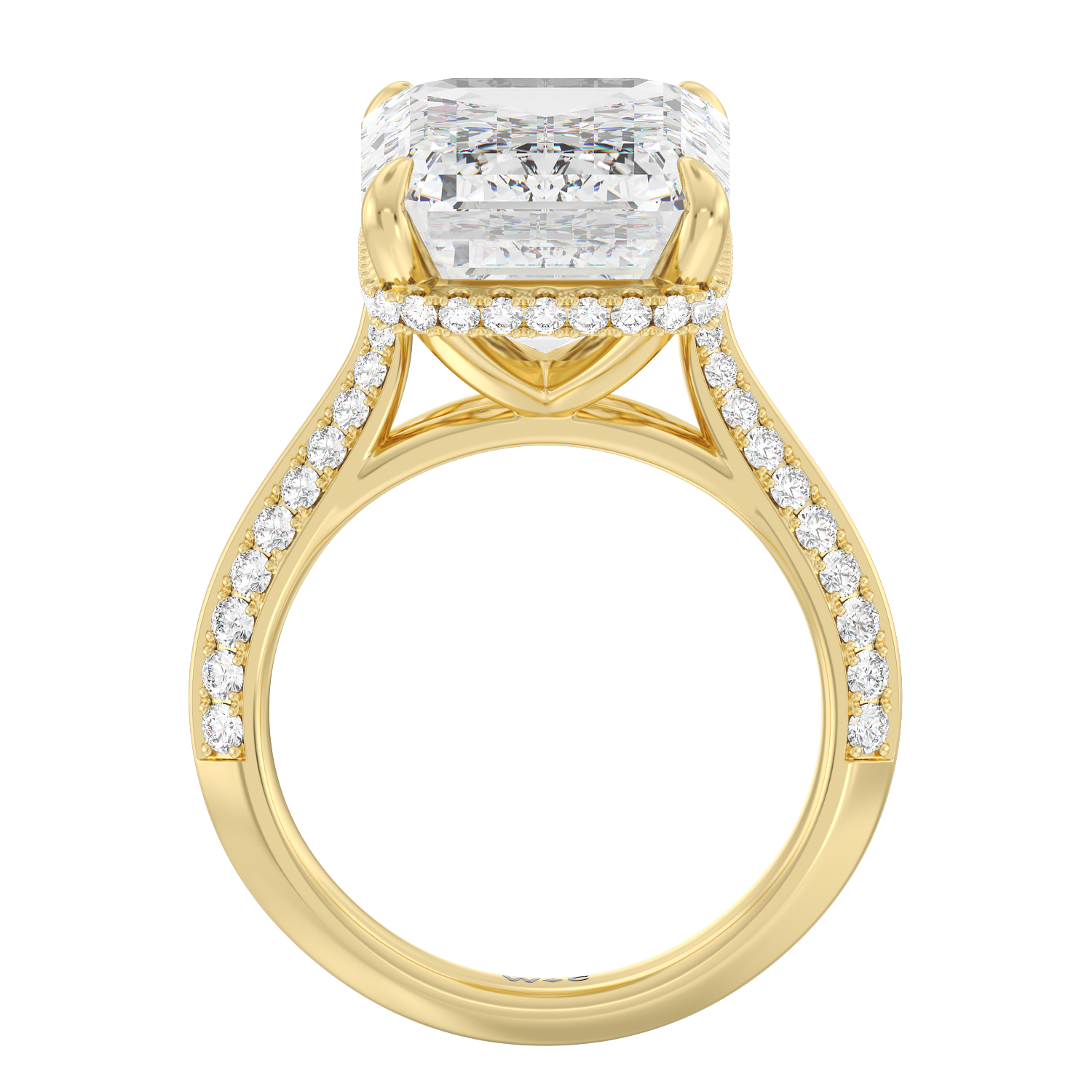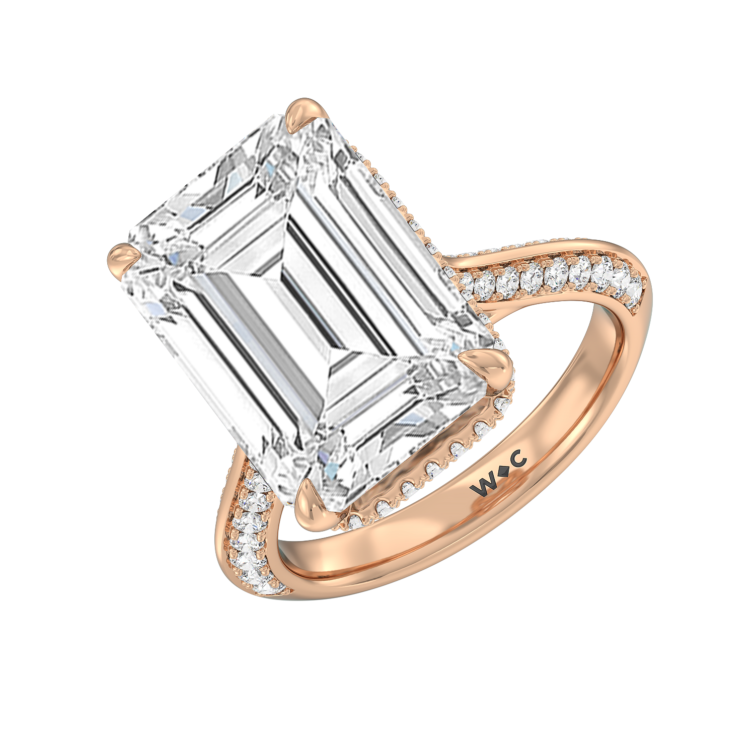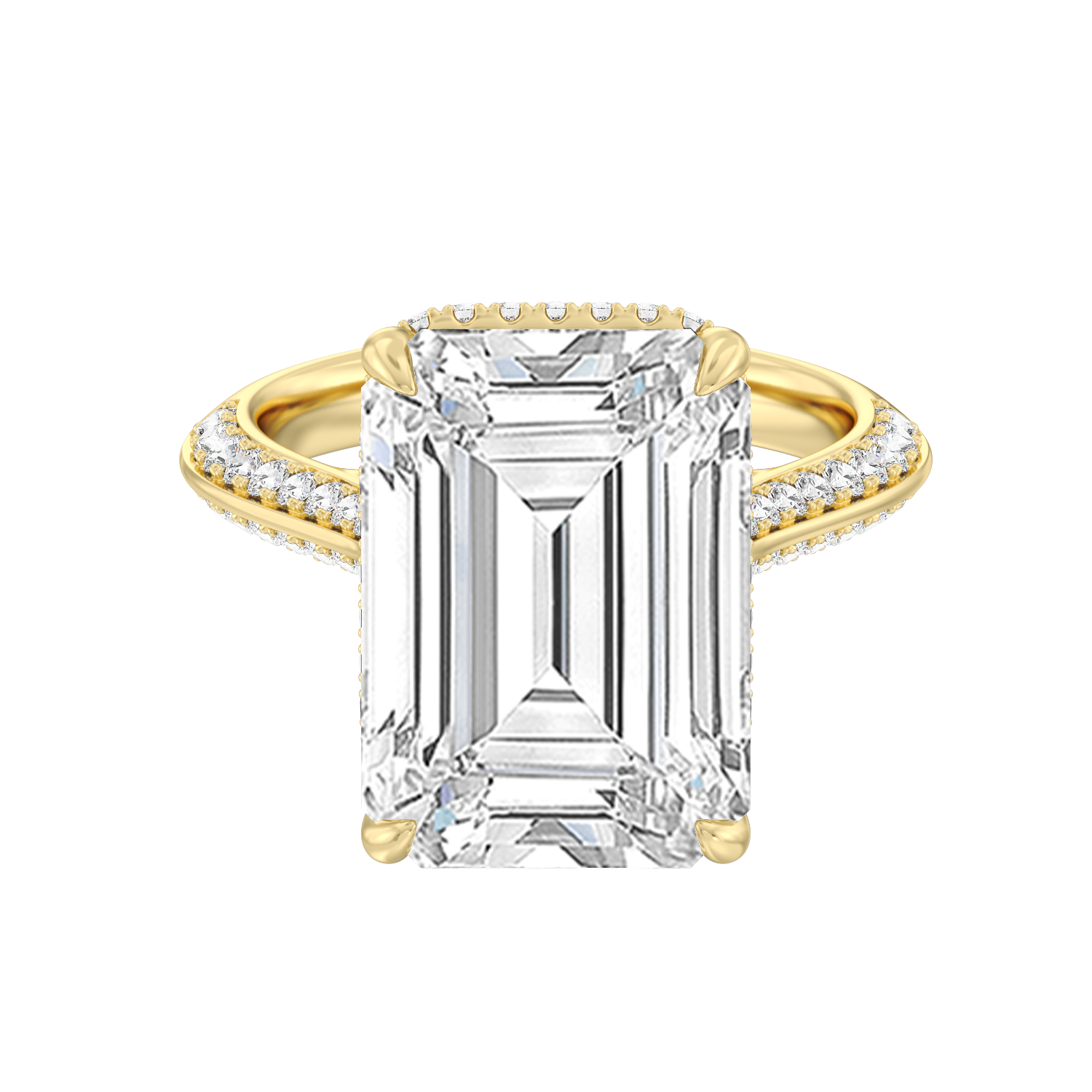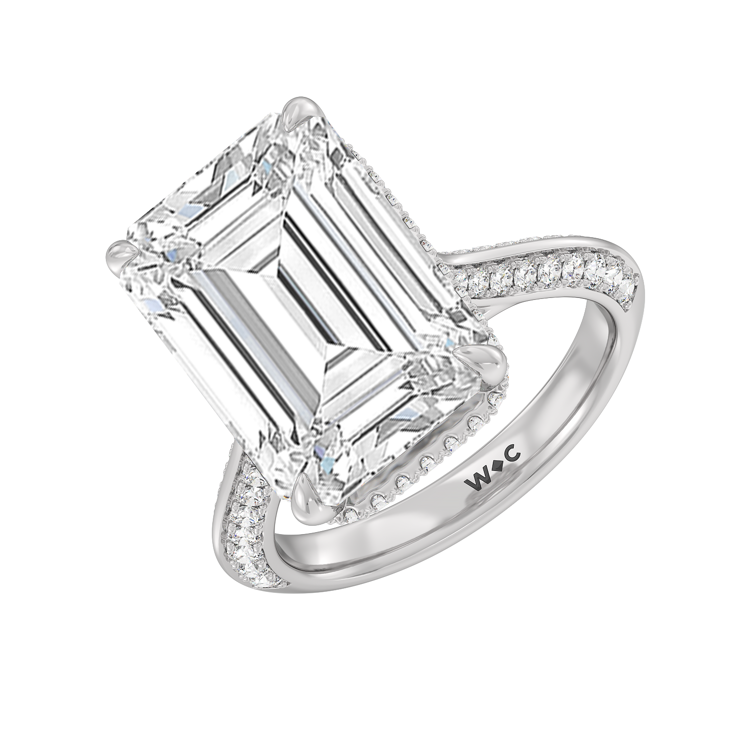 Impossible to ignore, the Dalí ring demonstrates remarkable elegance. It features a central emerald-cut diamond weighing 15 carats, cradled by four prongs and embraced by a glistening hidden halo. The centerpiece is supported by the tapering shoulders of a knife-edged cathedral shank encrusted with pavé-set round diamonds.