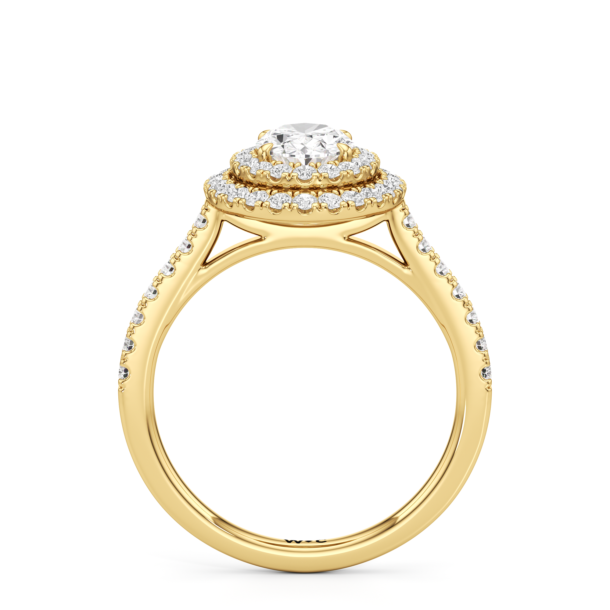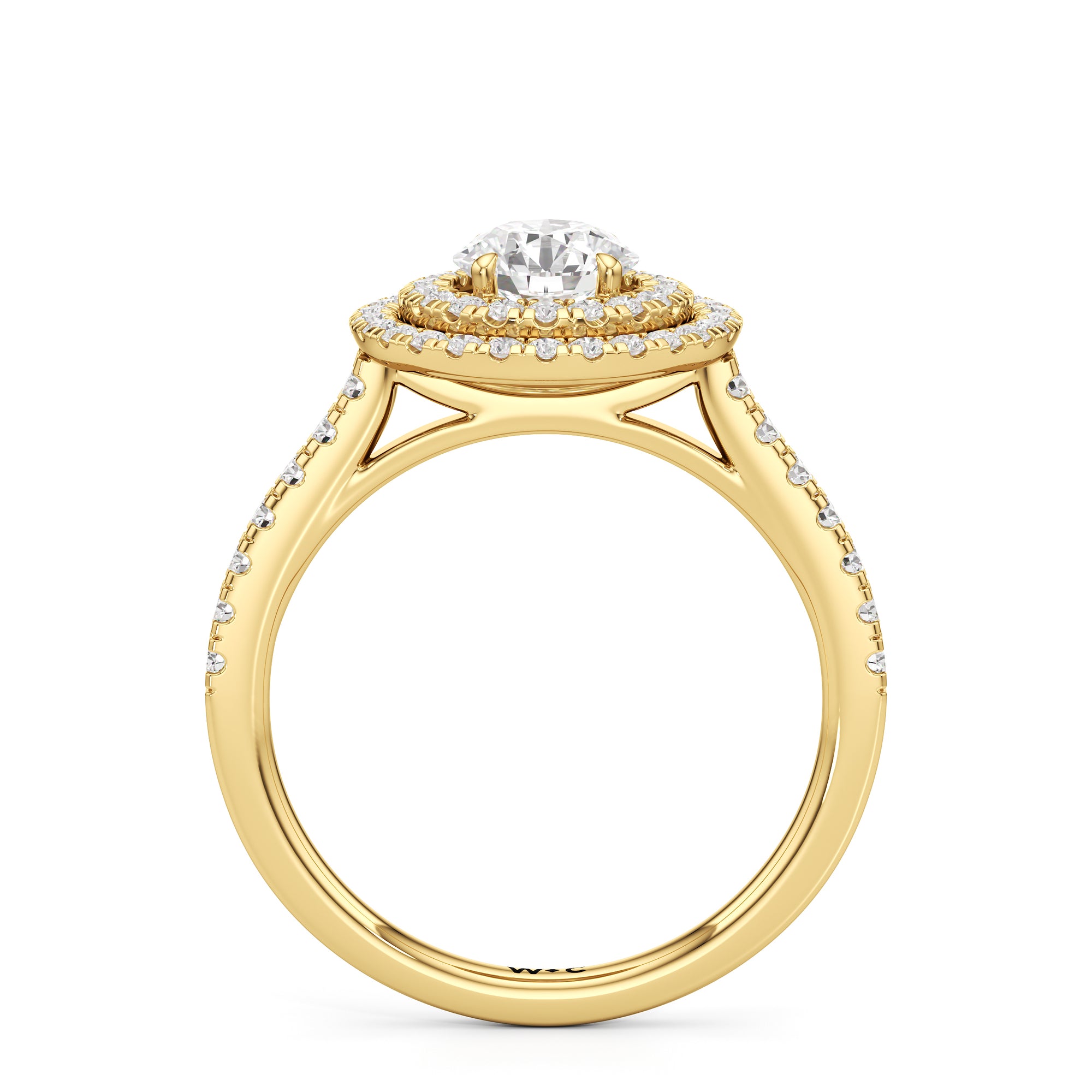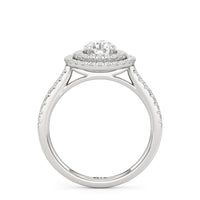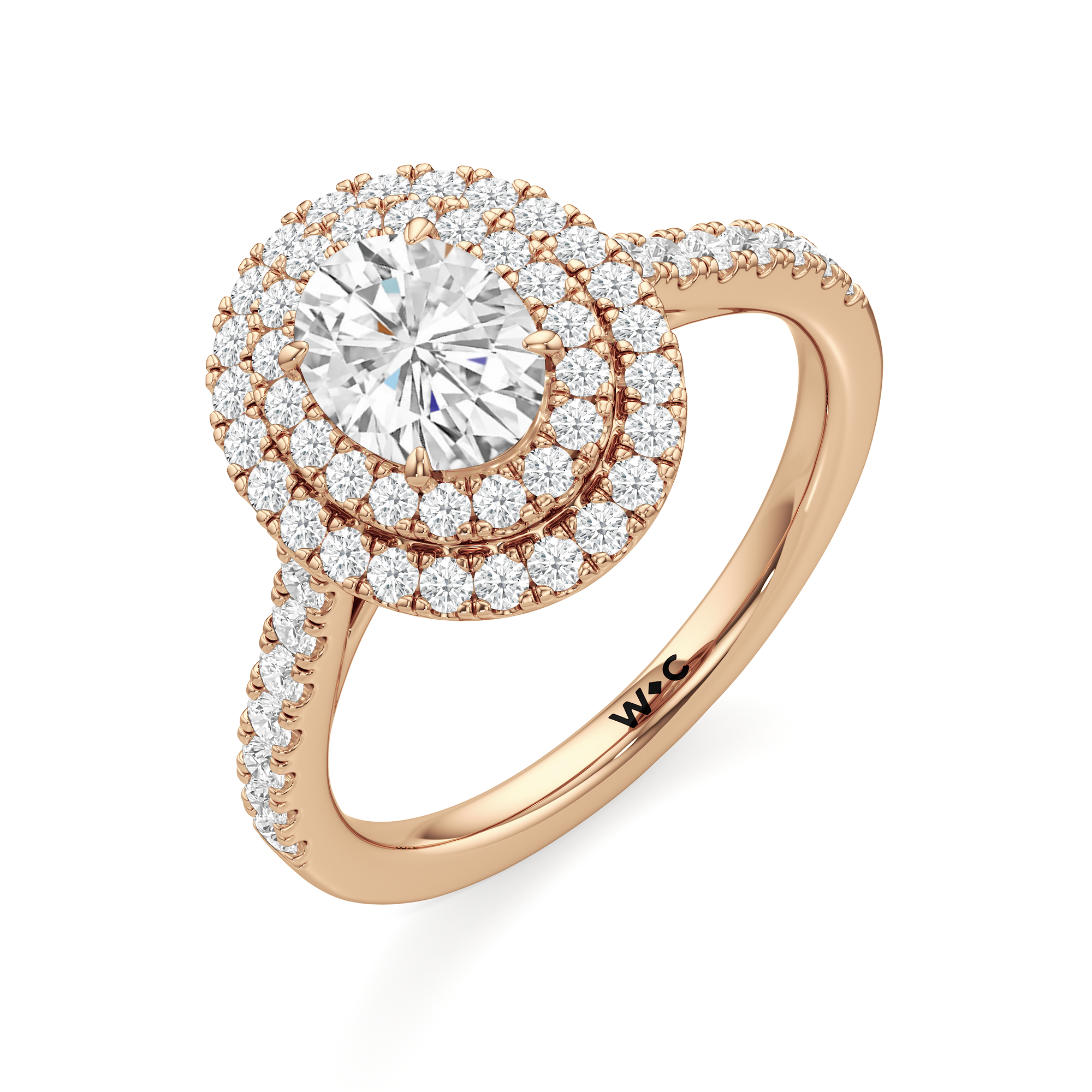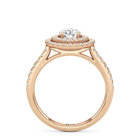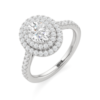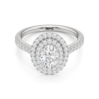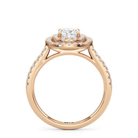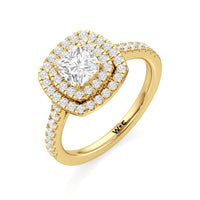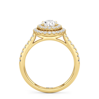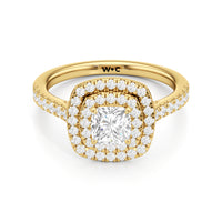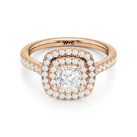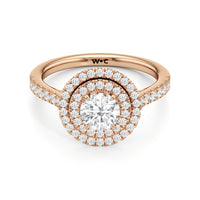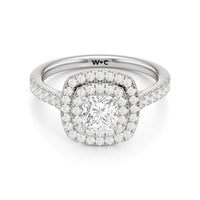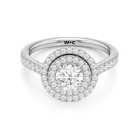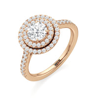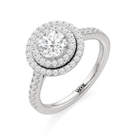 Introducing the Danielle Engagement Ring, a symbol of love displaying dramatic scintillation. The cathedral shank supports and raises a centre diamond surrounded by a majestic double halo. More round diamonds cascade down the two arches of the band.