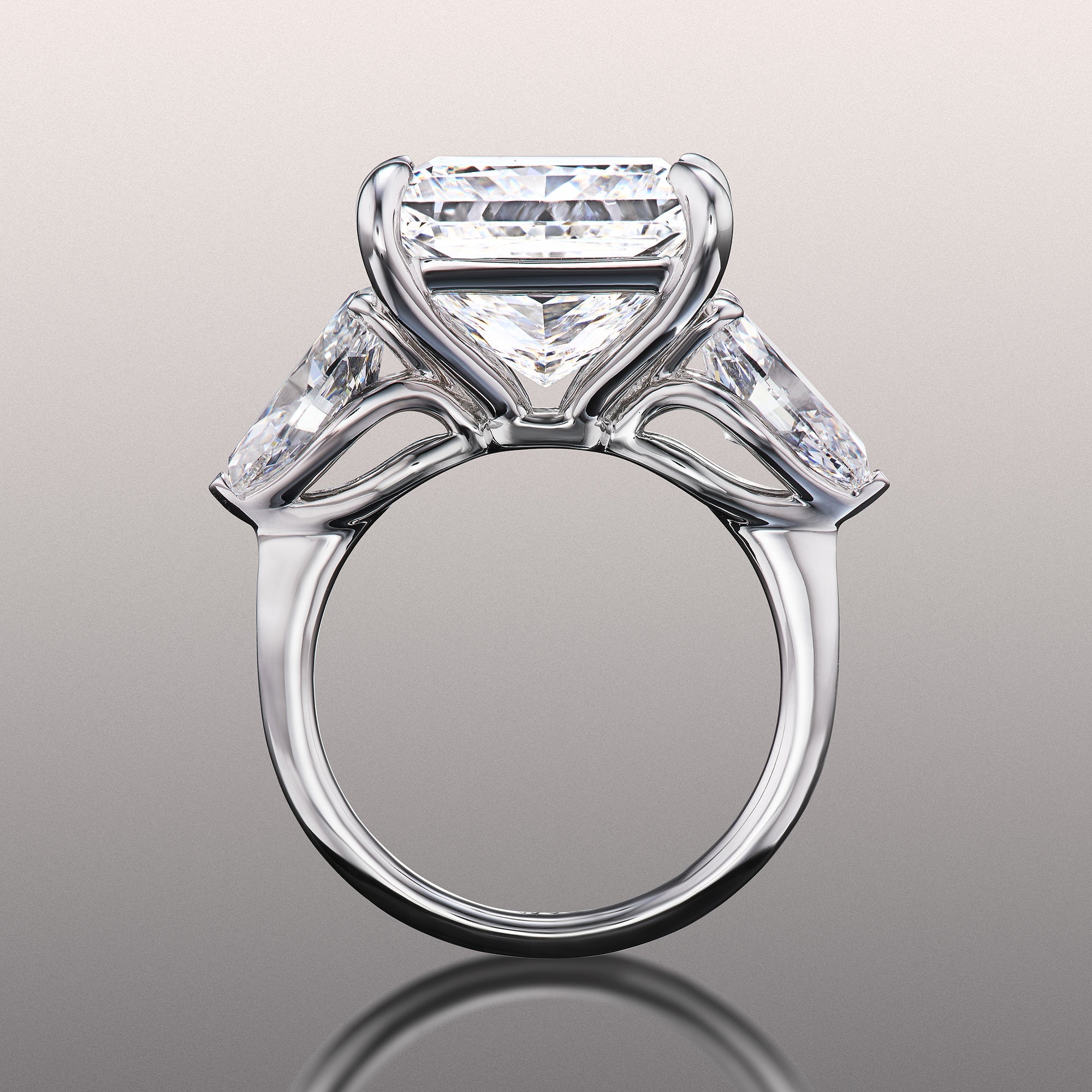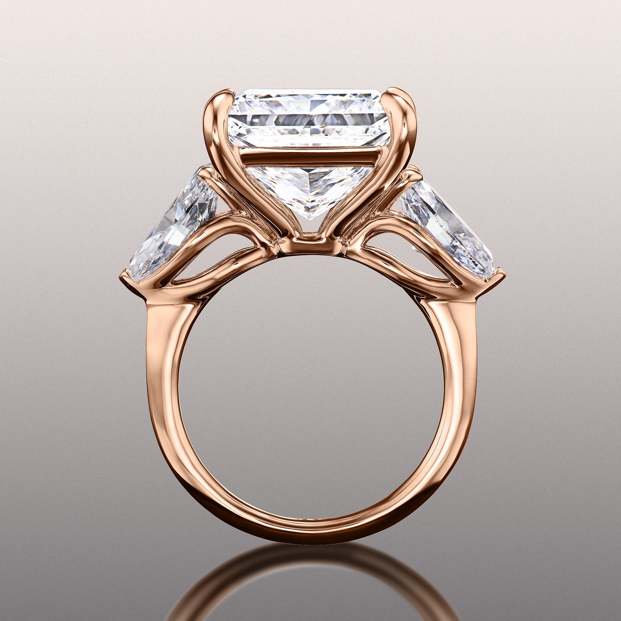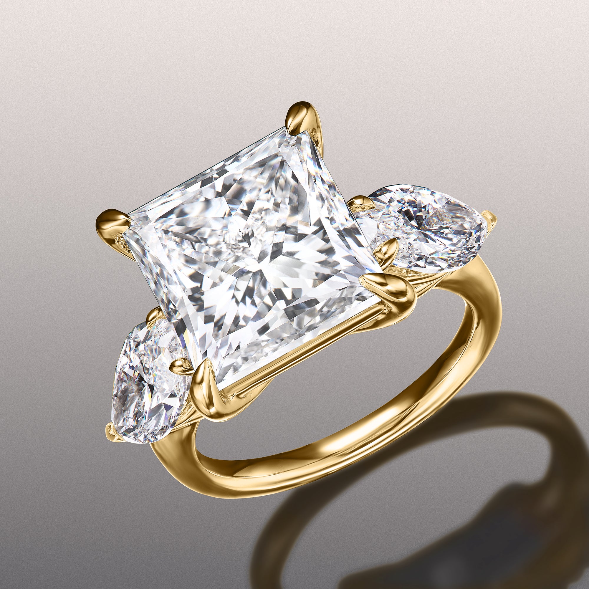 Delve into romantic and feminine craftsmanship that makes an enchanting declaration of love and devotion. This luxurious three-stone ring boasts a marvelous pear diamond center stone flanked by two sleek marquise diamonds. The beguiling central gem sits on a five-claw-prong setting, while the marquise diamonds rest on a three-prong setting lifted from the band's bridge by a lotus-inspired open gallery.