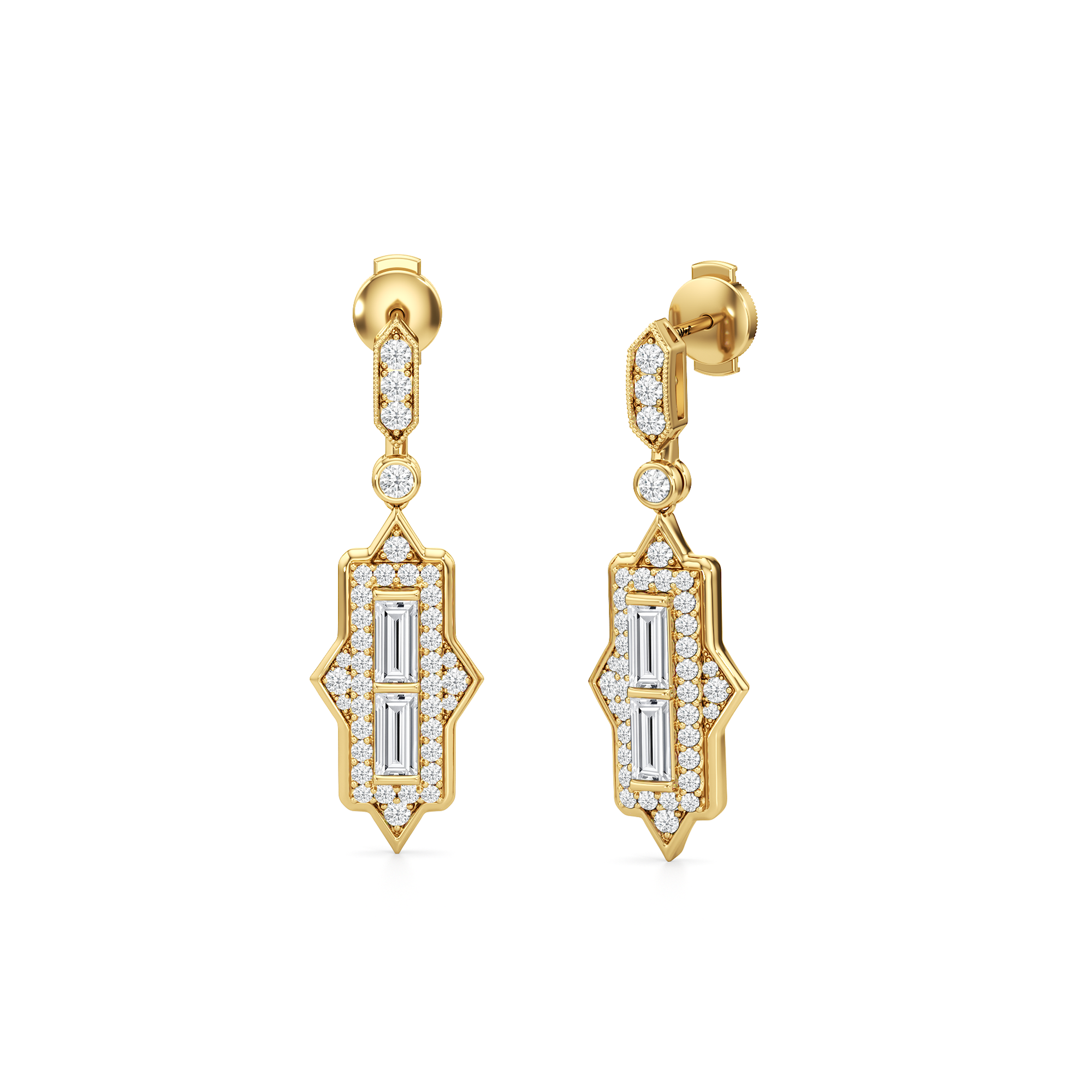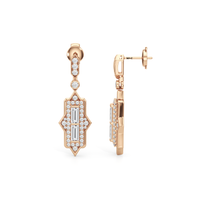 delanoReflecting the graceful bends and angles of the Delano South Beach Hotel’s winged tower, these diamond dangler earrings embody the same structured yet elegant design. A duo of baguette diamonds in north-south orientation takes center stage, mirroring the sleek, architectural lines of the Art Deco skyscraper designed by Robert Swartburg. The two step-cut stones are surrounded by prong-set round diamonds set on a geometric frame with fine milgrain details. Both the base and the dangling part of these earrings capture the sharp and angular beauty of the structure along with its intricate craftsmanship. Together, they showcase a design that feels both timeless and fresh, with a touch of vintage elegance.
