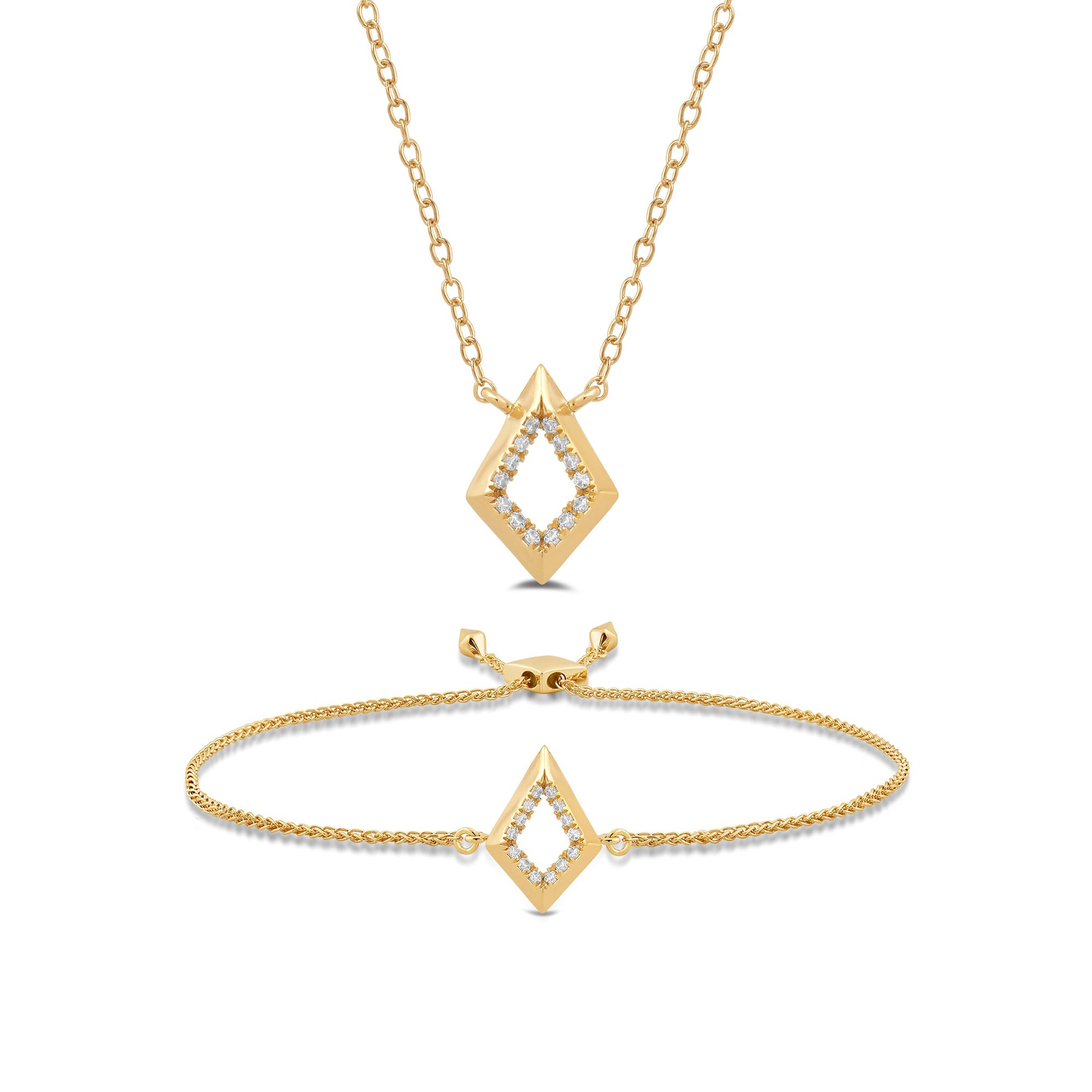 Thoughtful and unique, the Diamond Set is enhanced in unique charm. The set includes a necklace and a bolo bracelet, each detailed with an open-worked diamond motif adorned with petite diamonds on the inner edges. The adjustable bolo bracelets make it a versatile, everyday design.