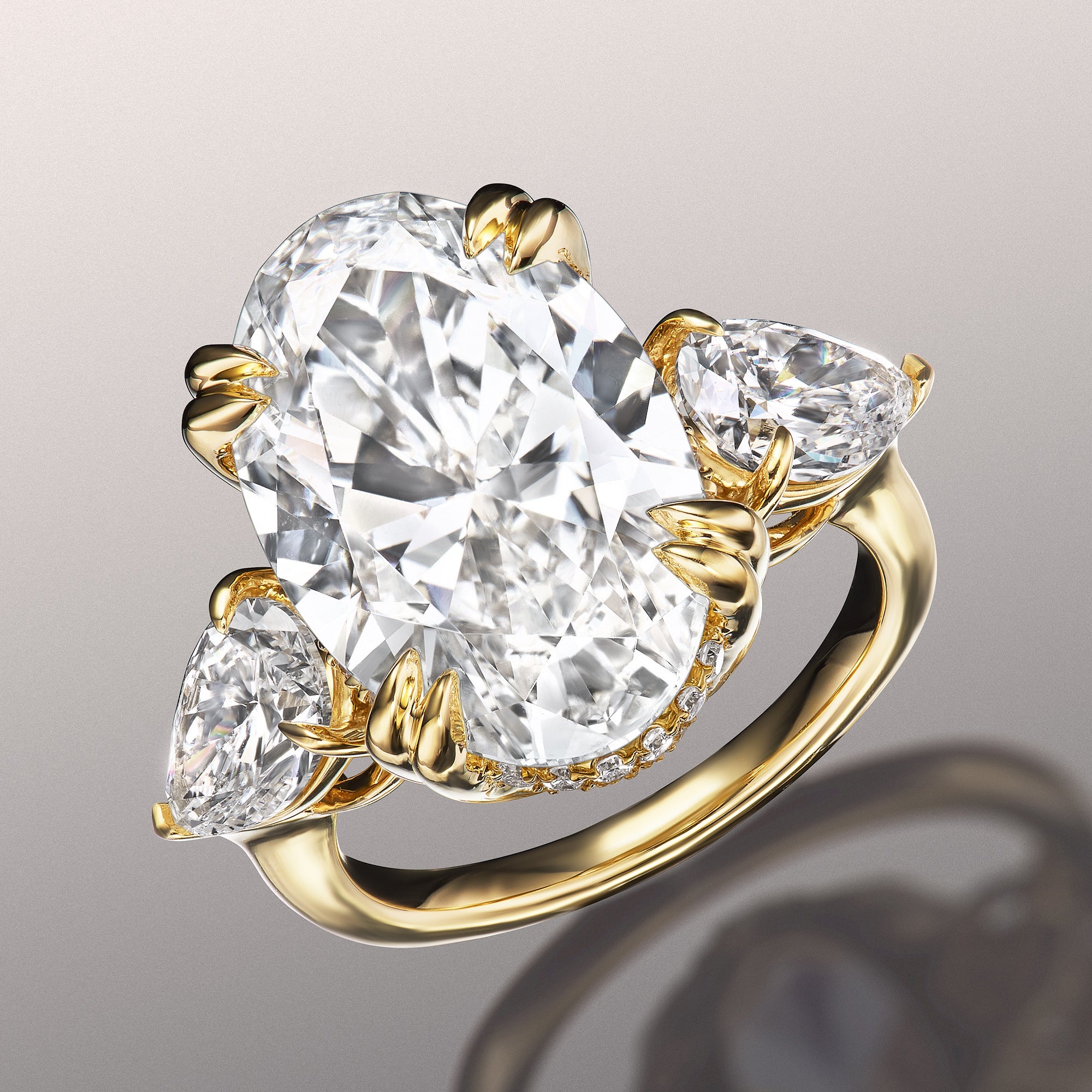 A masterfully crafted three-stone design that scintillates impressively. It carries a oval diamond secured by four double-claw prongs. Two matching pear diamonds are perfectly positioned on the left and right sides of the center stone. Just under the prong tips are tiny round diamonds that encircle the central gem, offering luster from another angle. The trio of peek-a-boo diamonds adds a special touch to this piece.