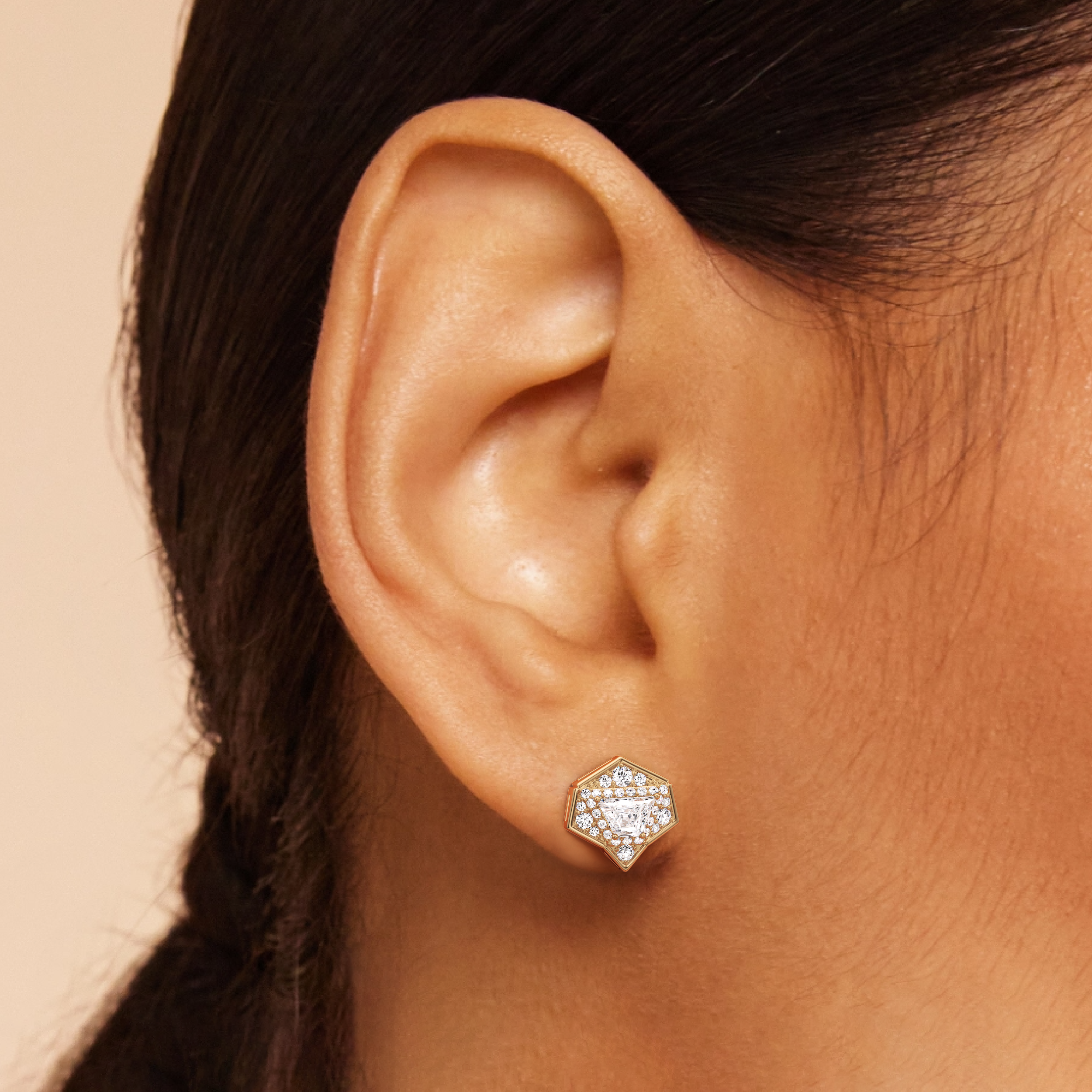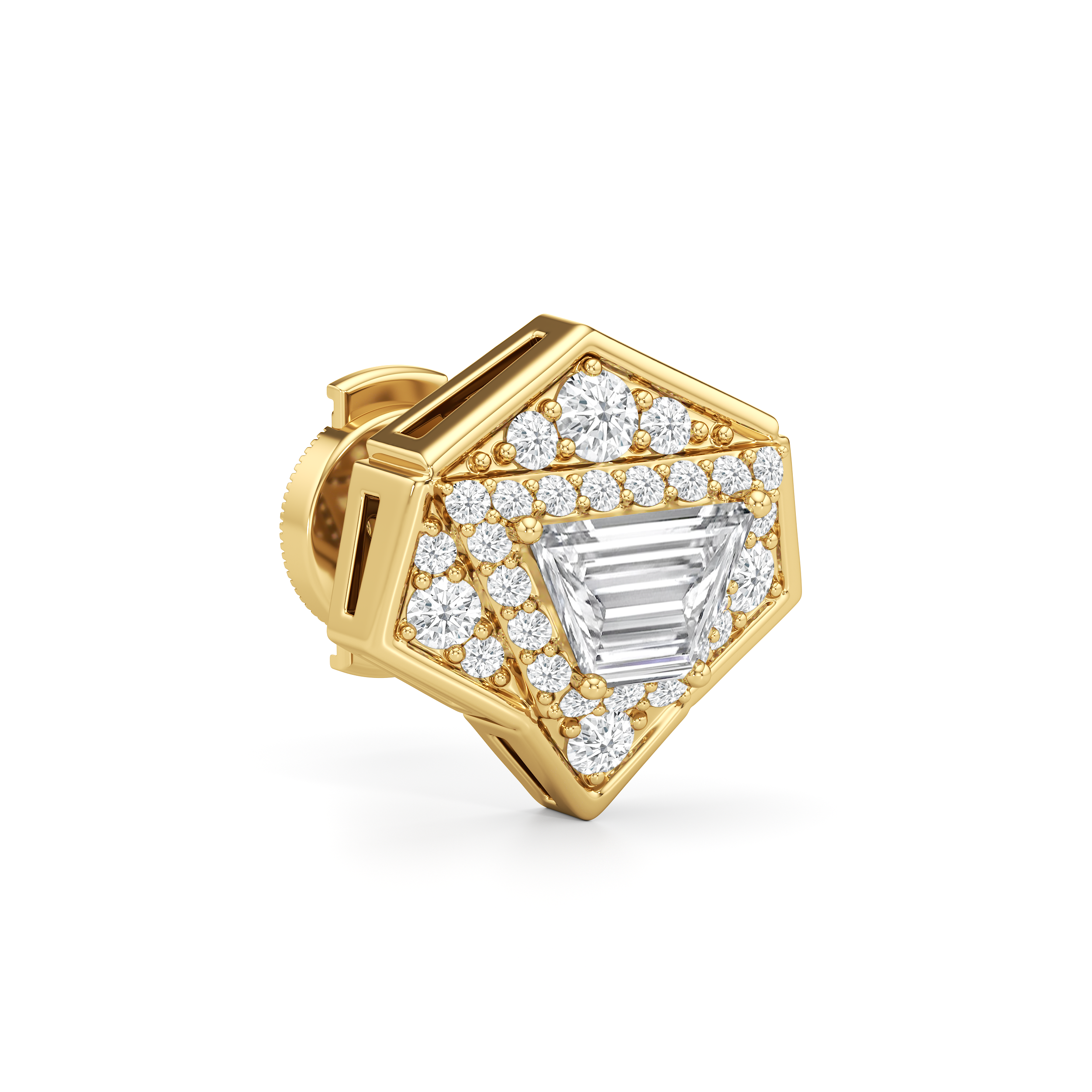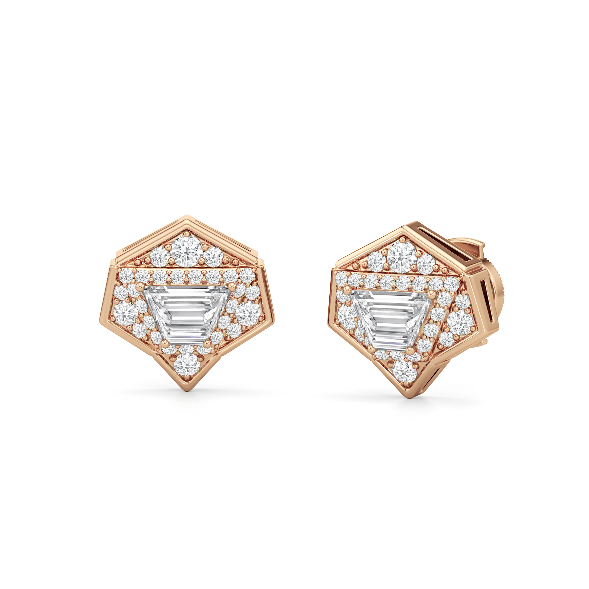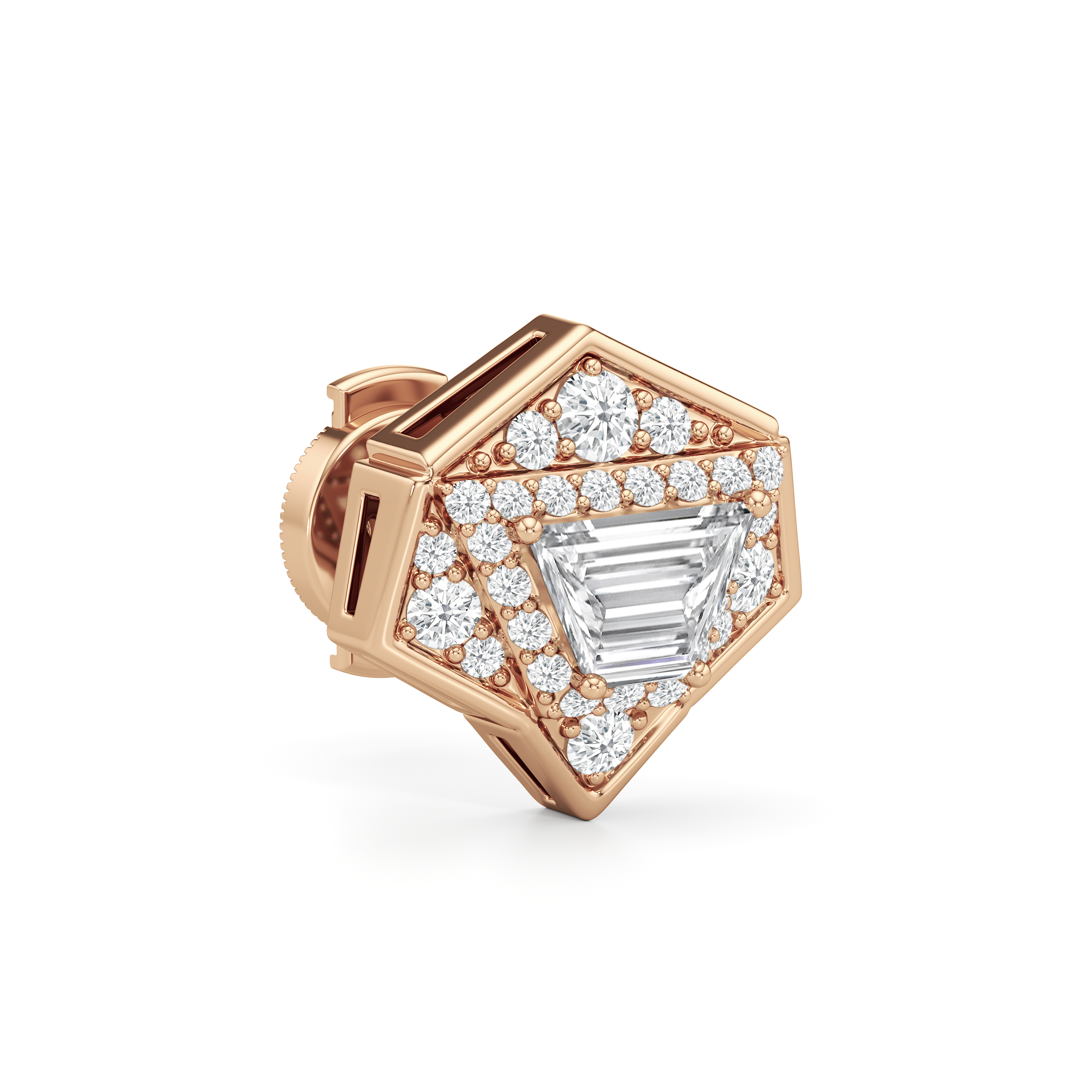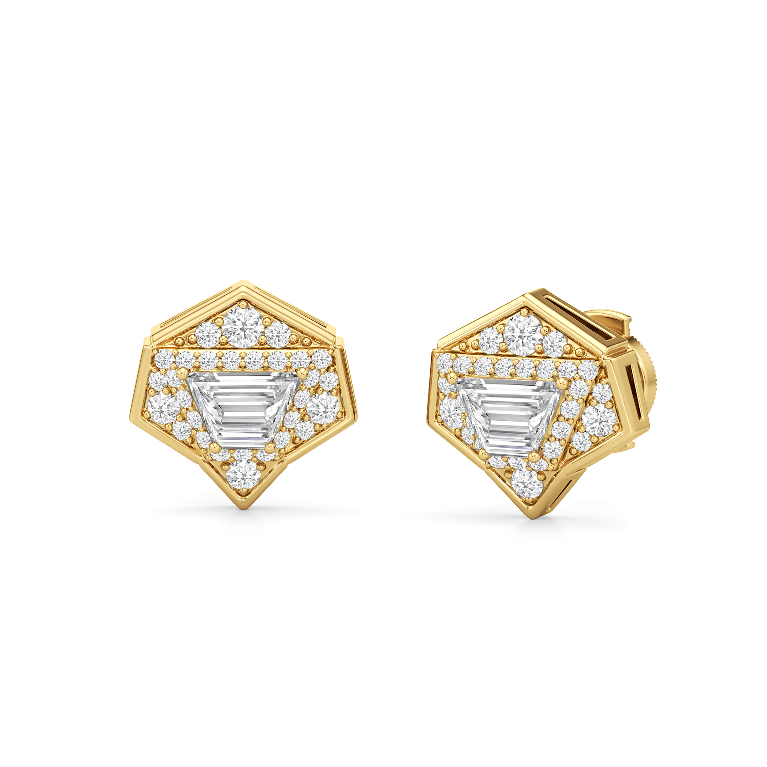 The Dorchester Earrings present a design featuring the fusion of classic Art Deco aesthetics and contemporary sensibility. Each stud centers on a trapezoid-cut stone, nestled within a geometric panel framed by clean, linear borders. The sharp angles and polished edges of the frame are complemented by the dynamic brilliance of prong-set round diamonds in graduated sizes. Looking both grand and graceful, these studs showcase the Art Deco era's fascination with line and luxury, geometry and glamour.