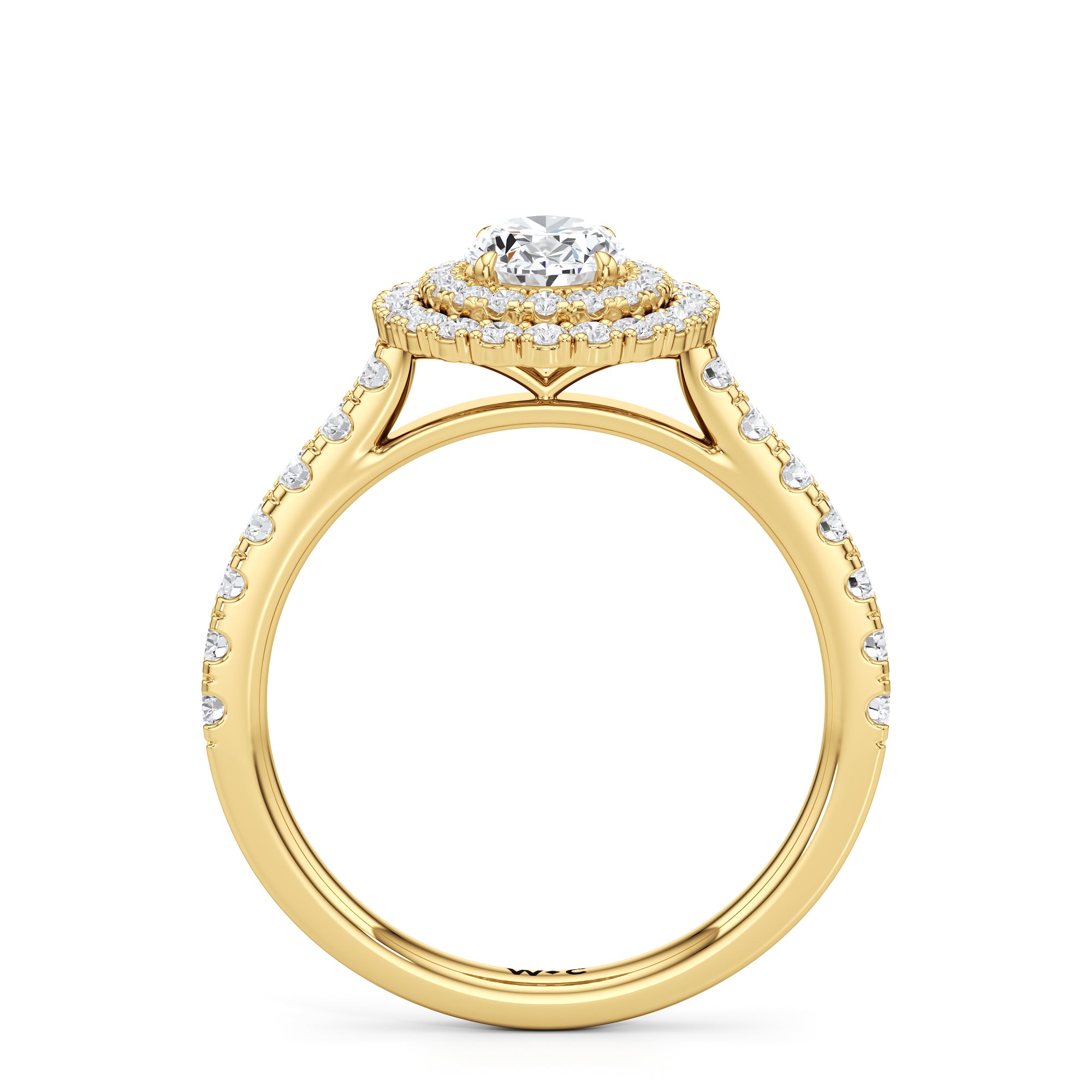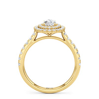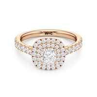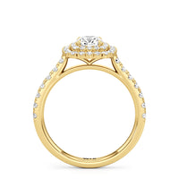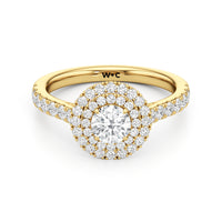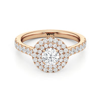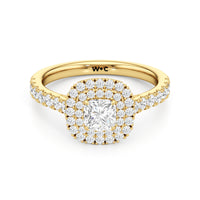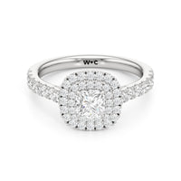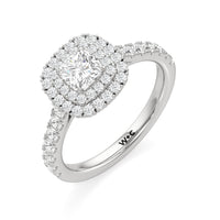 The distinctive raised look of this cathedral engagement ring will leave your future bride and onlookers alike in awe. The arching shoulders of the band are dotted with diamonds to lead eyes toward the mesmerising centrepiece. Raised high, front, and centre is a diamond framed by a two-toned double halo.
