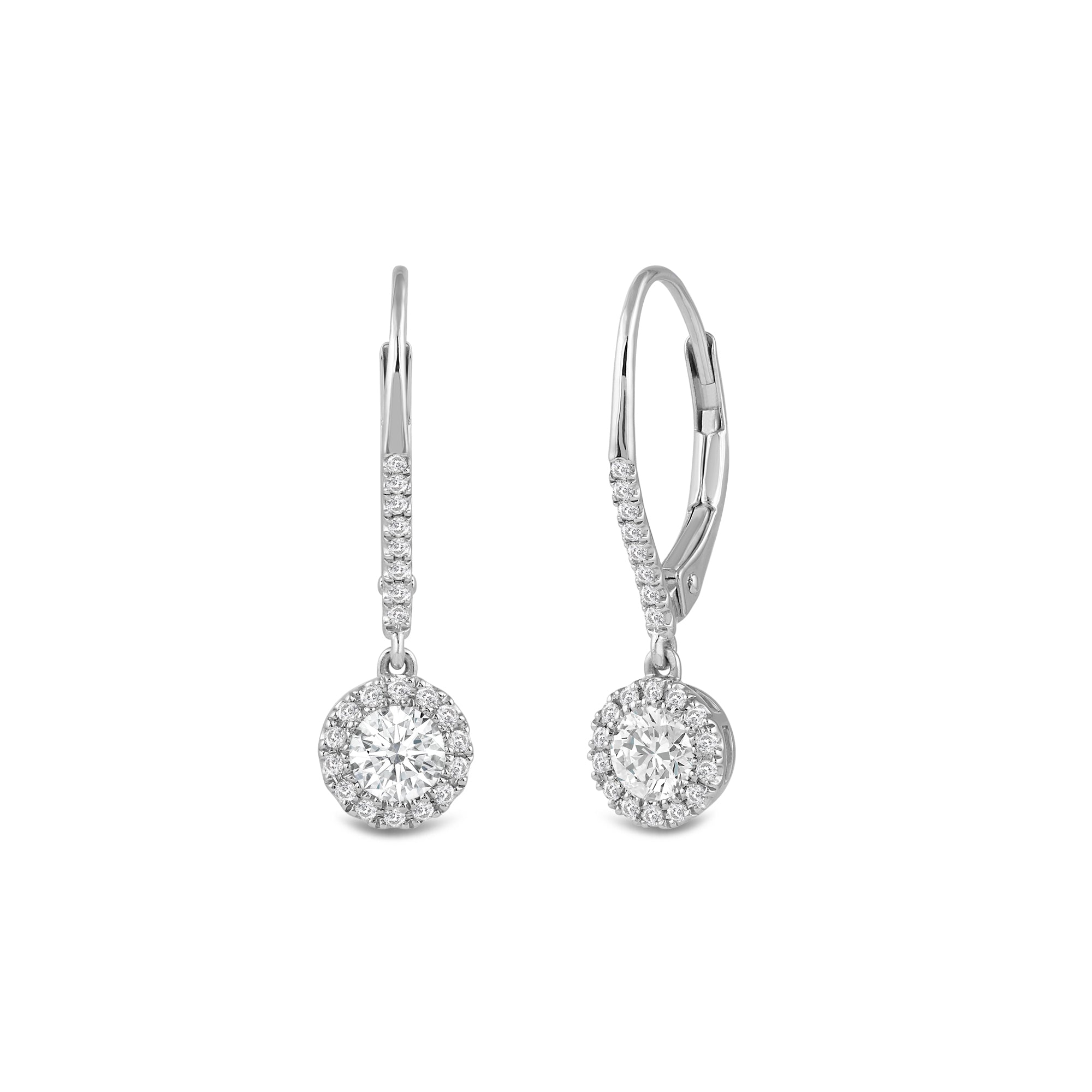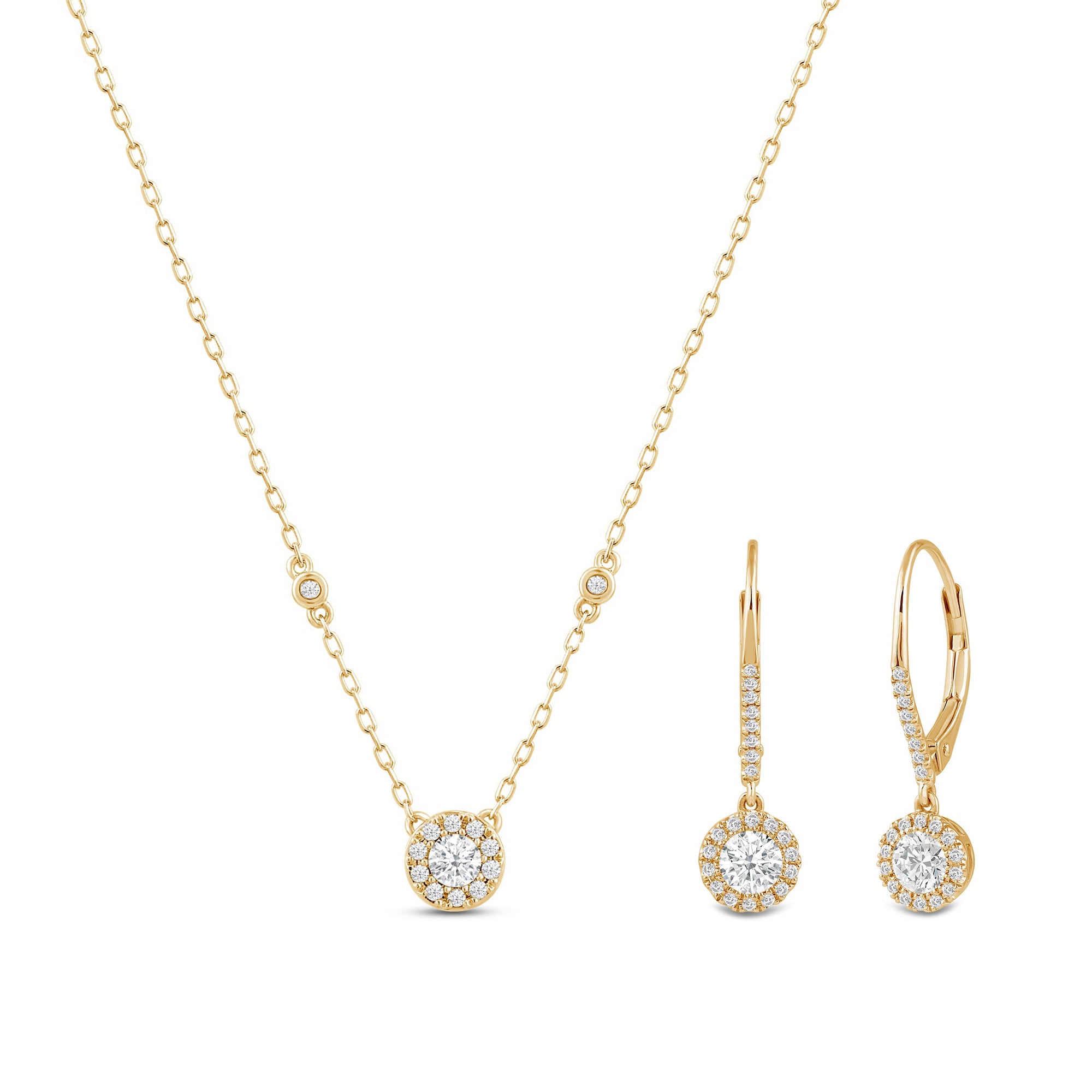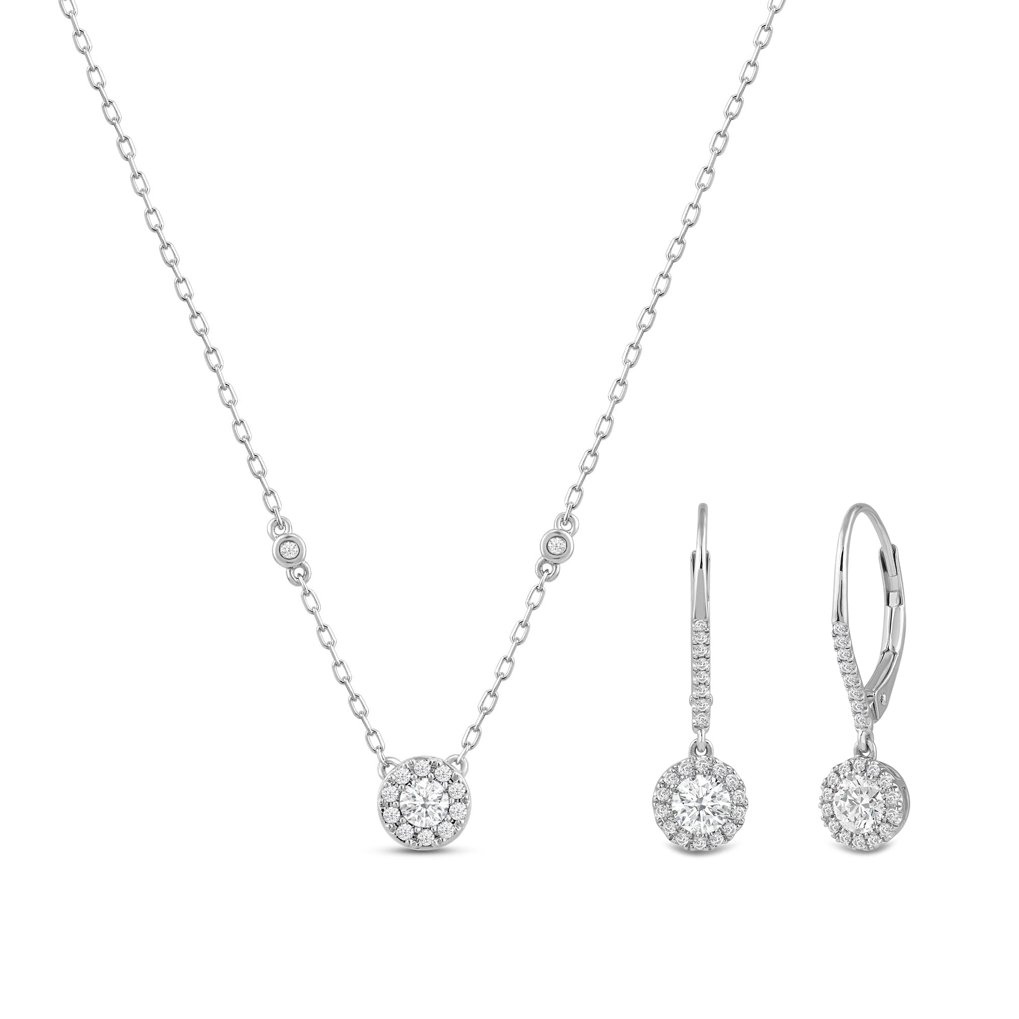 This earrings and necklace jewelry set showcases classic beauty enhanced by modern sophistication. The drop earrings are fastend by a lever back, with the front traced by petite diamonds. A round diamond with a glittering halo subtly drop from the earring's base. The pendant has the same haloed round diamond suspending from a barely-there chain.