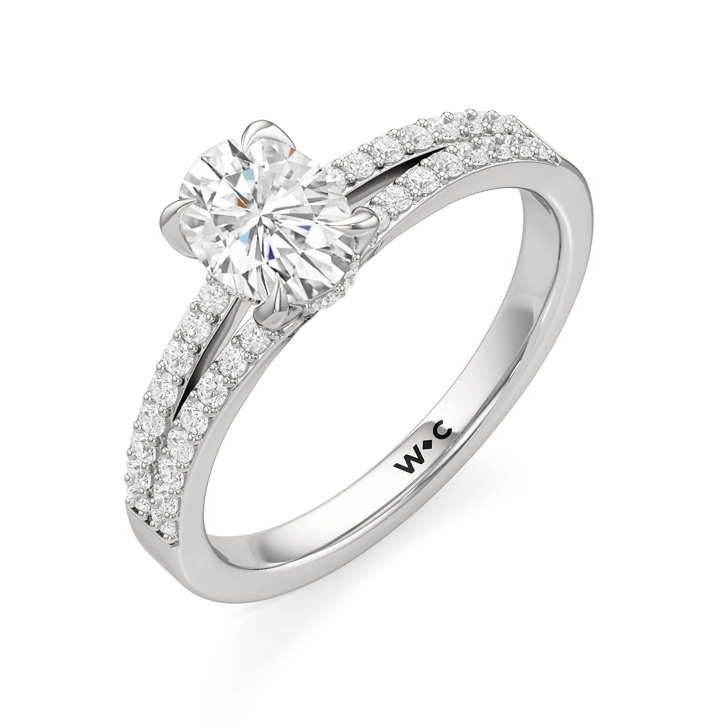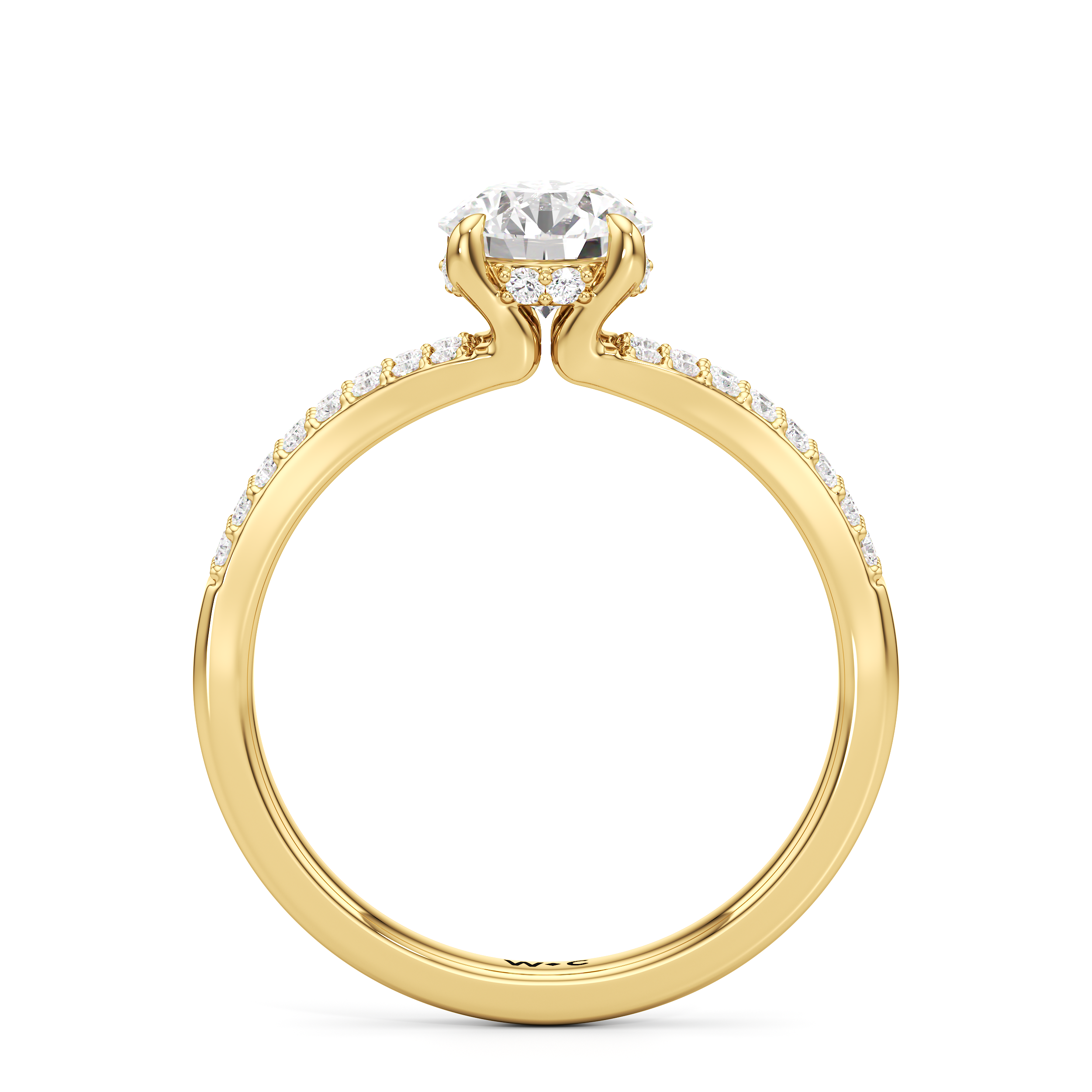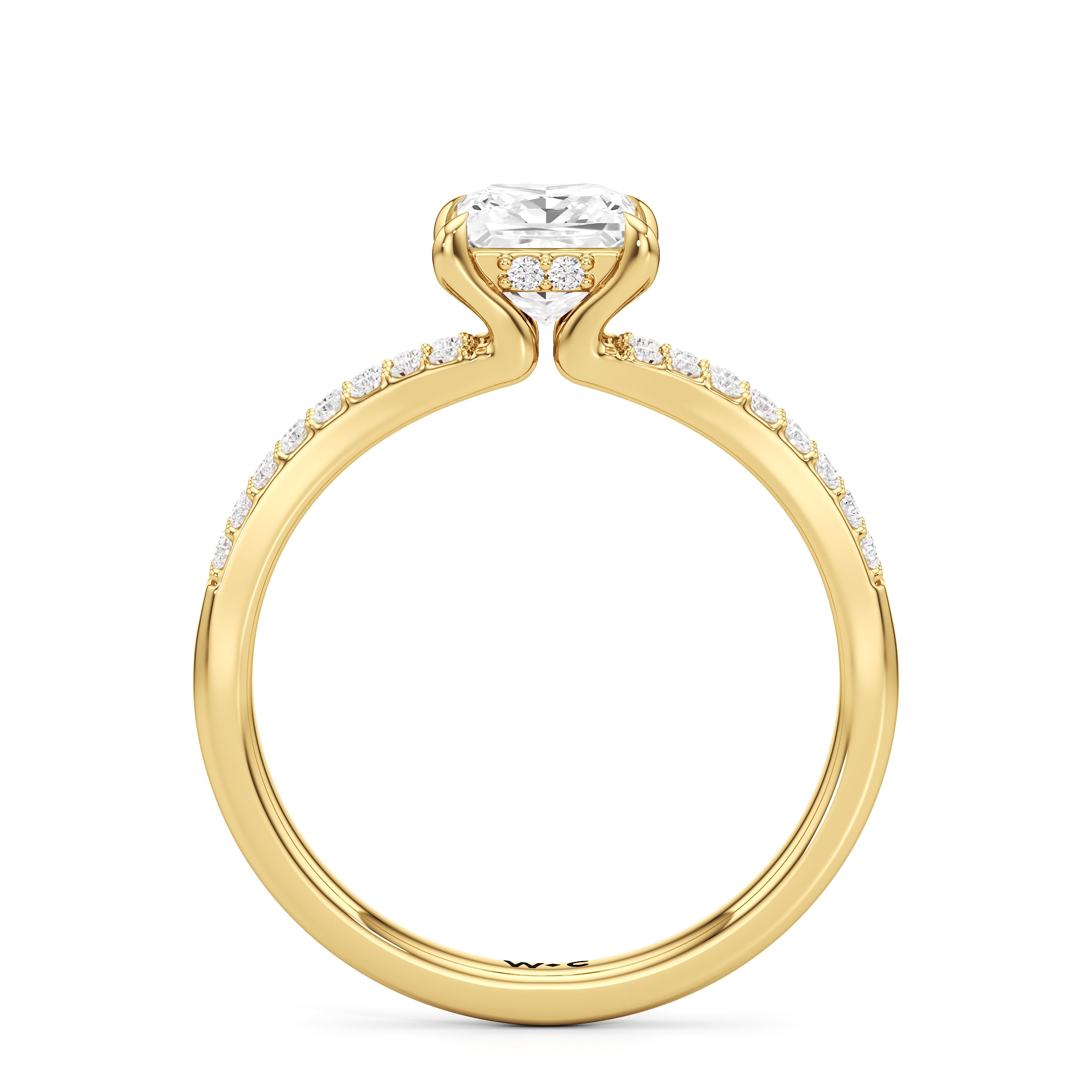 The polished band of the Elise Engagement Ring splits in two at the shoulders, meeting the centre stone in style. The split shoulders, however, do not form a complete circle. Instead, the splitting ends curve upwards, forming the prongs that hold the main diamond in place. Underneath the central stone is a ribbon of diamonds.