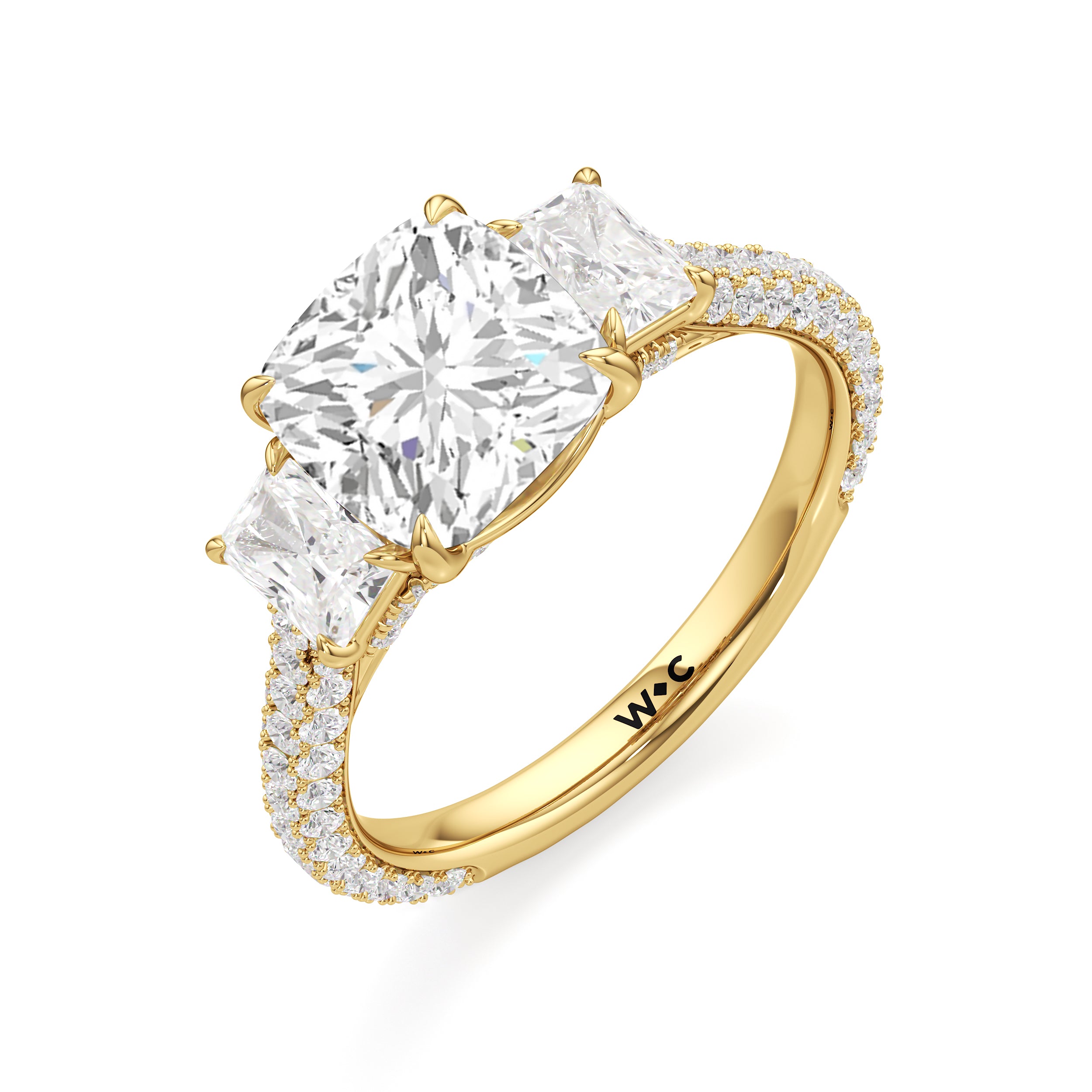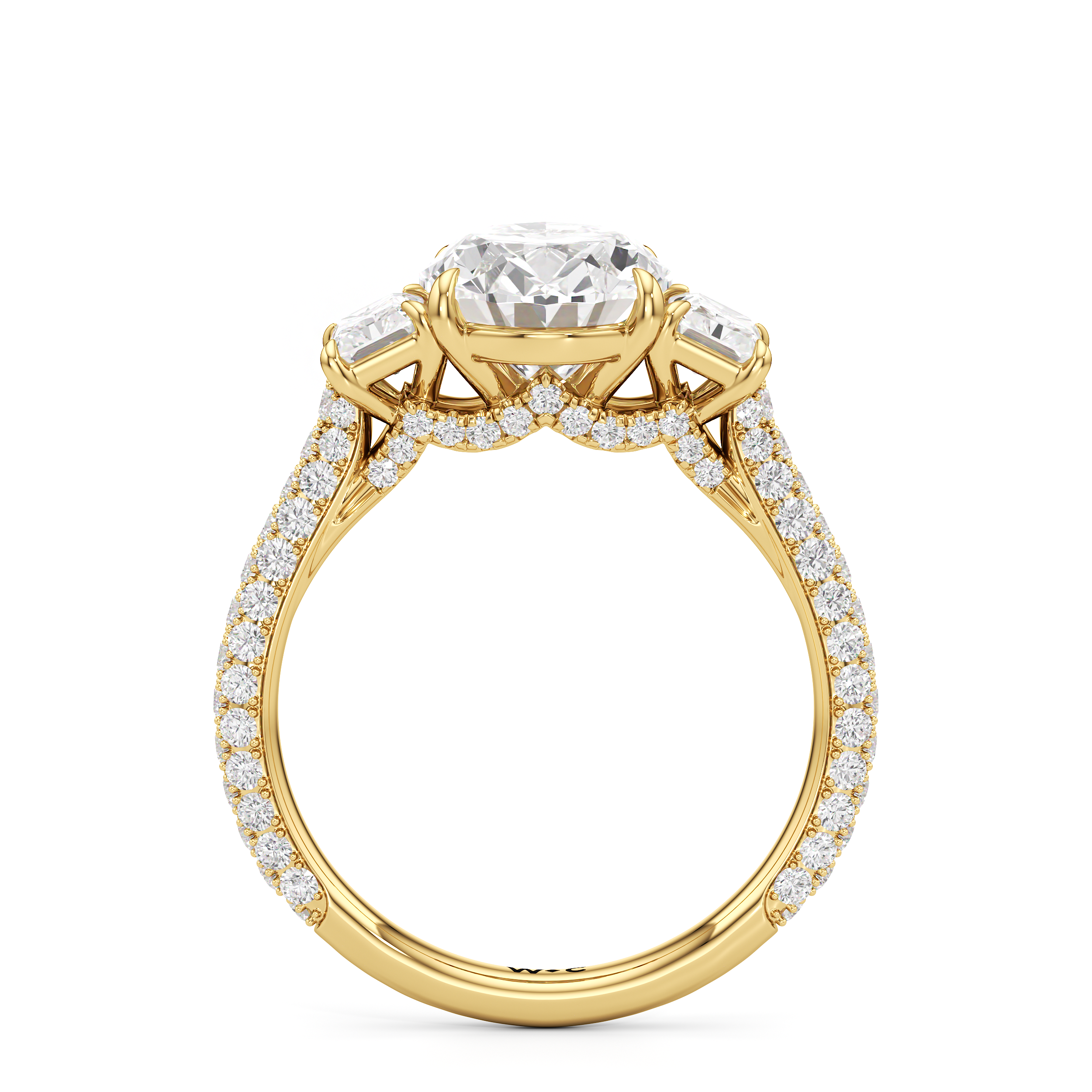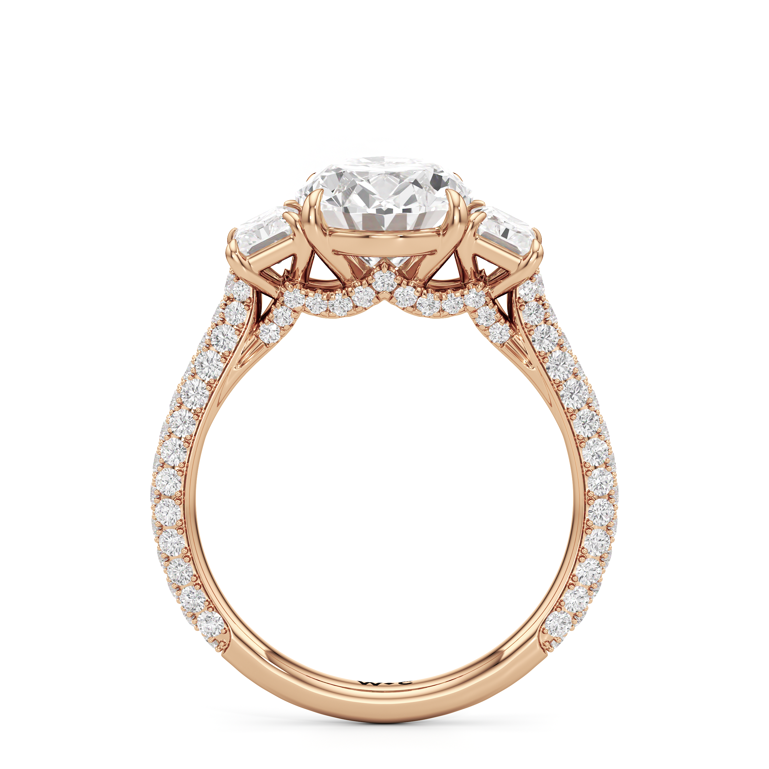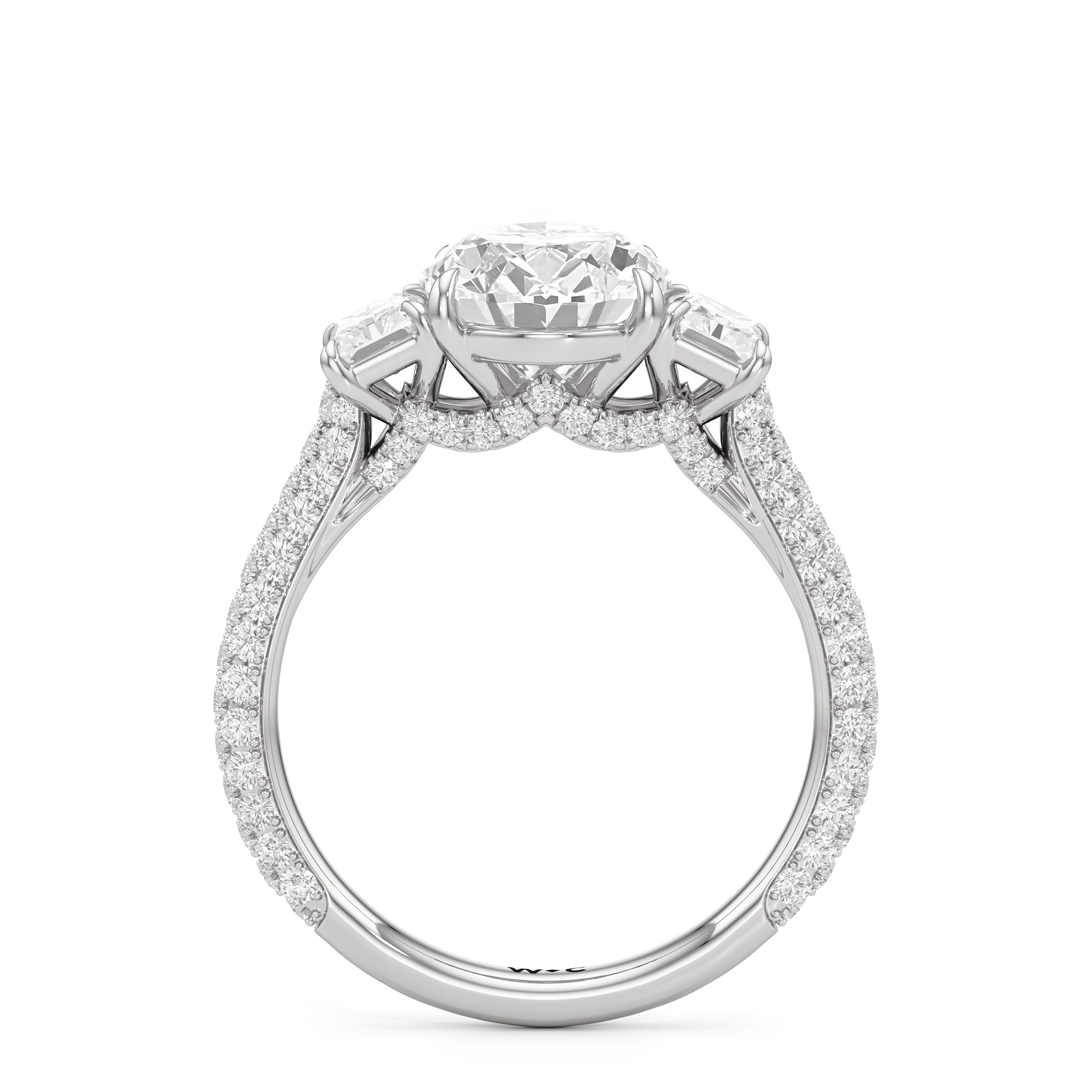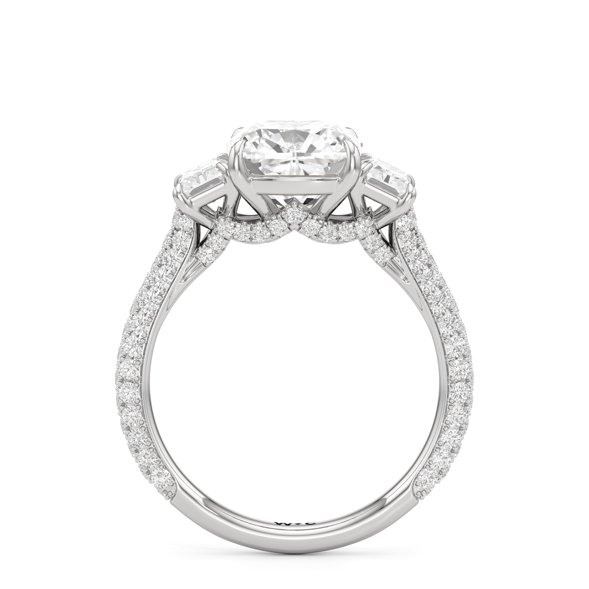 Positioning a larger diamond between two emerald-cut diamonds is an excellent way to make the focal stone stand out while giving the ring a unique shine. Numerous petite round diamonds trace all sides of this ring's sloping shoulders, covering almost the entire circumference of the band. The scalloped bridge of this three-stone ring also features petite round diamonds that beautifully taper in size.
