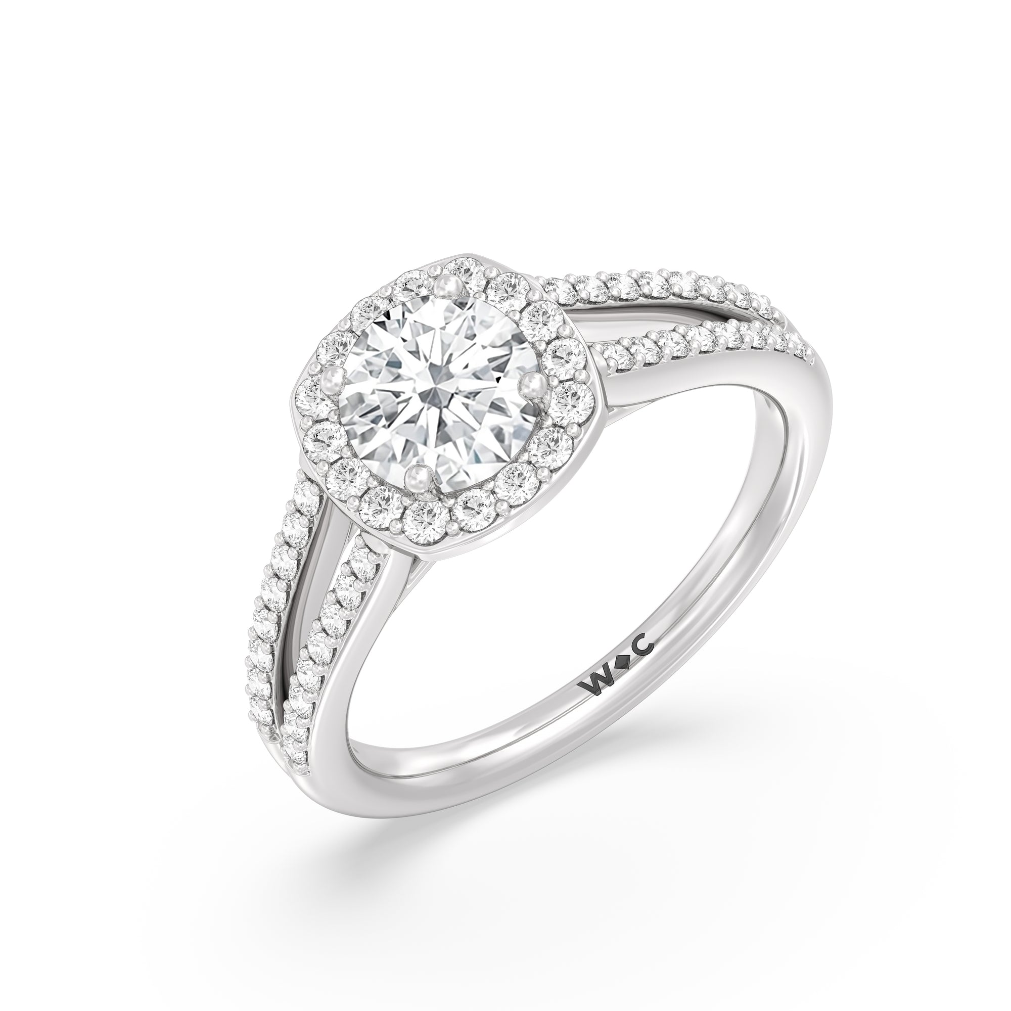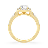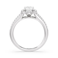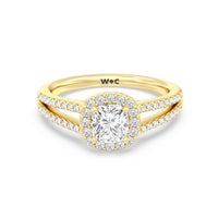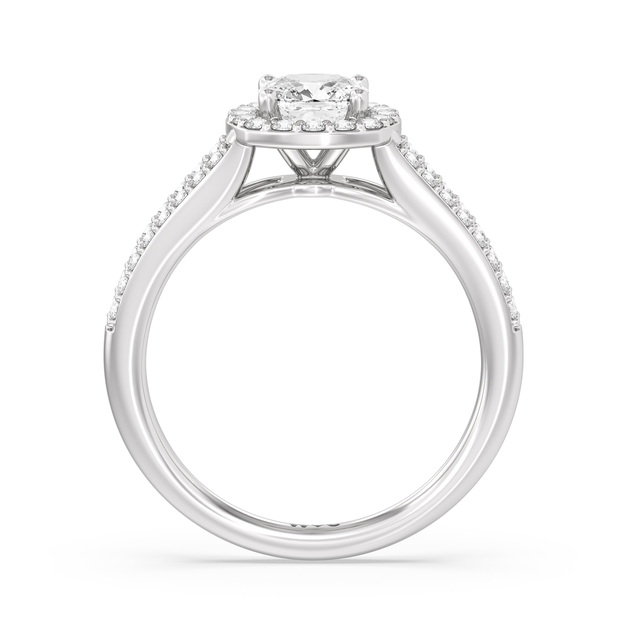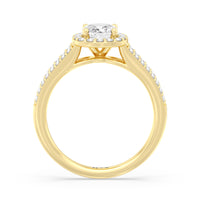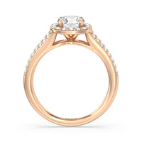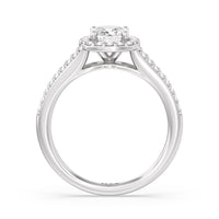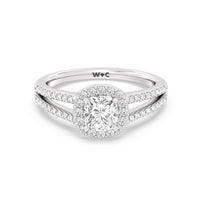 The Elizabeth Engagement Ring is designed with geometric elegance in mind. It is detailed with a diamond-set split shank and a diamond centre stone framed by a cushion-shaped halo of more round diamonds, contributing to the extraordinary brilliance of this ring.