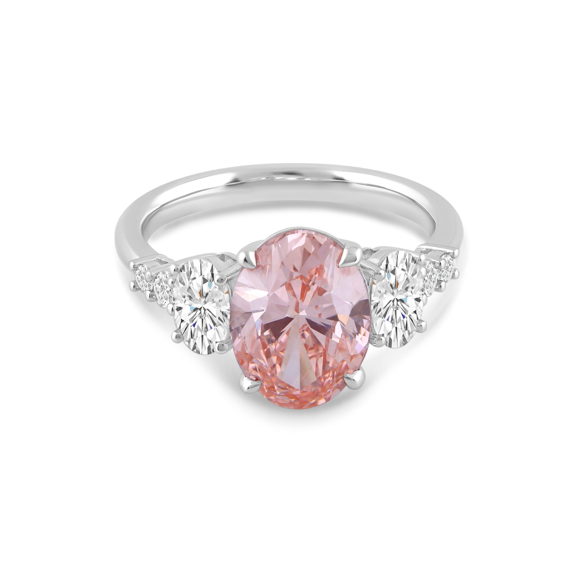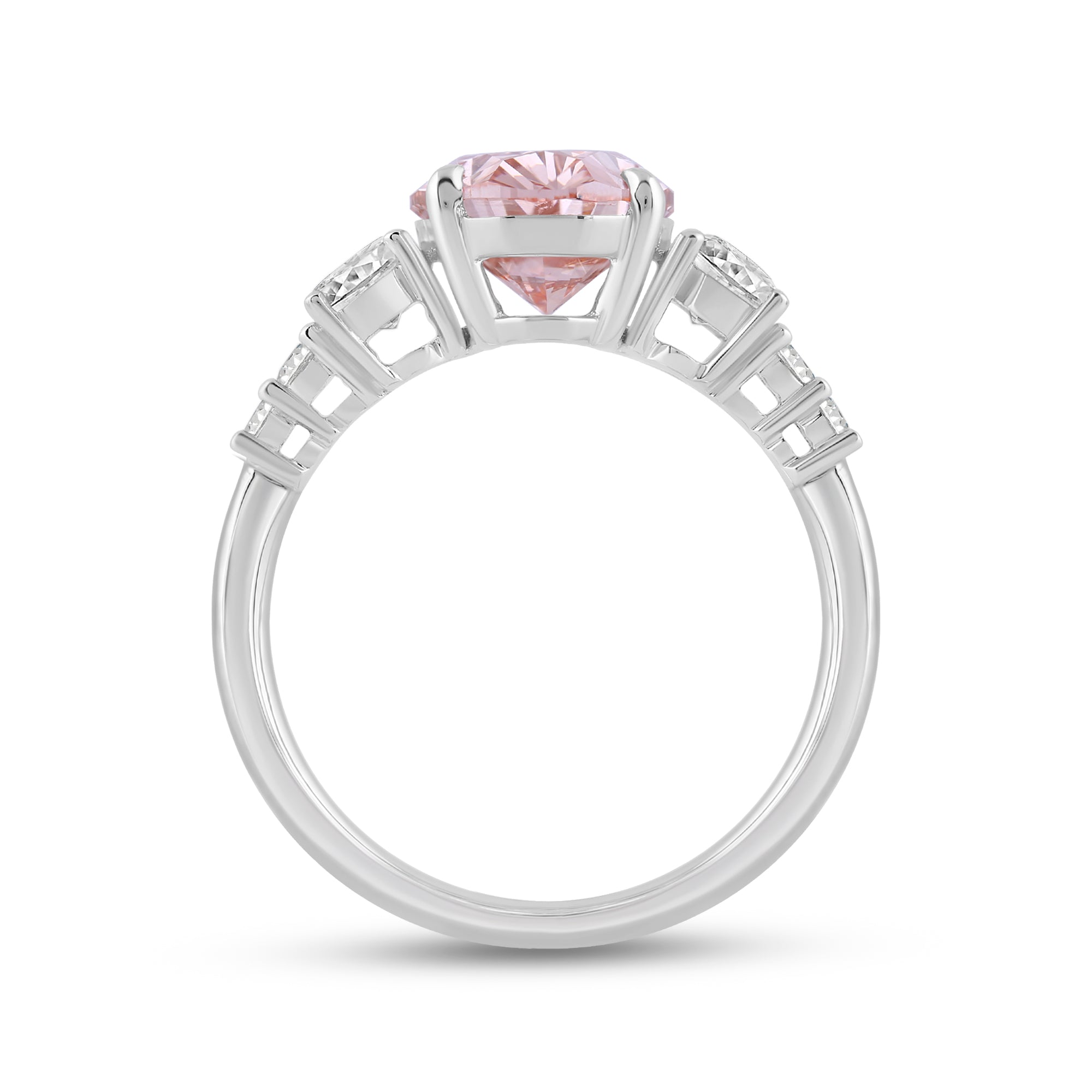 With a strikingly pink oval-cut diamond surrounded by diamonds tapering in size, this ring adds a contemporary flair on the classic oval engagement ring, while still remaining elegantly refined.
