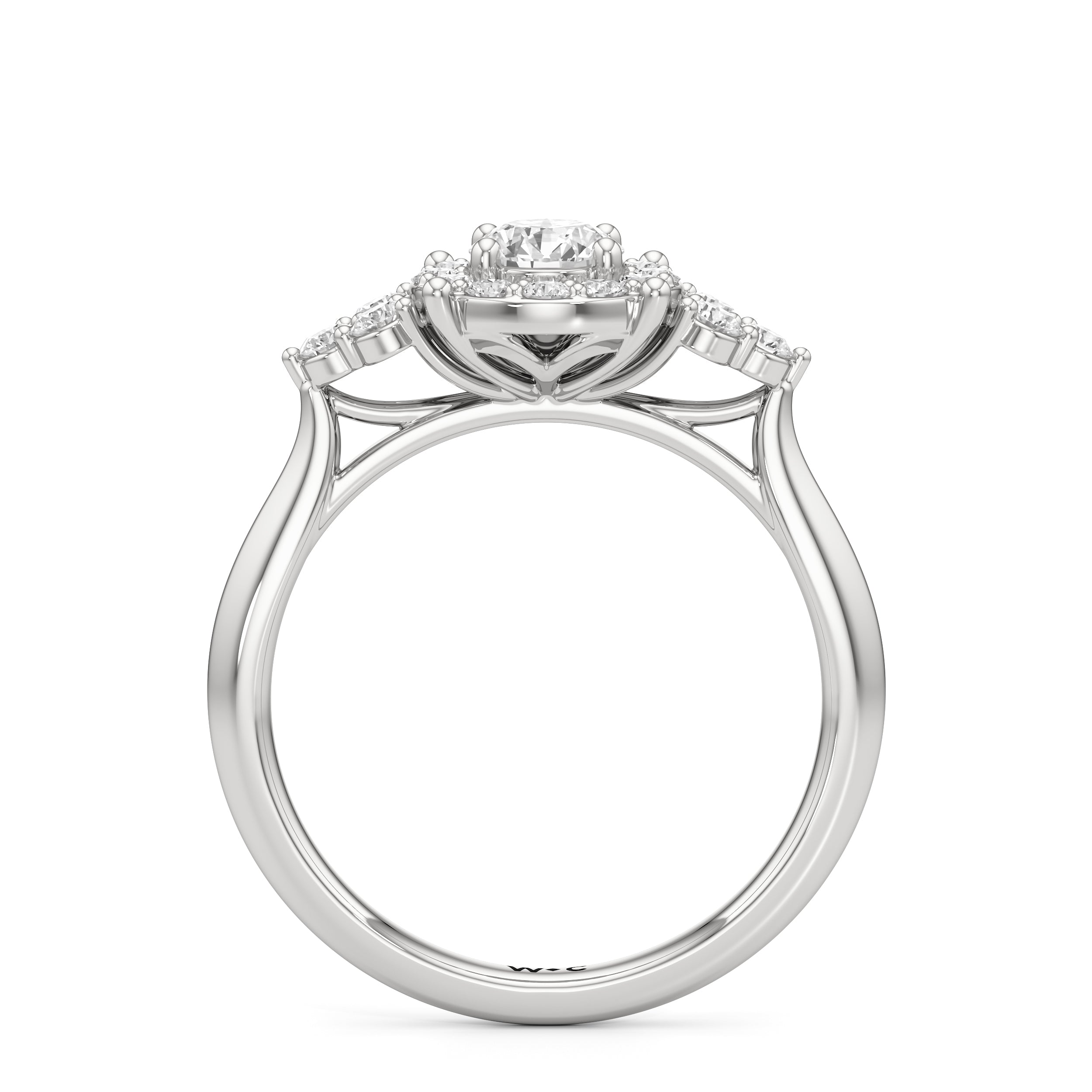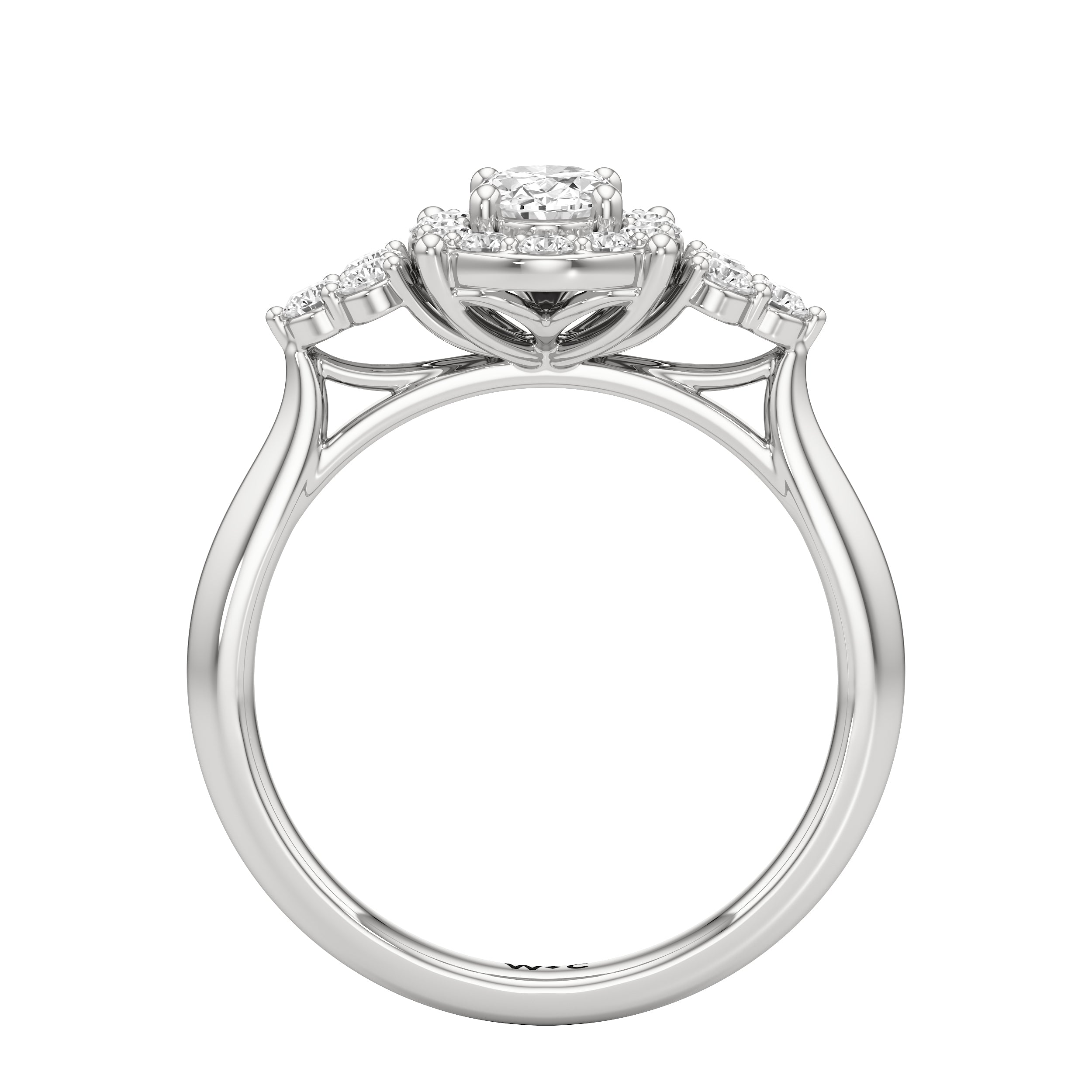 The Estelle Engagement Ring was designed to shine with a haloed centre diamond. The centrepiece glistens in sync with trios of round diamond side stones, completing the ring's romantic look. A halo engagement ring with side stones like this is perfect for stacking with a crescent wedding band.