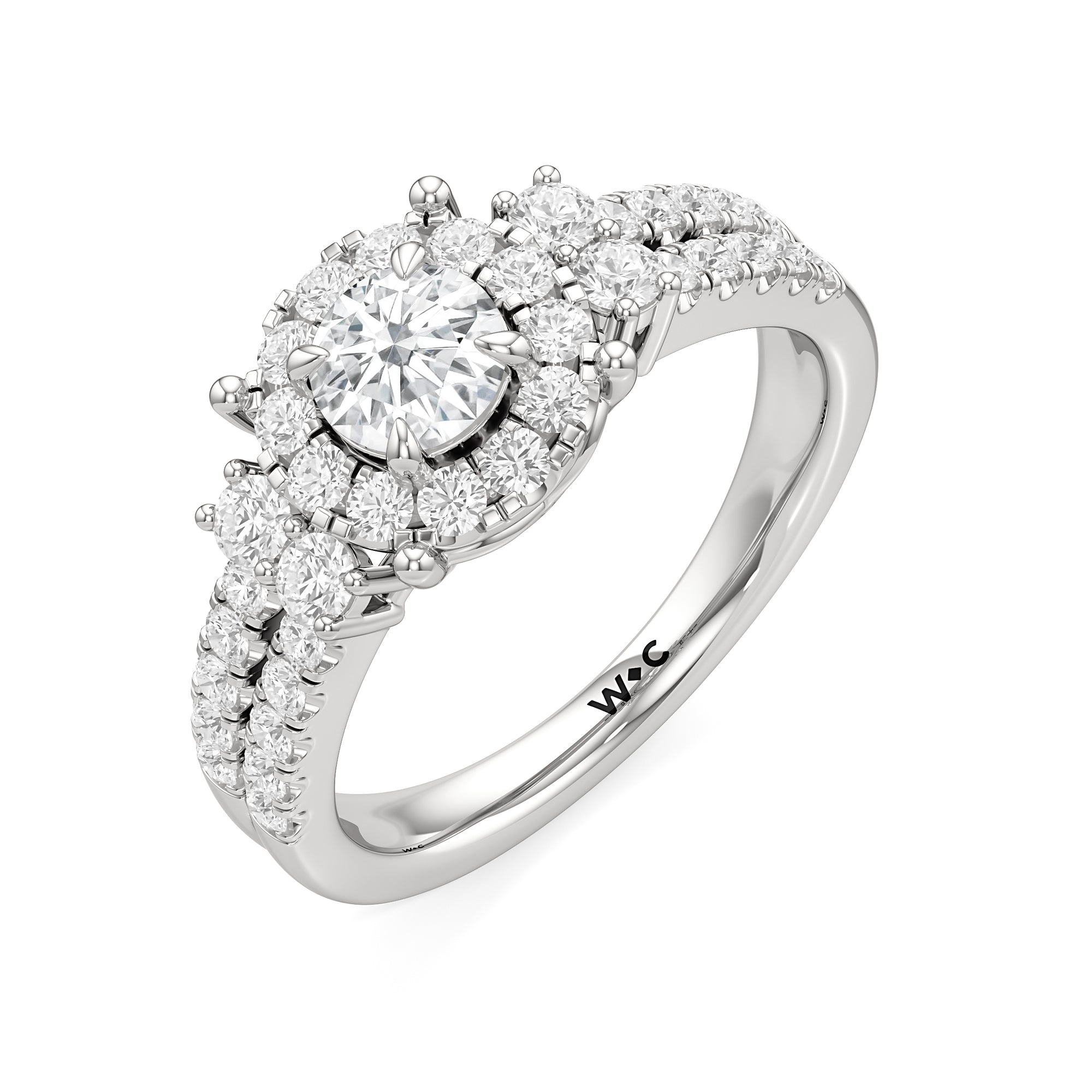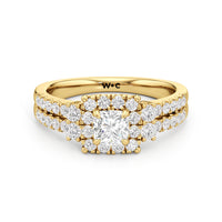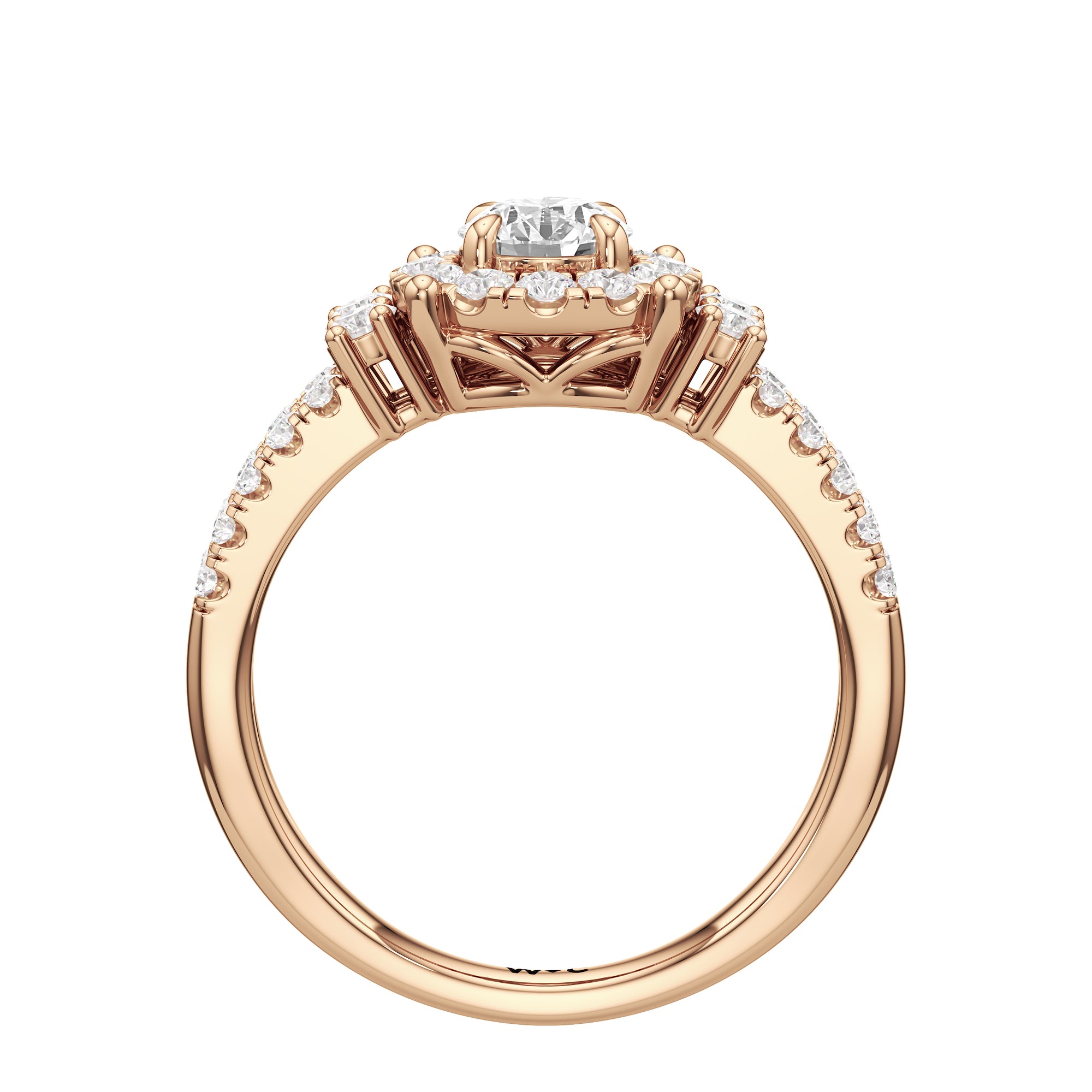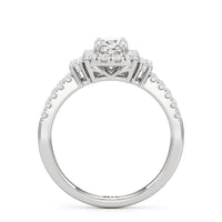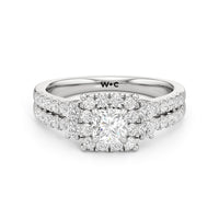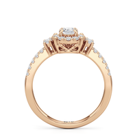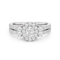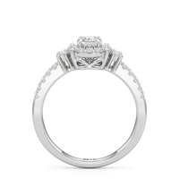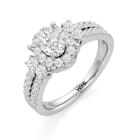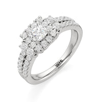 The Felicity Engagement Ring has a character distinctly its own. Its band is designed with two rows of diamonds, giving the illusion of a stacked look. The centre diamond is framed by petite round diamonds. Four bigger round diamond side stones, with two stones sitting on each side, flank the cluster head centrepiece.