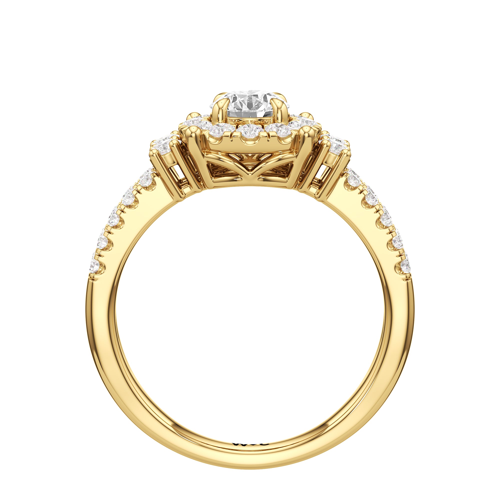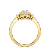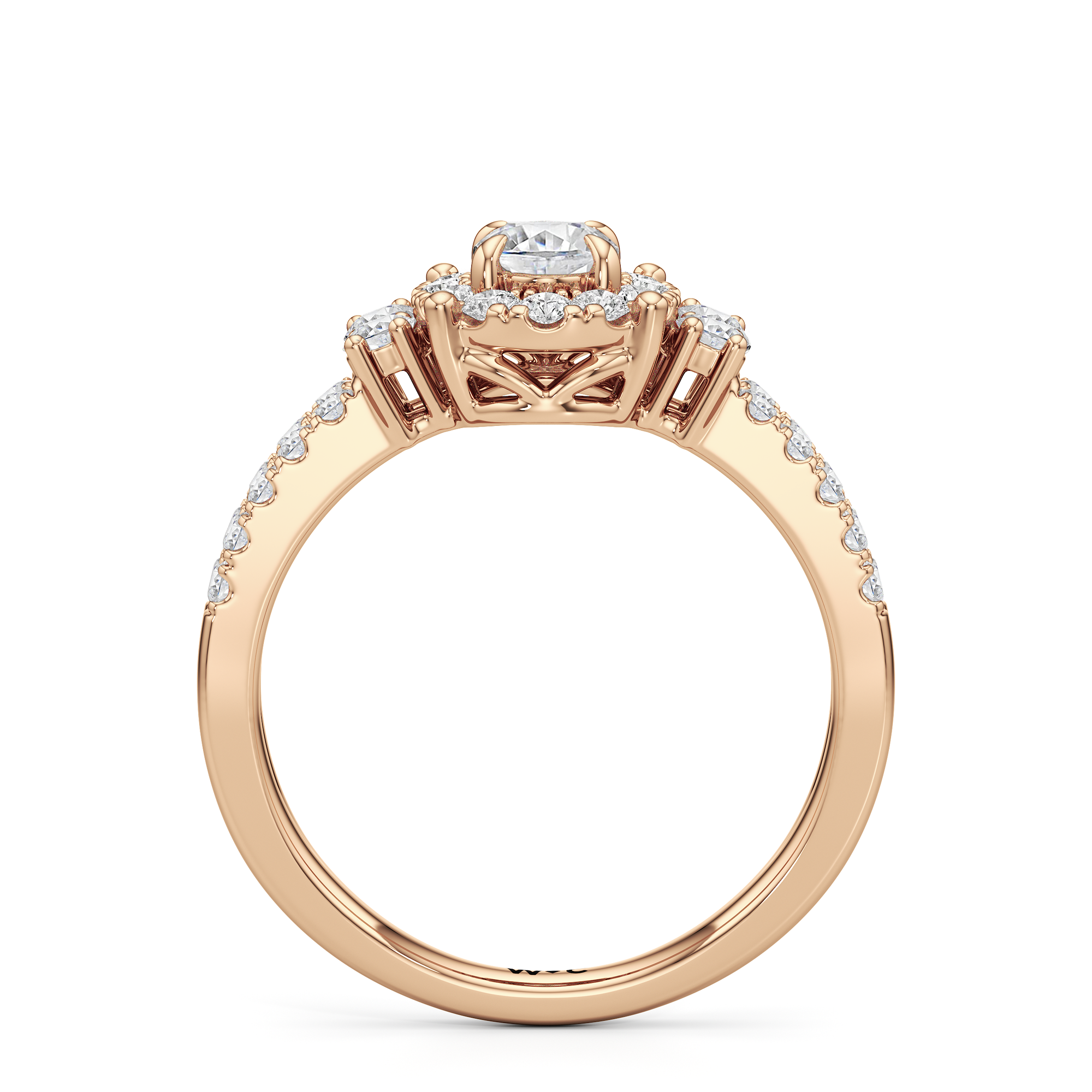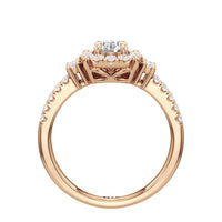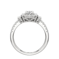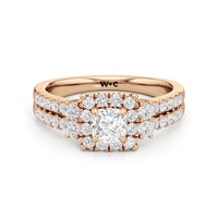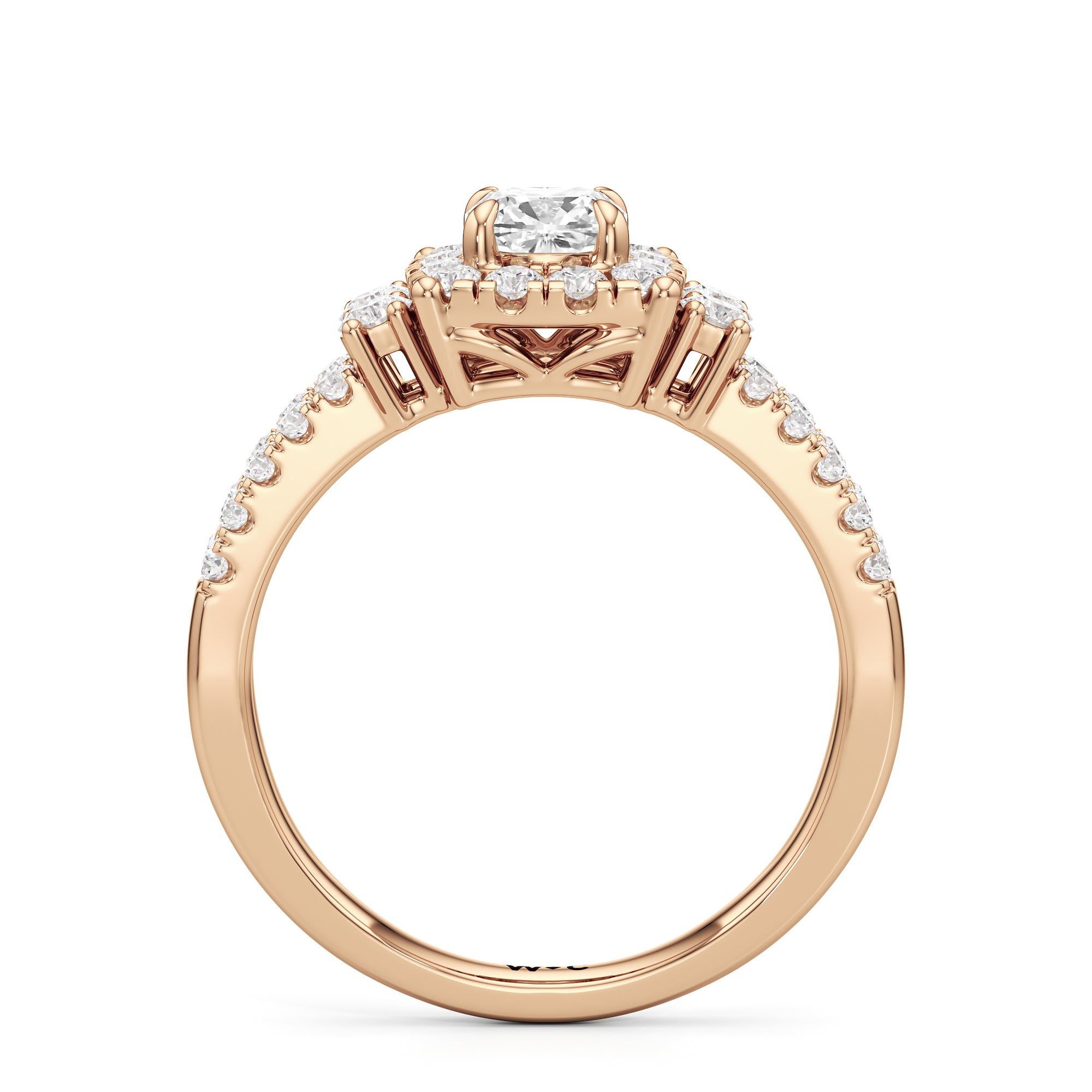 The Felicity Engagement Ring has a character distinctly its own. Its band is designed with two rows of diamonds, giving the illusion of a stacked look. The centre diamond is framed by petite round diamonds. Four bigger round diamond side stones, with two stones sitting on each side, flank the cluster head centrepiece.