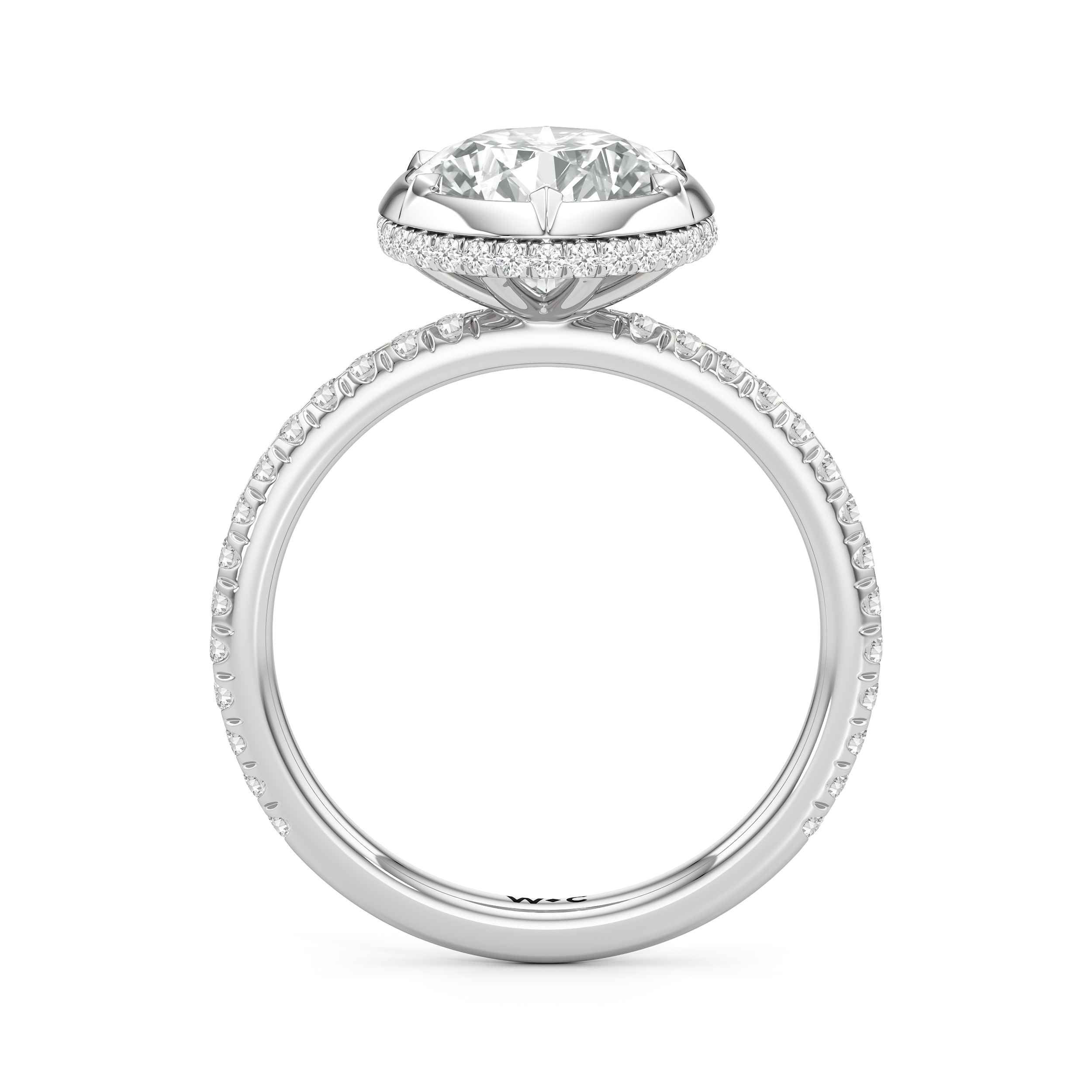 Fleuron brings together structure and softness in a setting that is both classic and current. The center diamond is raised above the band in a hybrid serti dressé setting, inspired by antique Georgian styles. A hidden halo adds an unexpected brilliance beneath the stone, while the double rows of pavé diamonds on the band lend a refined lightplay.