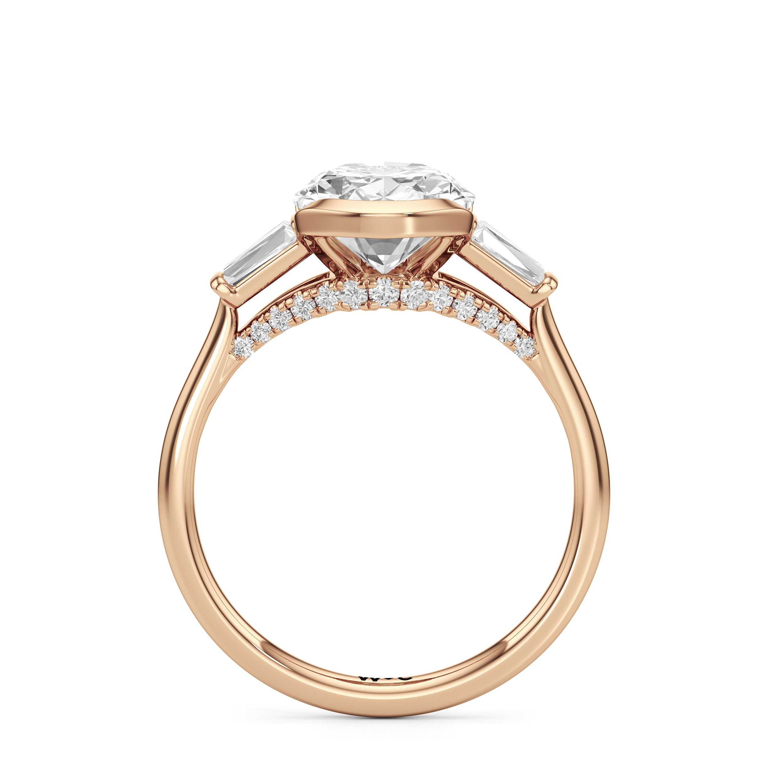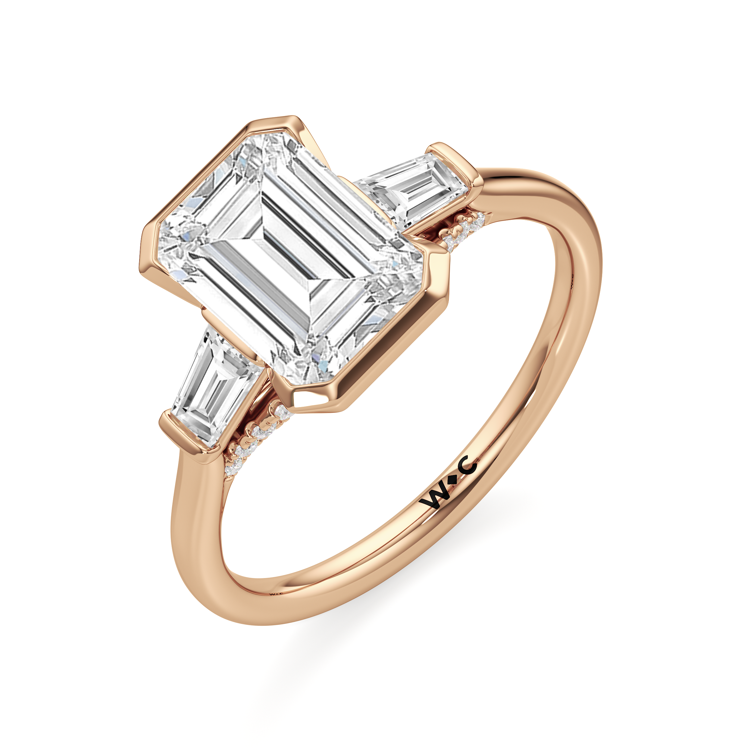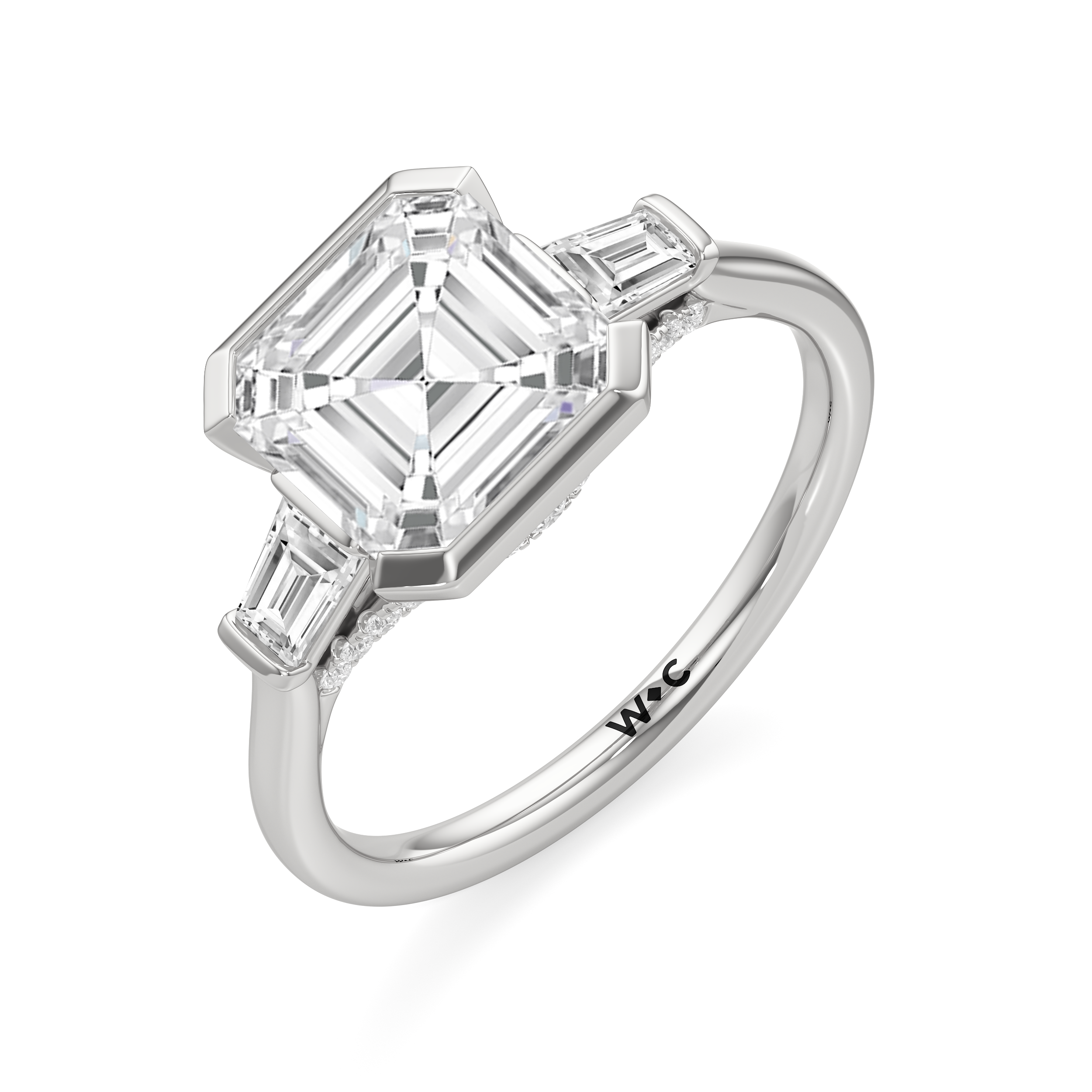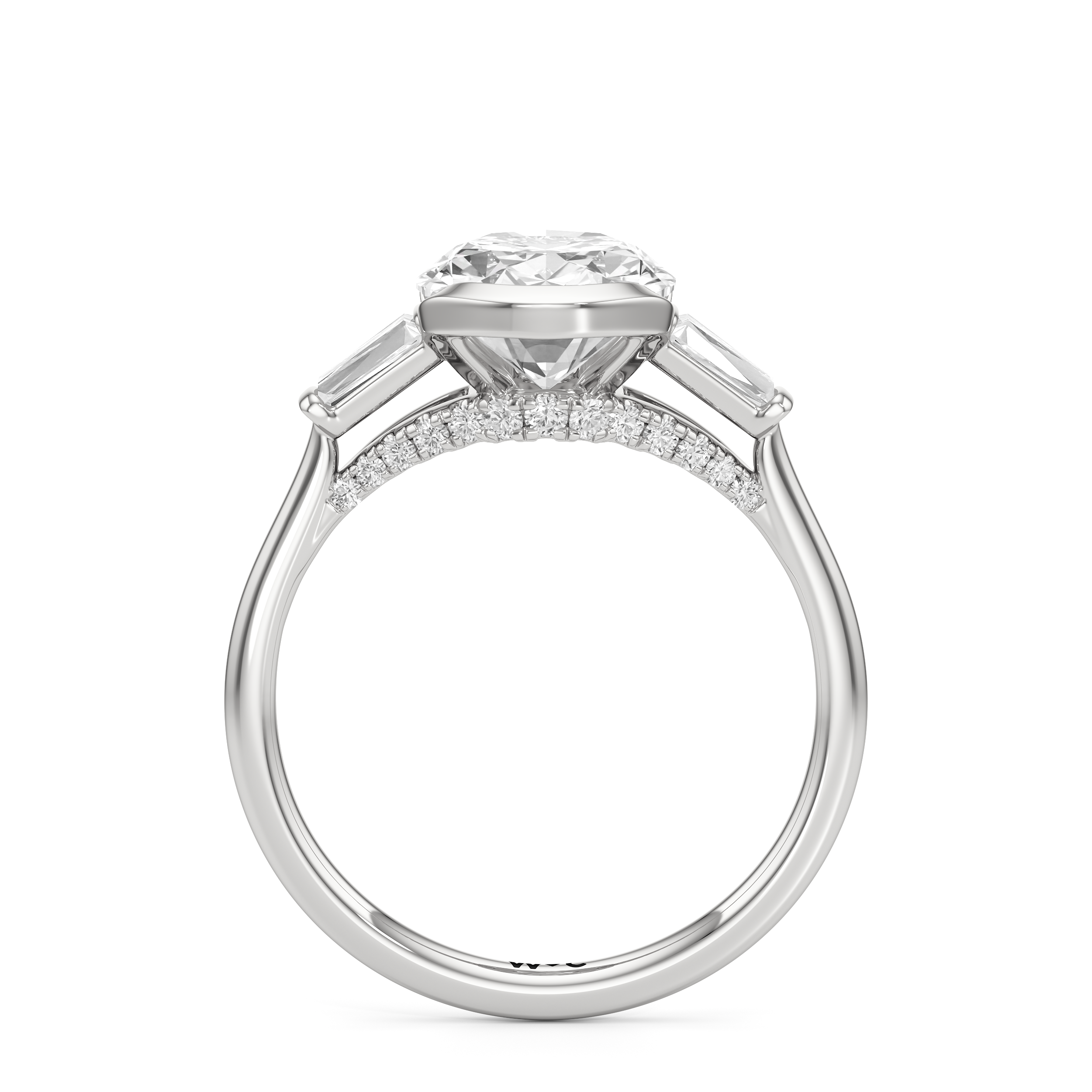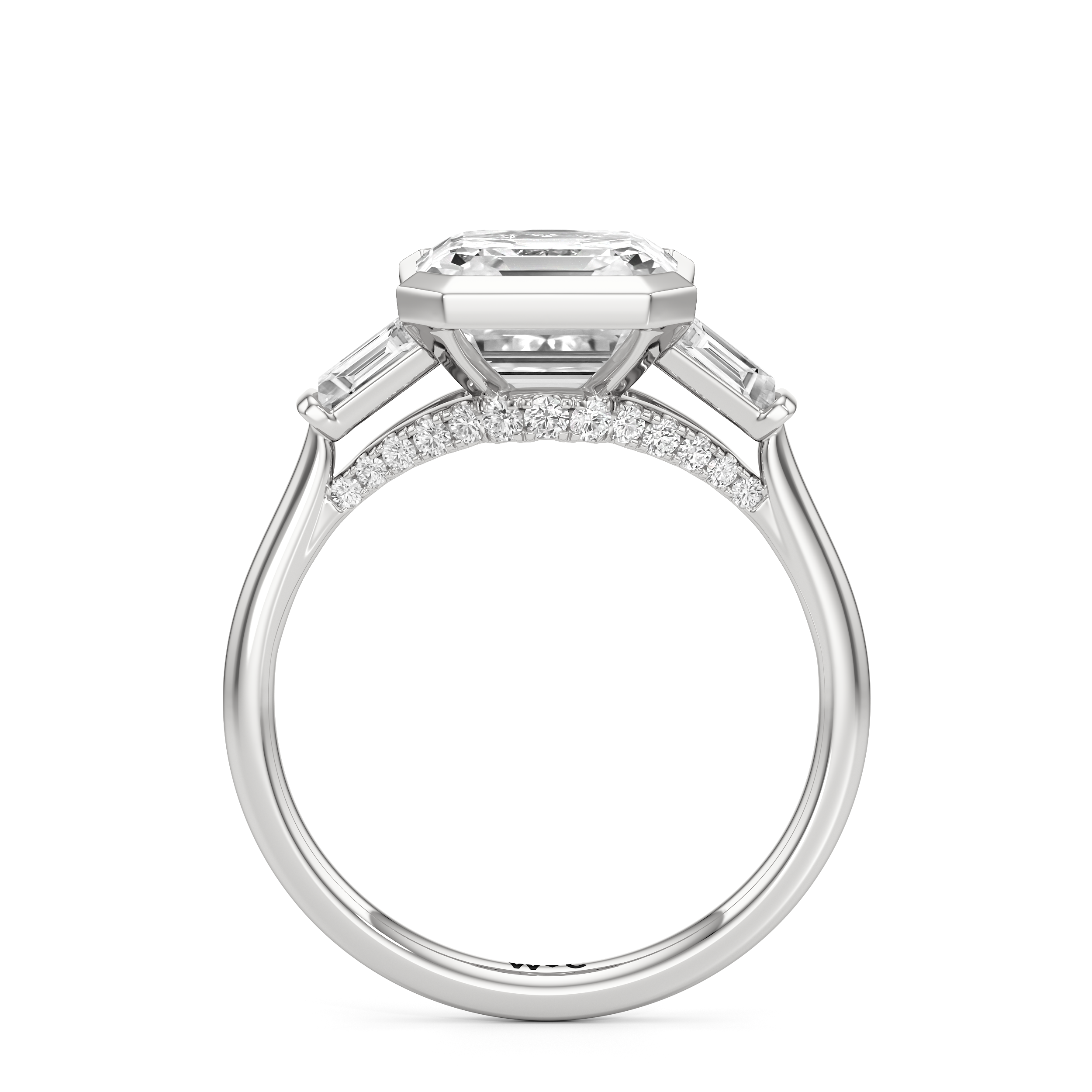 The striking yet refined style of this three-stone ring makes it an heirloom-worthy piece. This ring is designed with a trio of cathedral-set diamonds on a classic plain band. The center stone is held by a bezel and flanked by bar-set tapered baguette diamonds. Petite round diamonds on micro prongs follow the concave silhouette of the bridge, adding an unexpected sparkle to the ring when viewed from the sides.