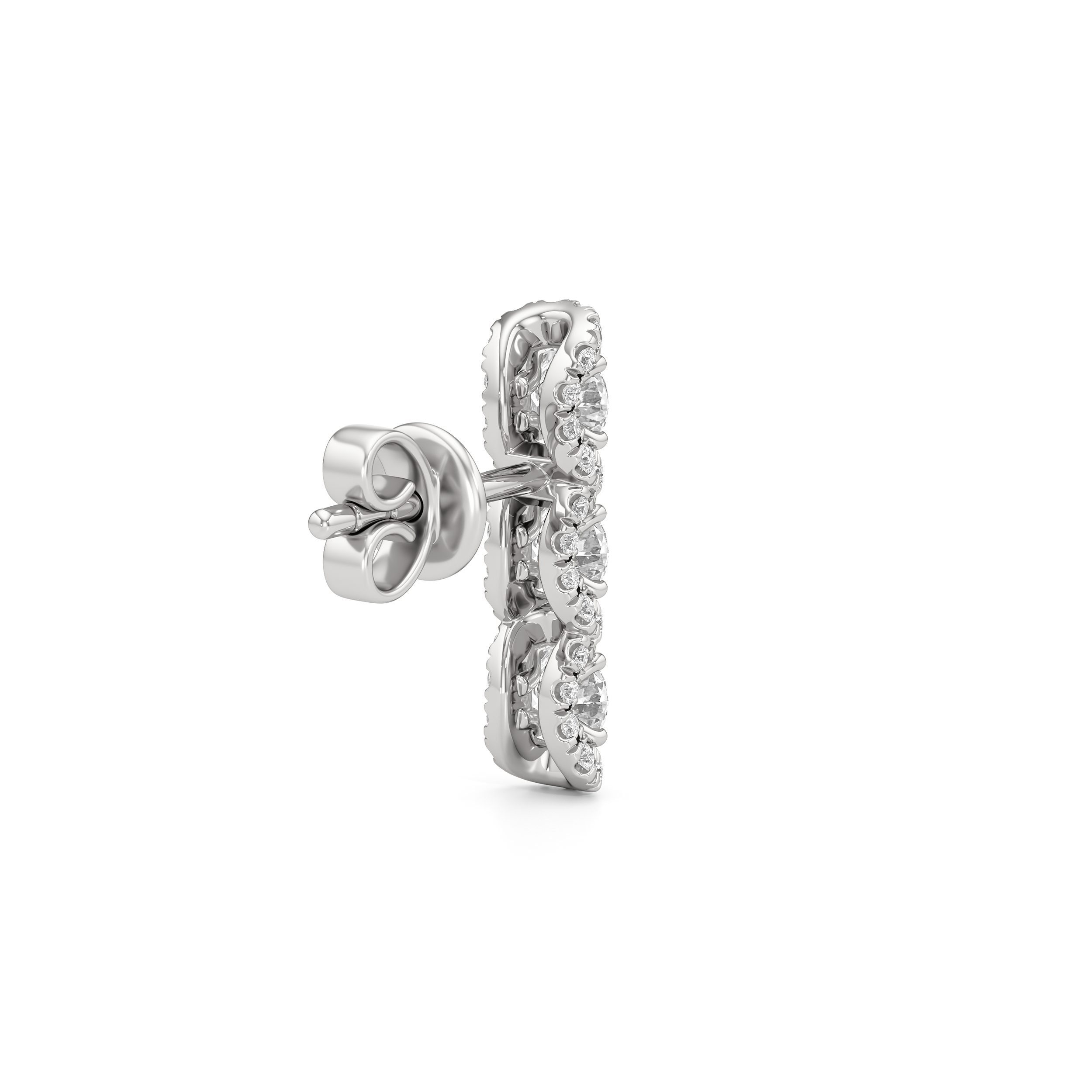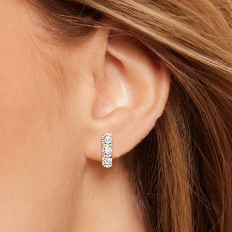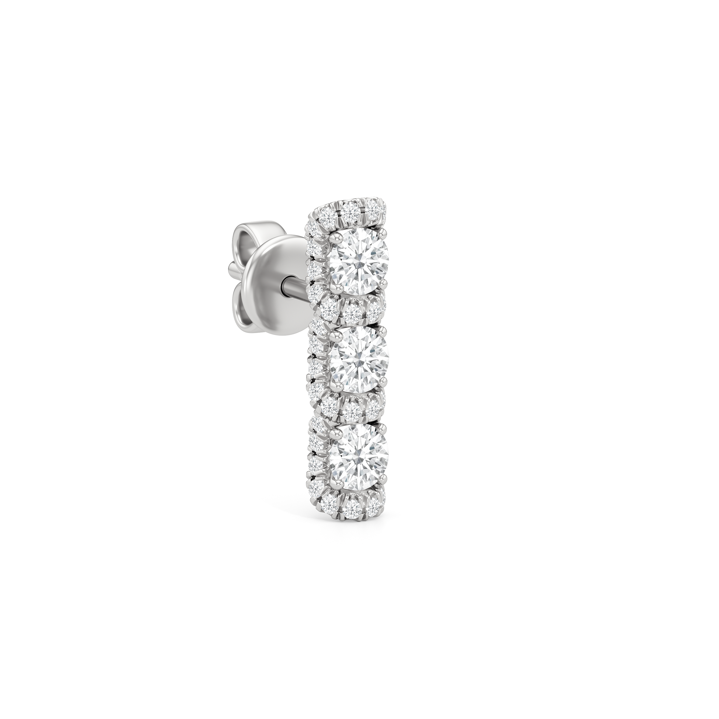 The Fulton Drop Studs play with rhythm and restraint. Three diamonds descend in a clean line, interrupted by wave-like pavé that bends light with every curve. Sculptural and precise, these danglers balance movement with control.