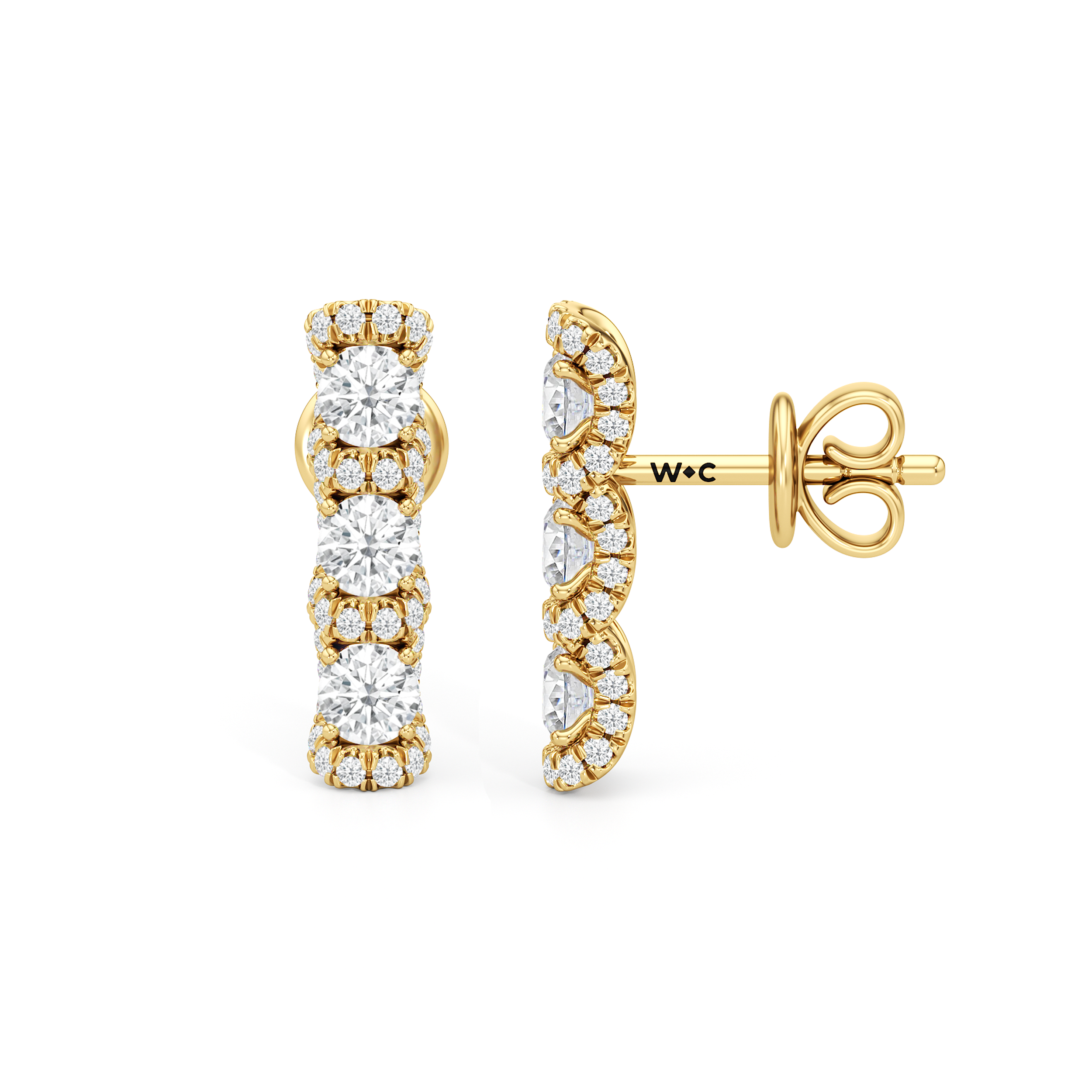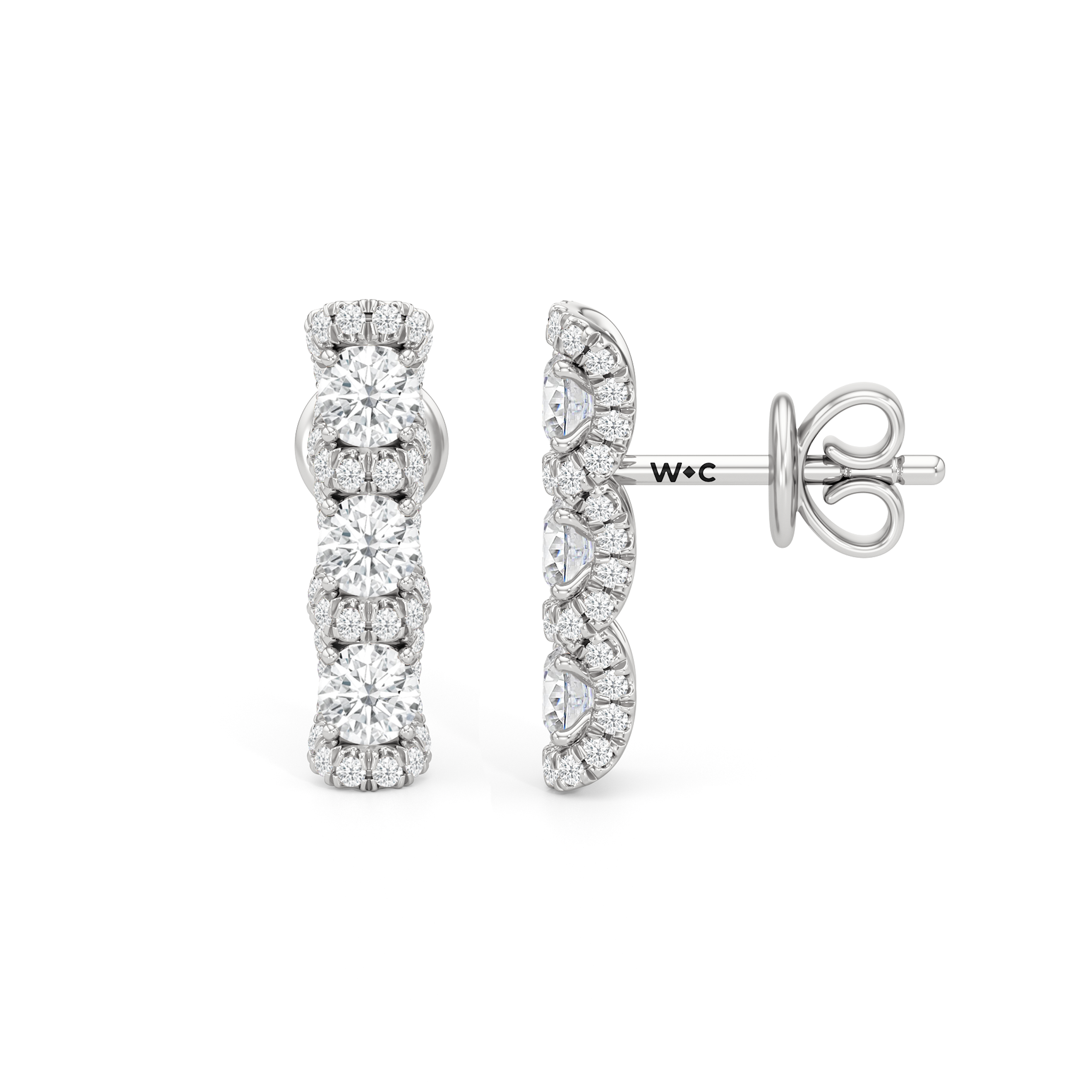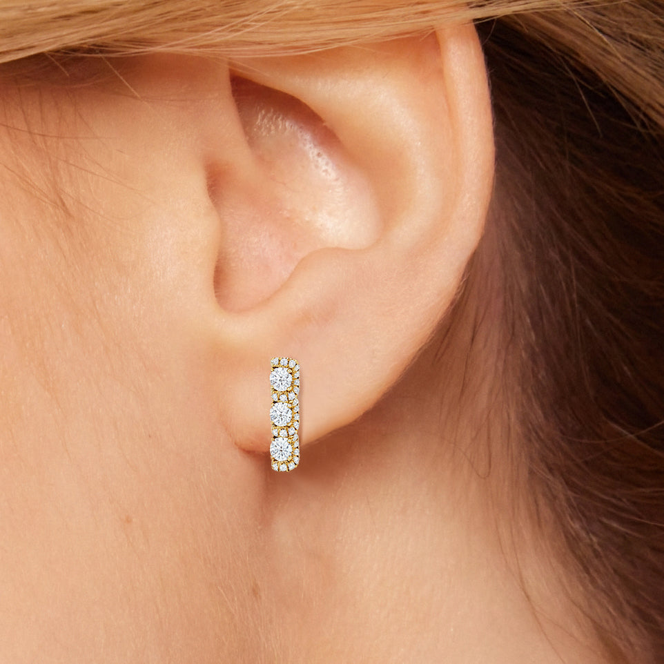 The Fulton Drop Studs play with rhythm and restraint. Three diamonds descend in a clean line, interrupted by wave-like pavé that bends light with every curve. Sculptural and precise, these danglers balance movement with control.