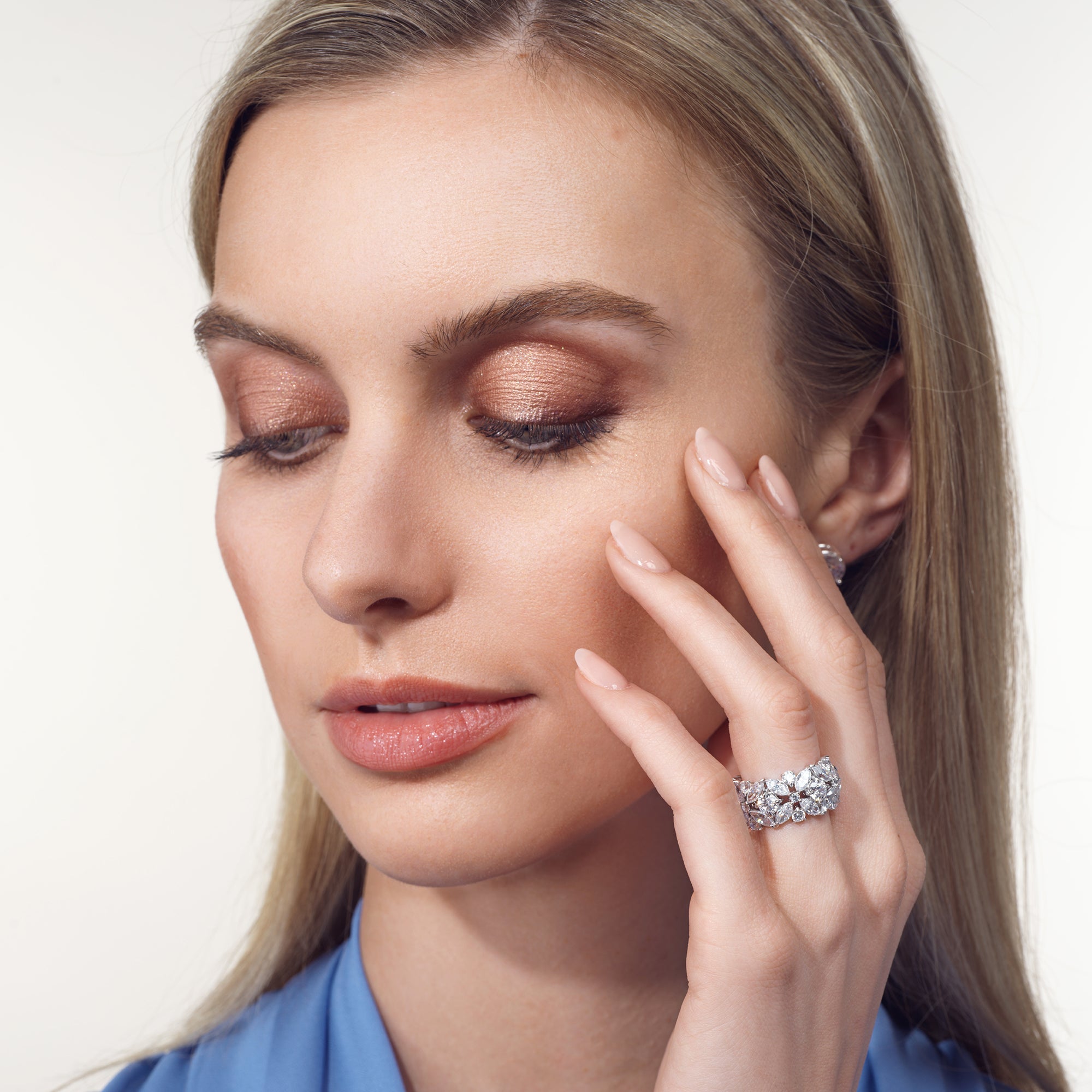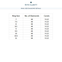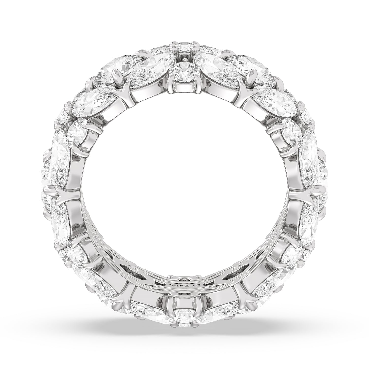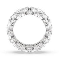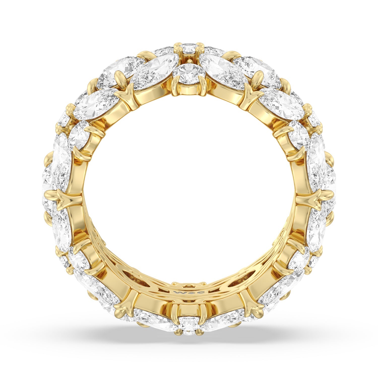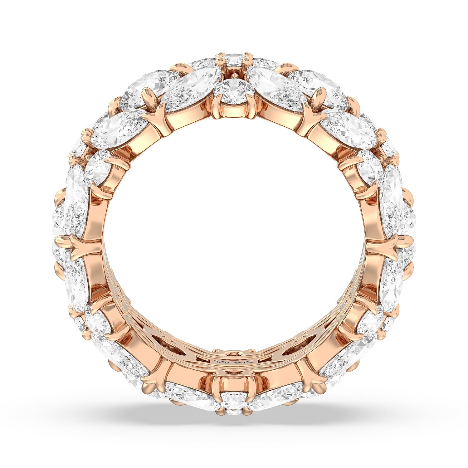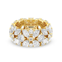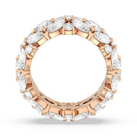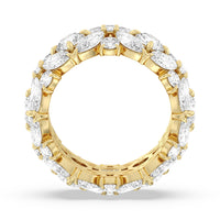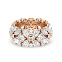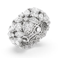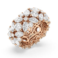 The Garden Eternity Ring will transport you to a vibrant, blooming garden where beauty and radiance emanate from every angle. Its band features a wide and tactile profile, detailed with numerous diamonds. The precious diamonds that generously cover the band are held securely by claw prongs, offering a visual spectacle that catches attention and garners admiration.
