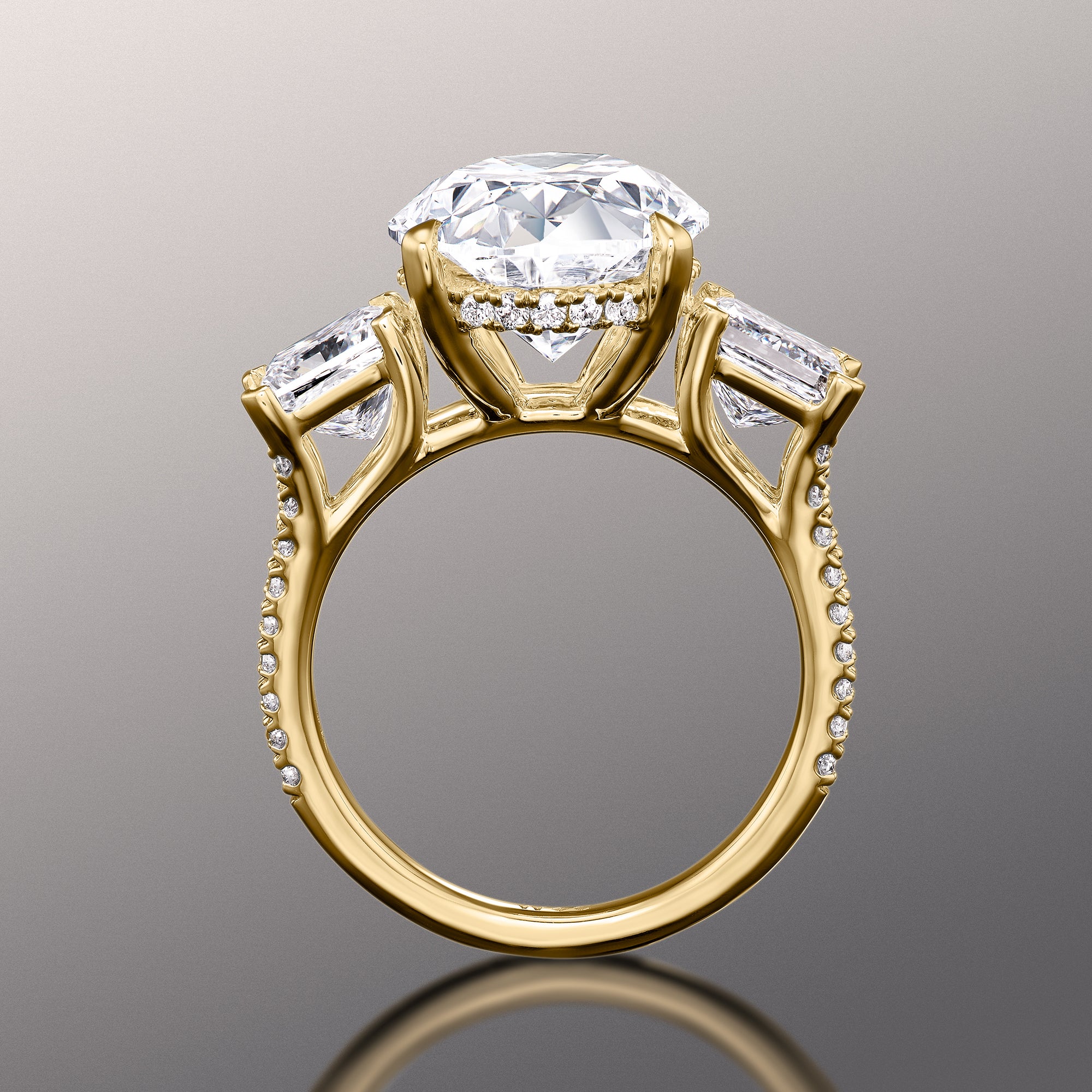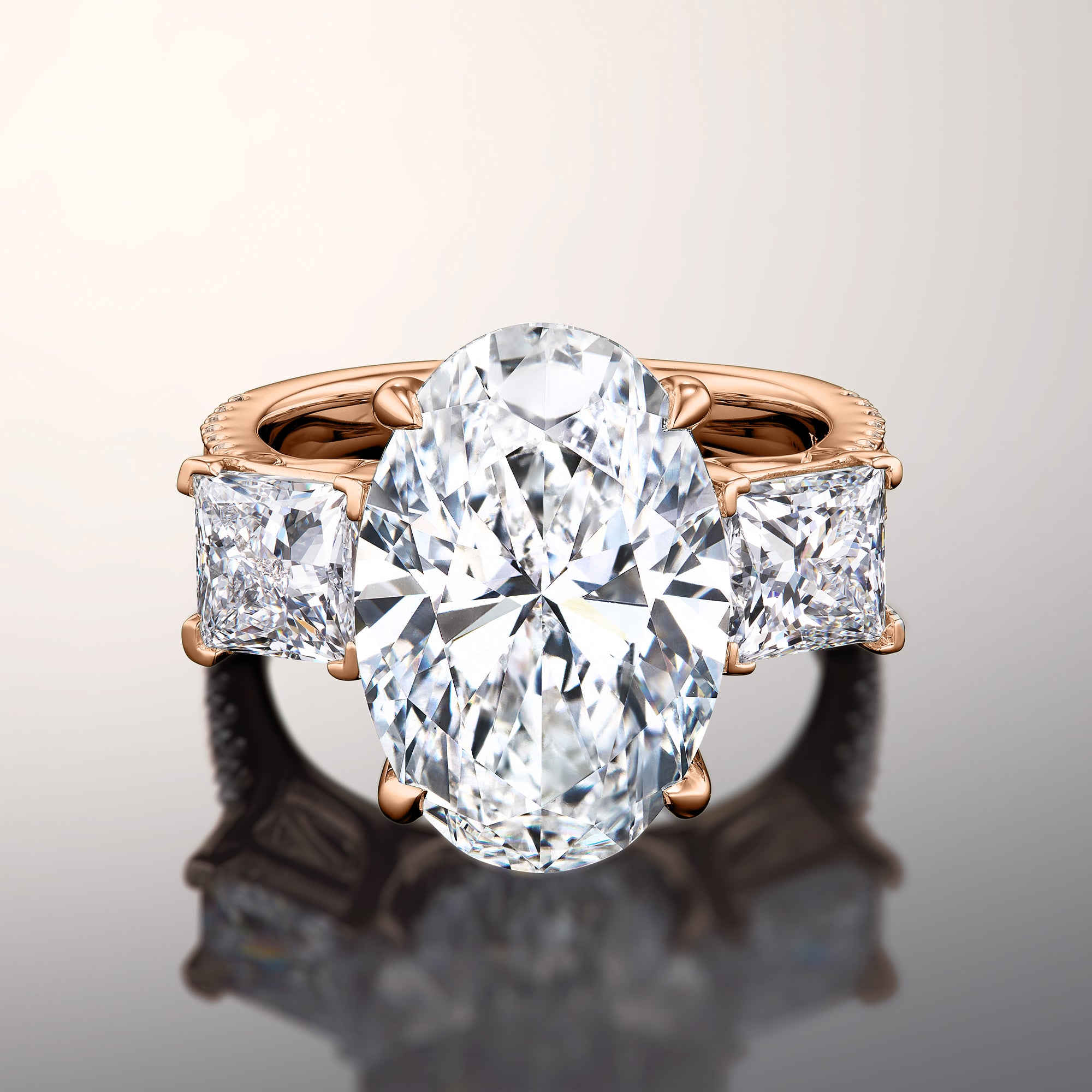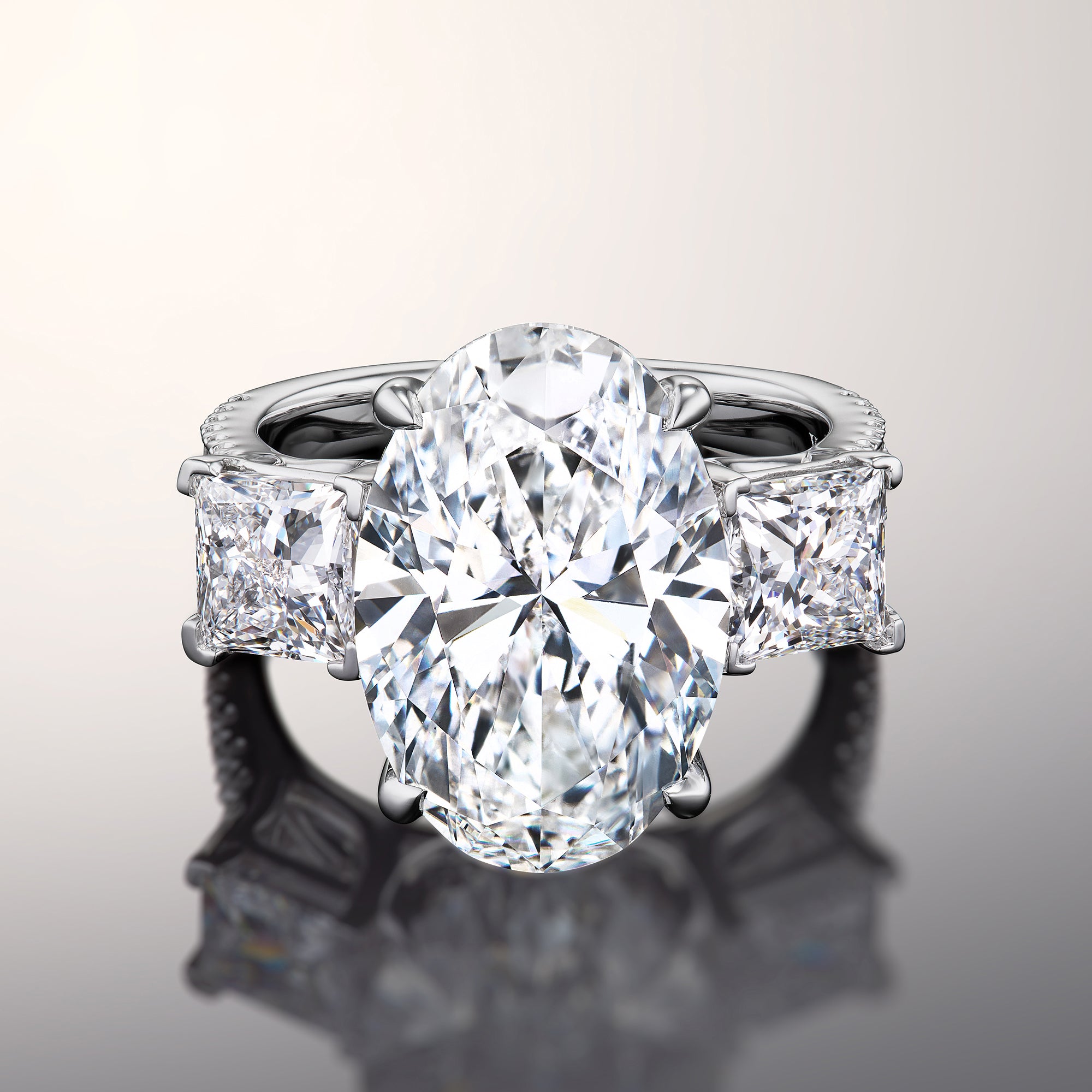 Embark on a symbol of love infused with high art and unequaled elegance. The design boasts an architectural form rendered according to the laws of proportion and perspective. At the center of the ring sits an oval diamond flanked by two princess-cut diamonds. The central gem is surrounded by a hidden halo that delivers an unexpected display of flash and sparkle. The ring's open gallery perfectly captures the beauty of the three main diamonds, ensuring the side view is as impressive as the top view.