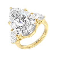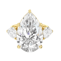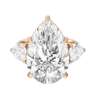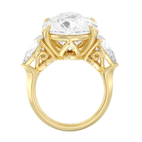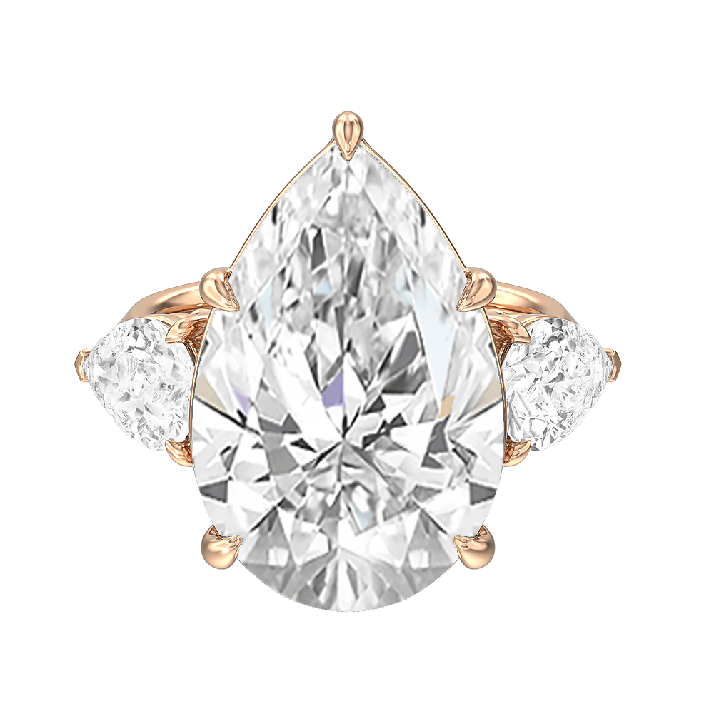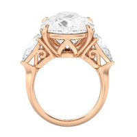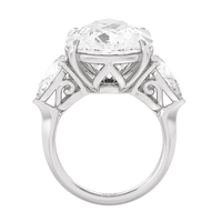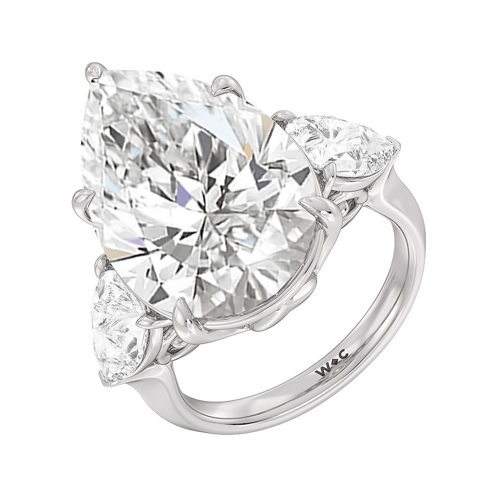 The Goya is a ring that is classical and unforgettable at the same time. Its sophisticated combination of pear and marquise diamonds certainly stands out, representing a unique marriage of tradition and modernity. This three-stone engagement ring carries a 15.0 ct pear diamond as its center stone and two 1.25 ct marquise diamonds as its side stones. Each stone is held in place by a claw prong basket, complemented by a decorative gallery. The knife-edge shank gives the ring a sharp, angled, and distinct appearance.