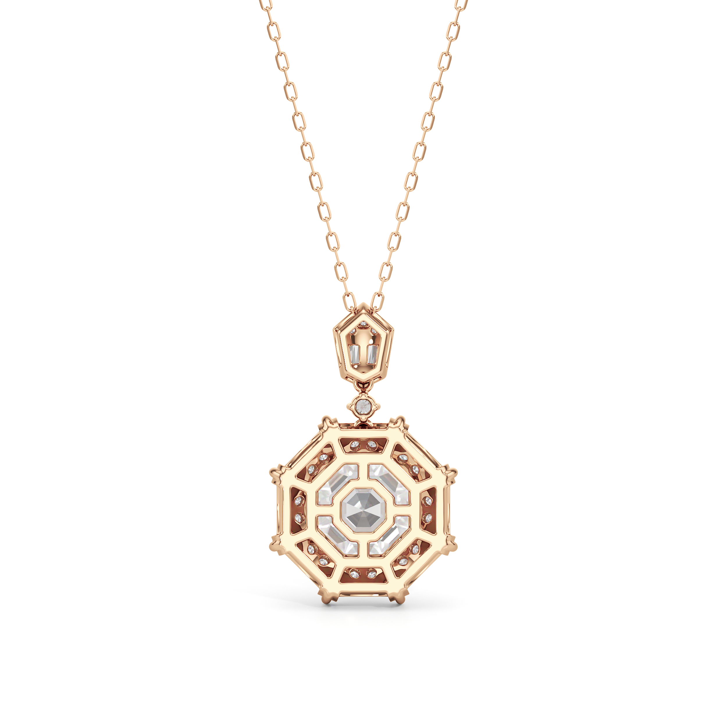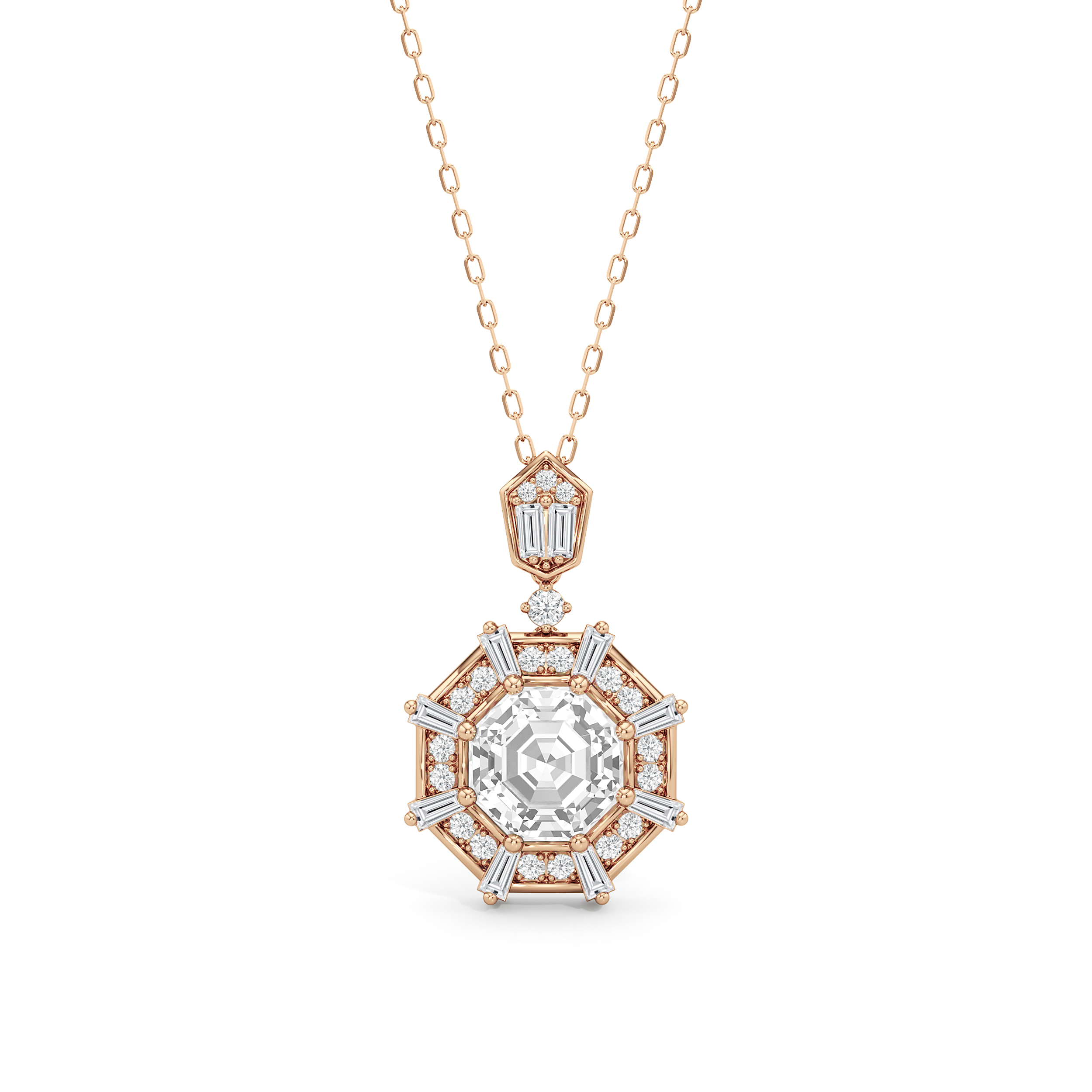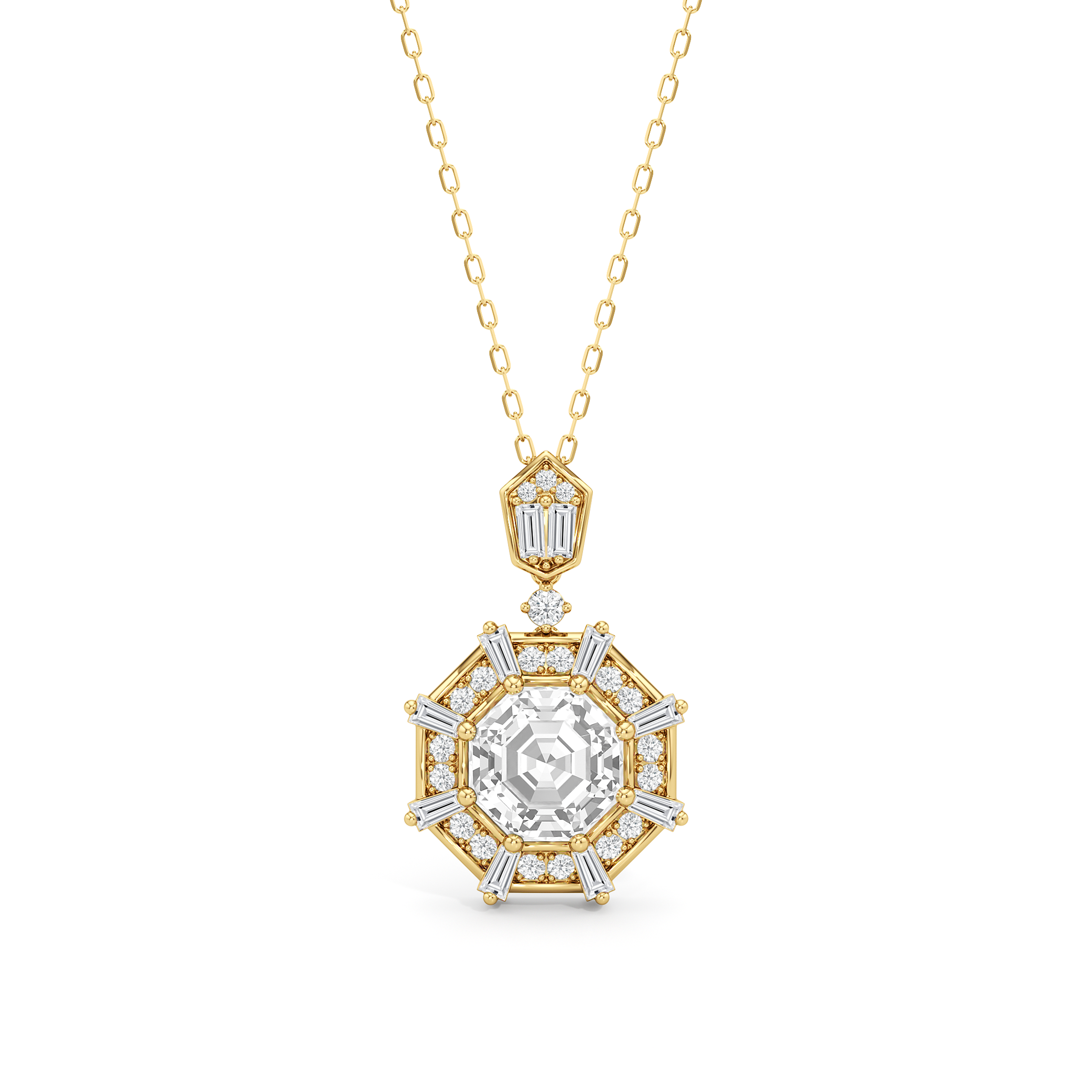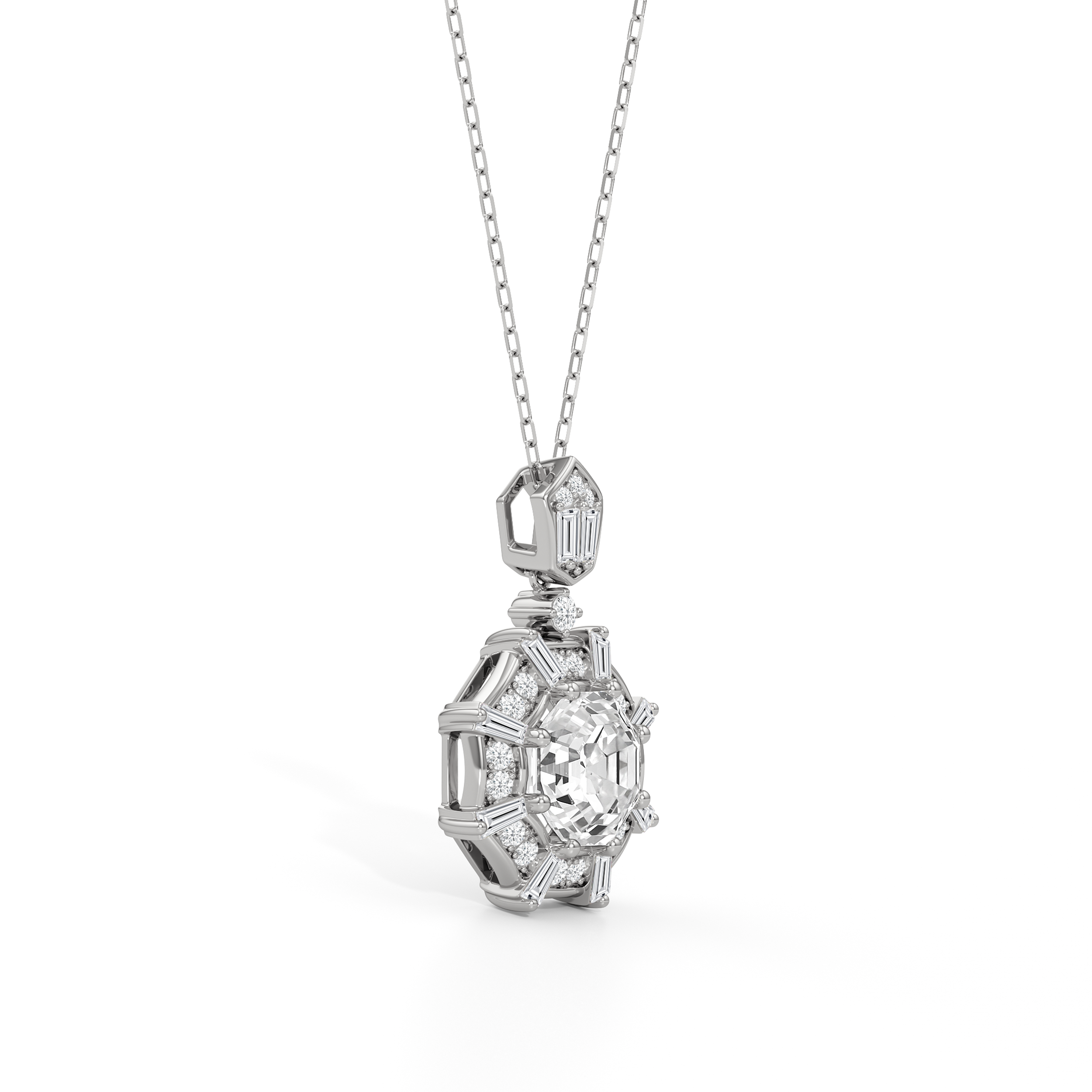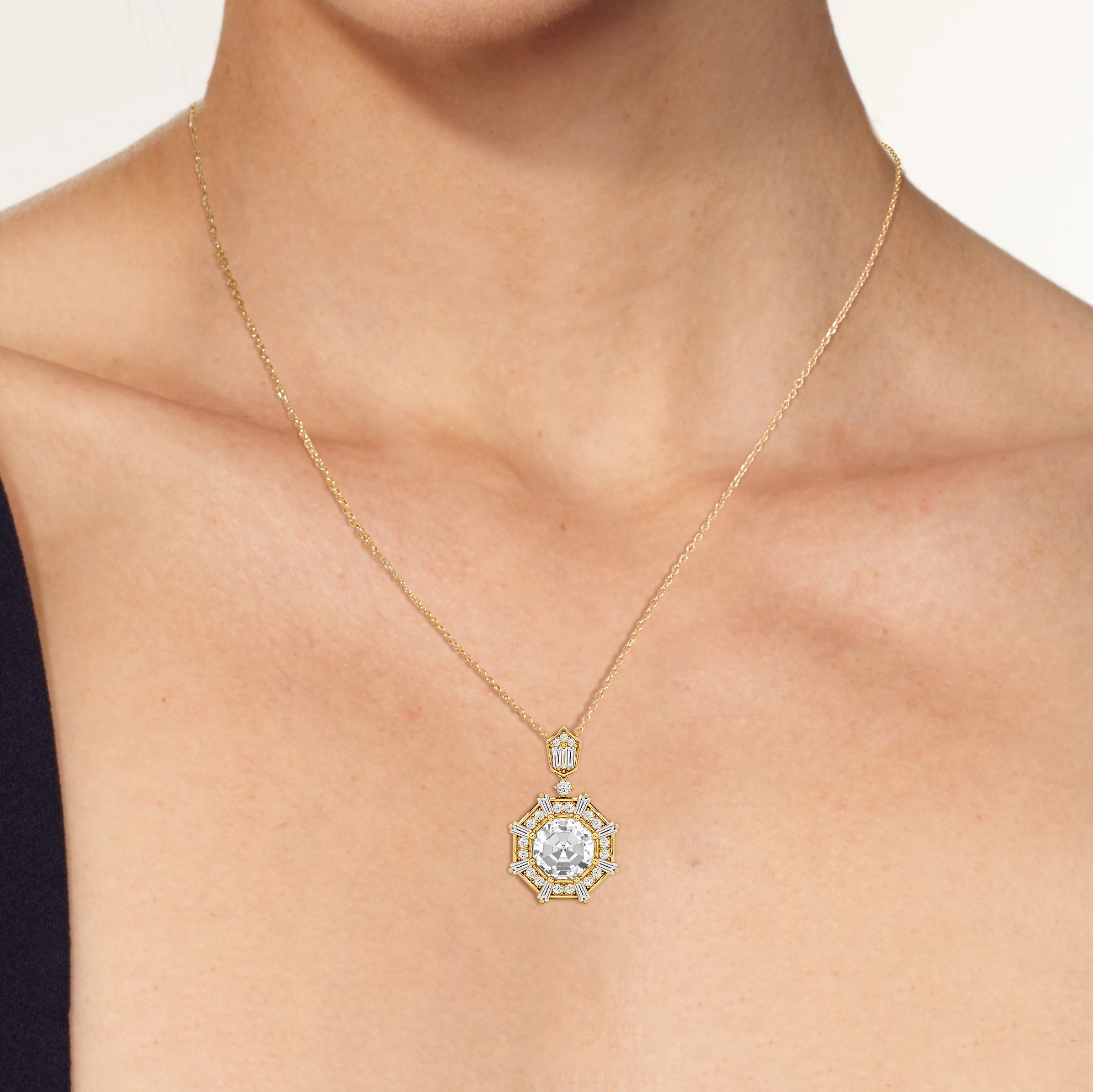 The design of the Guardian Necklace draws inspiration from the bold geometric form of the south tower of Detroit's Guardian Building, a prominent 40-story Art Deco structure. This piece features an octagon-cut stone resting within an eight-sided frame. The frame is detailed with radiating baguette-cut diamonds set between pairs of round diamonds. The striking octagonal pendant is linked to a round diamond, which elegantly suspends from a polygonal bail adorned with additional baguette and round diamonds. Together, these elements create a piece that captures the graphic clarity of Art Deco design.