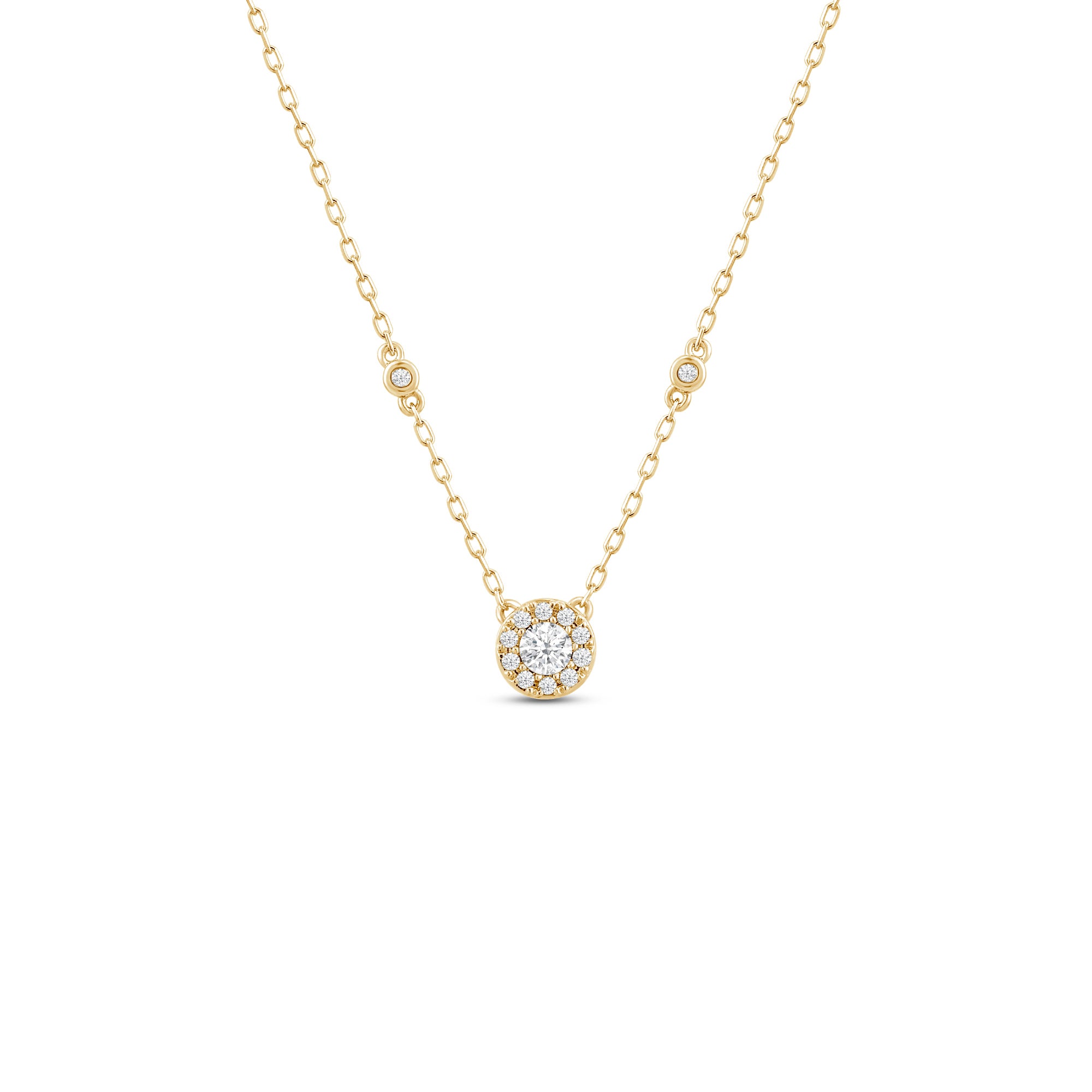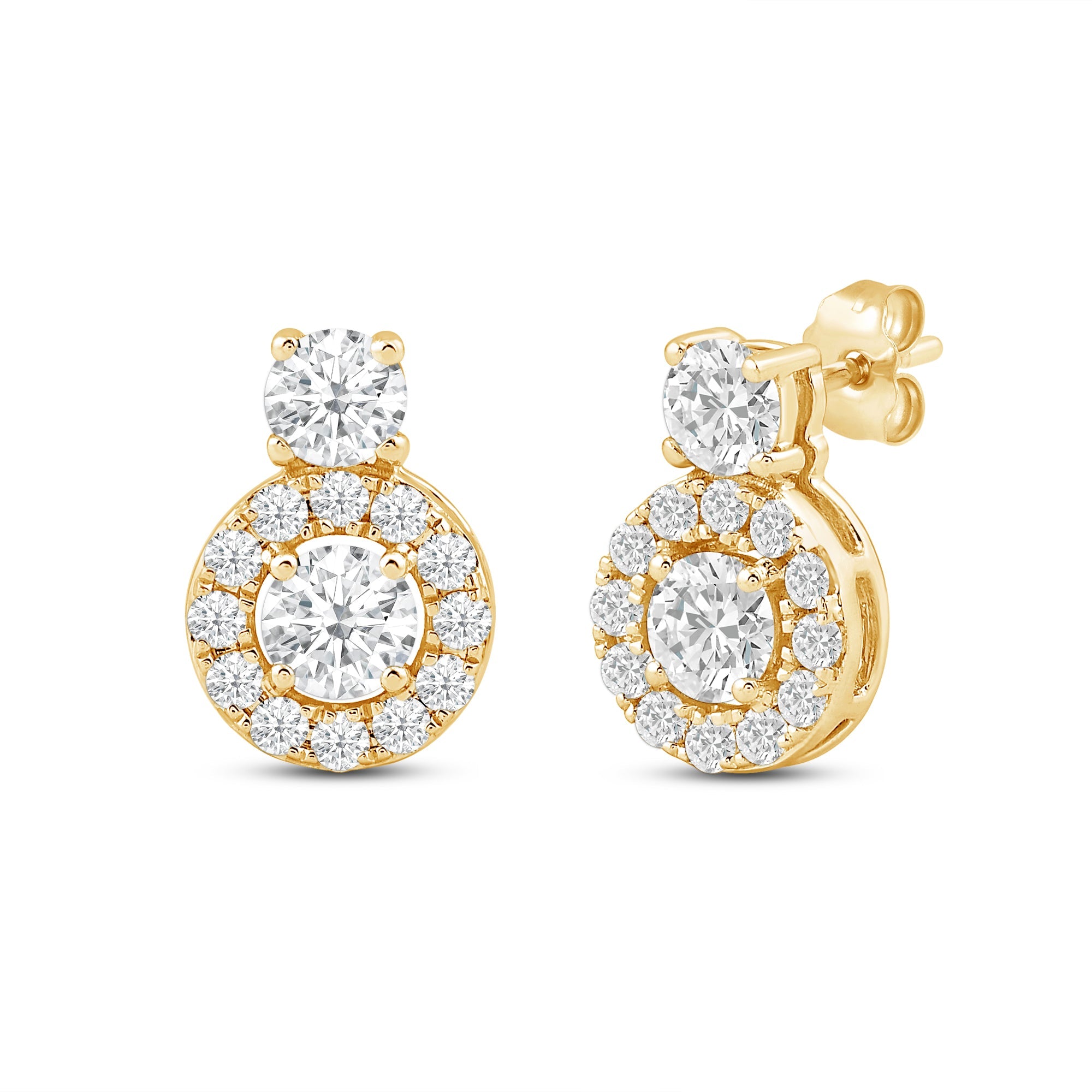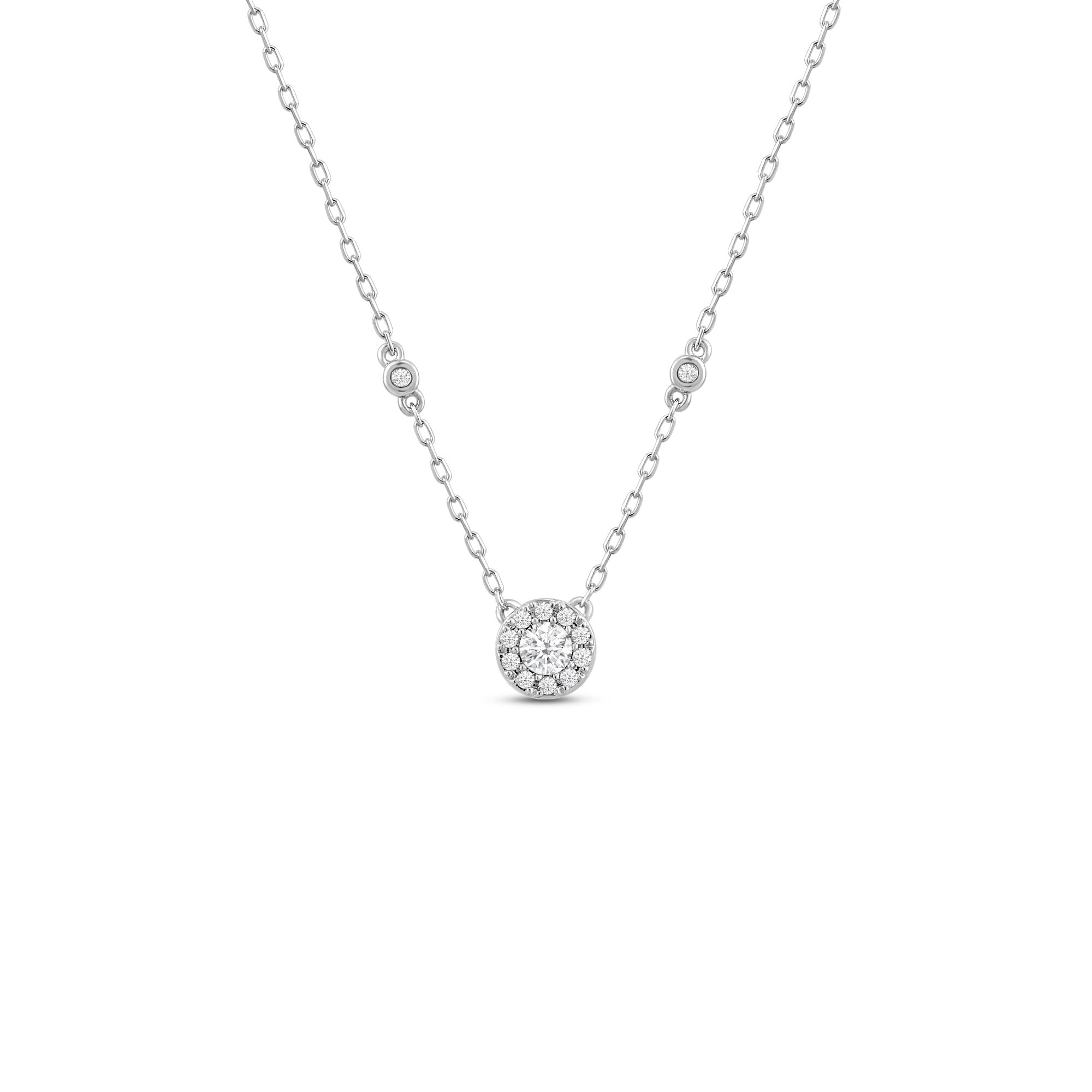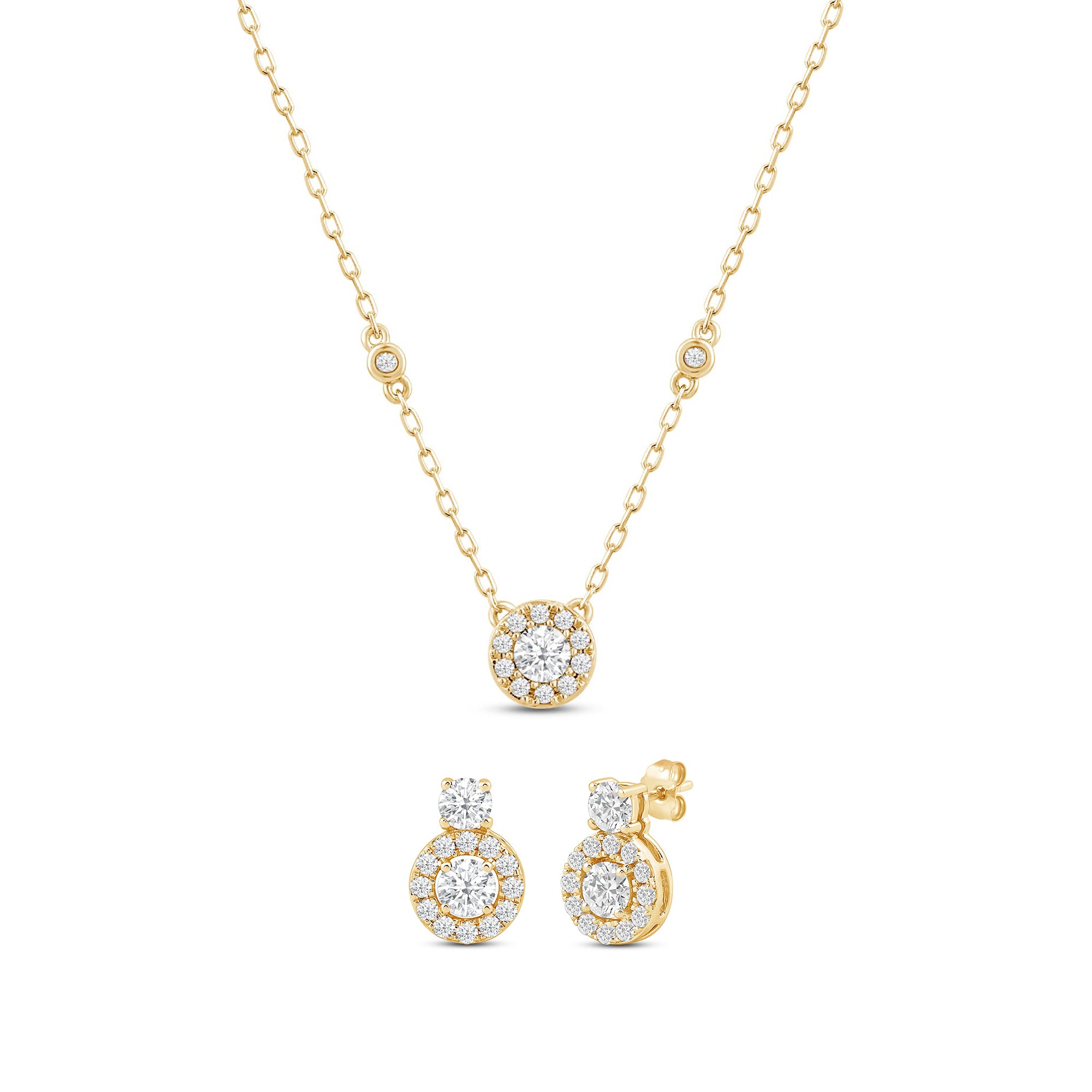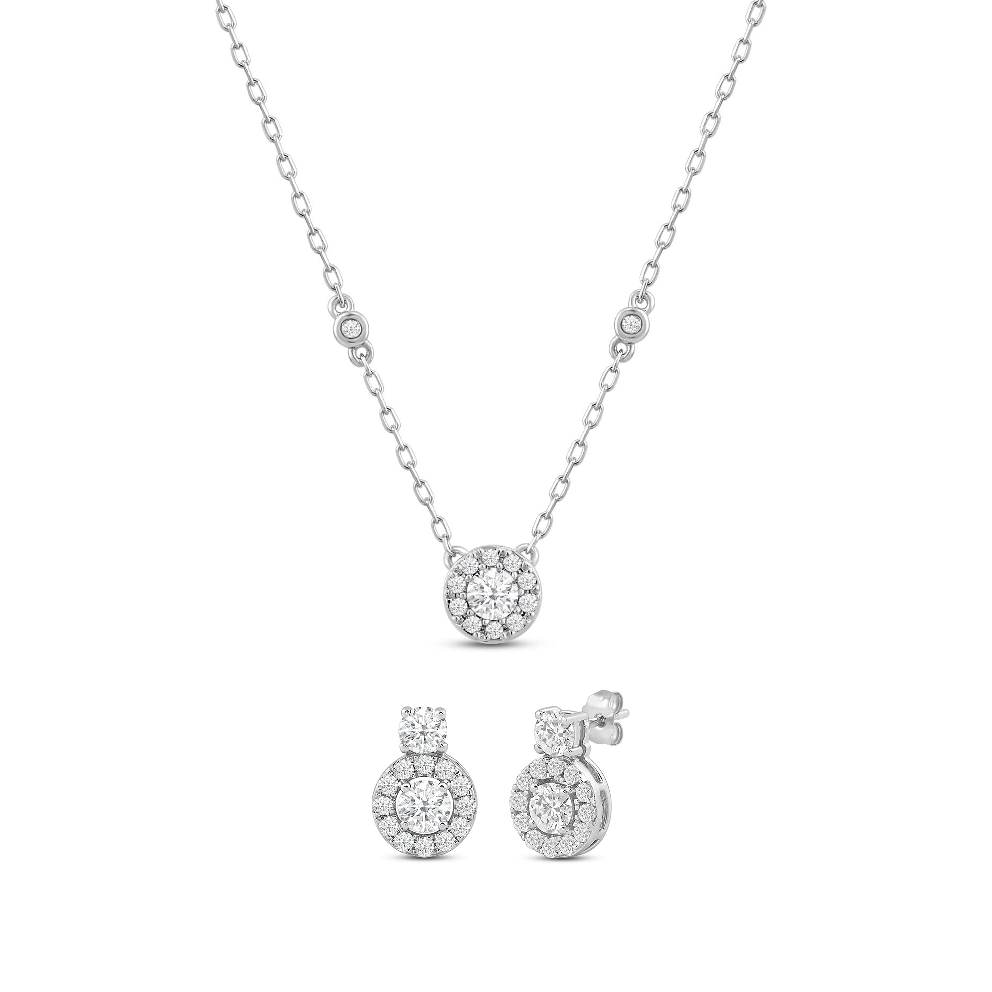 The Halo Set is the perfect gift for the one who loves extra sparkle. This set is comprised of a pair of diamond earrings and a diamond necklace. The earrings feature two round diamonds, with one surrounded by a halo of smaller diamonds. The pendant has a round diamond center framed by a diamond halo.
