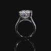 While first appearing deceptively simple, this design proves to be a stylistic choice for a symbol of love. The ring encompasses a cathedral shank with tapered shoulders lined with two rows of brilliant diamonds. The center stone is a stunning oval diamond, held firmly in place by a four-prong setting and surrounded by a hidden halo. A diamond-encrusted bridge offers extra flair to the band.