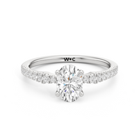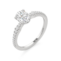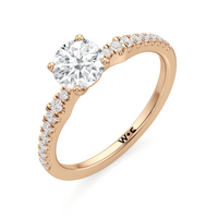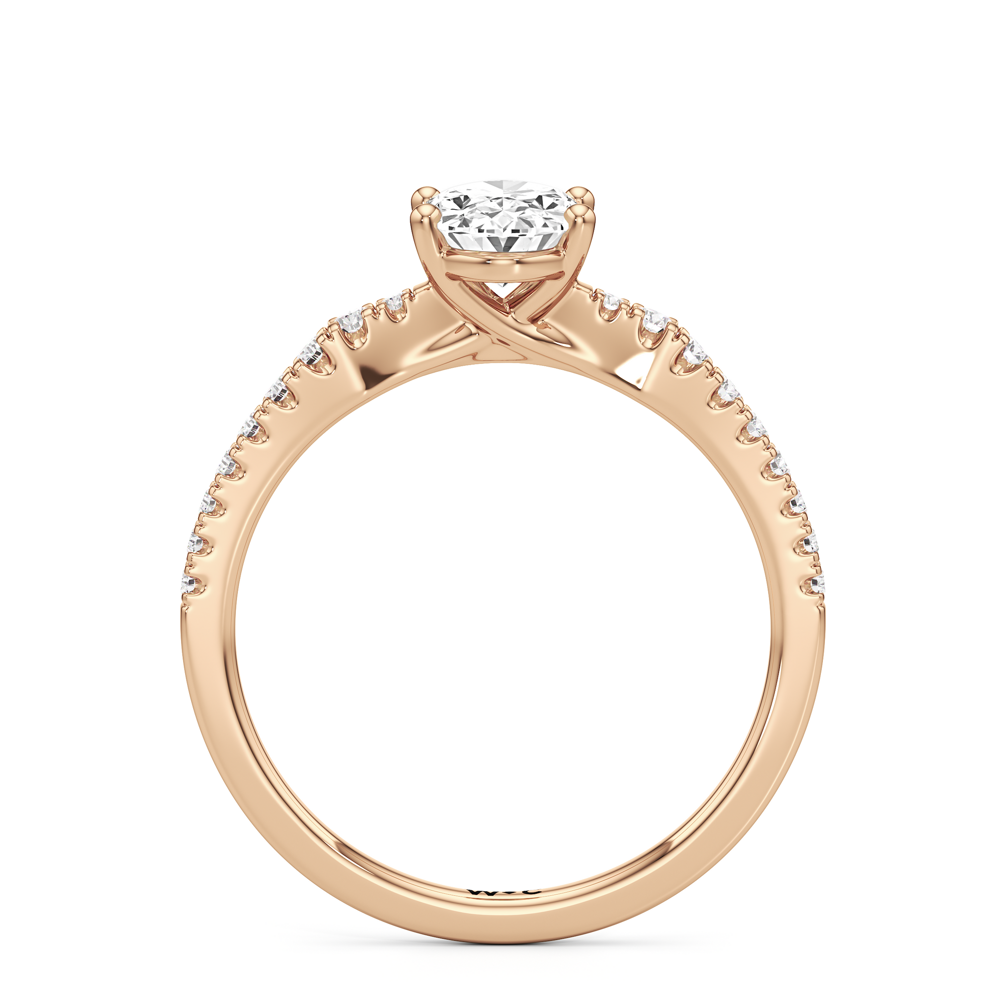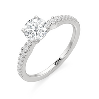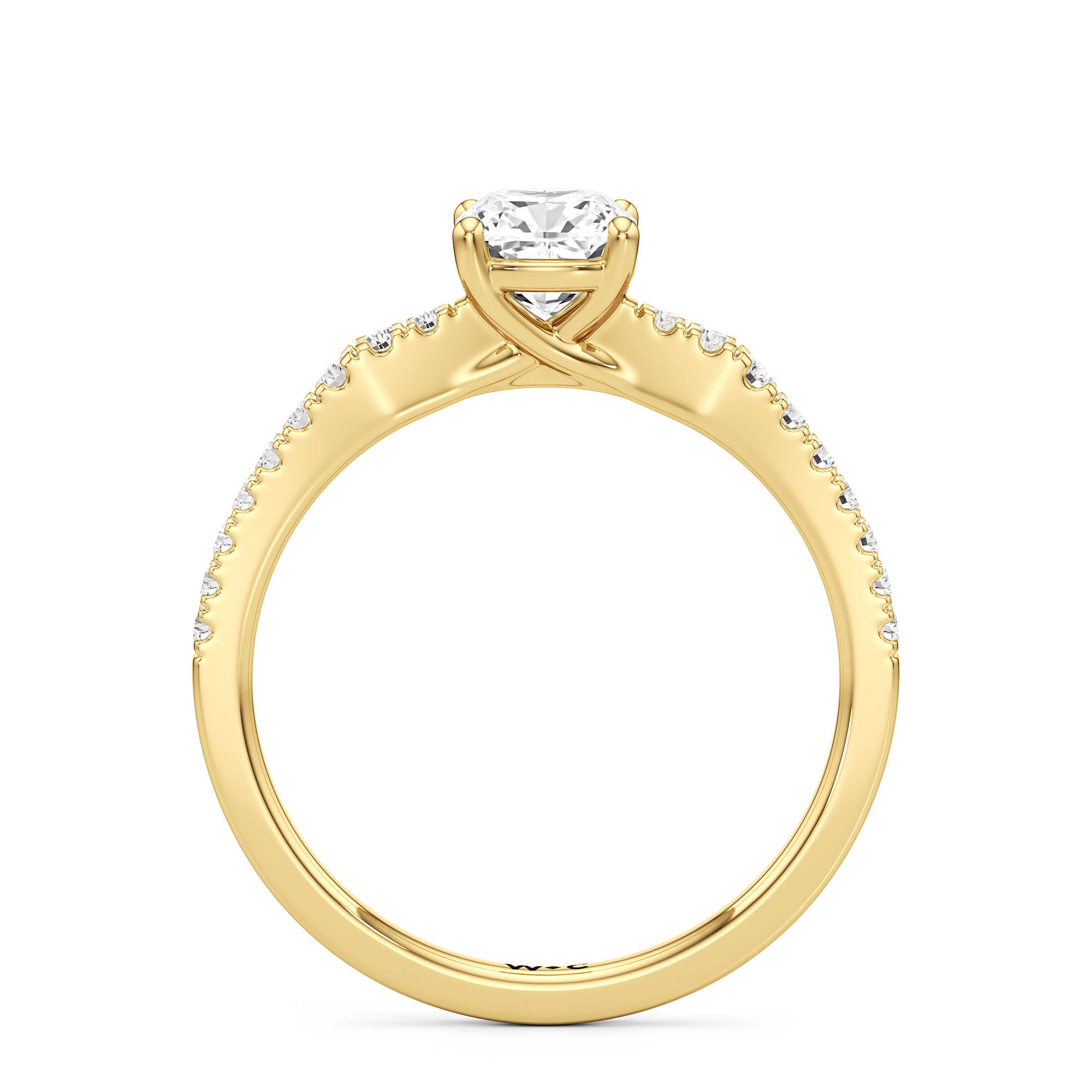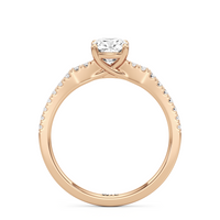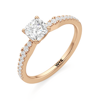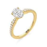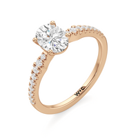 The Hazel Engagement Ring presents an elevated take on a classic solitaire. It is designed with a pinched shank topped with striking diamond centre. The focal gem is held in place by a cross-over prong setting. The band's shoulders feature an angular profile complemented by the radiant shine of pave diamonds. This ring's streamlined style embraces modernity and minimalism without veering too far away from tradition.