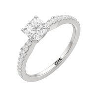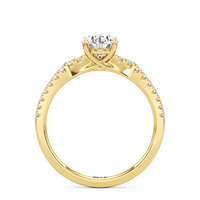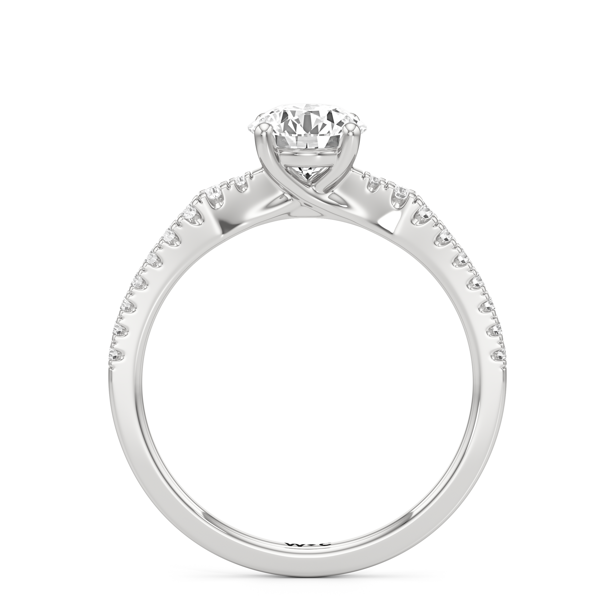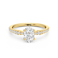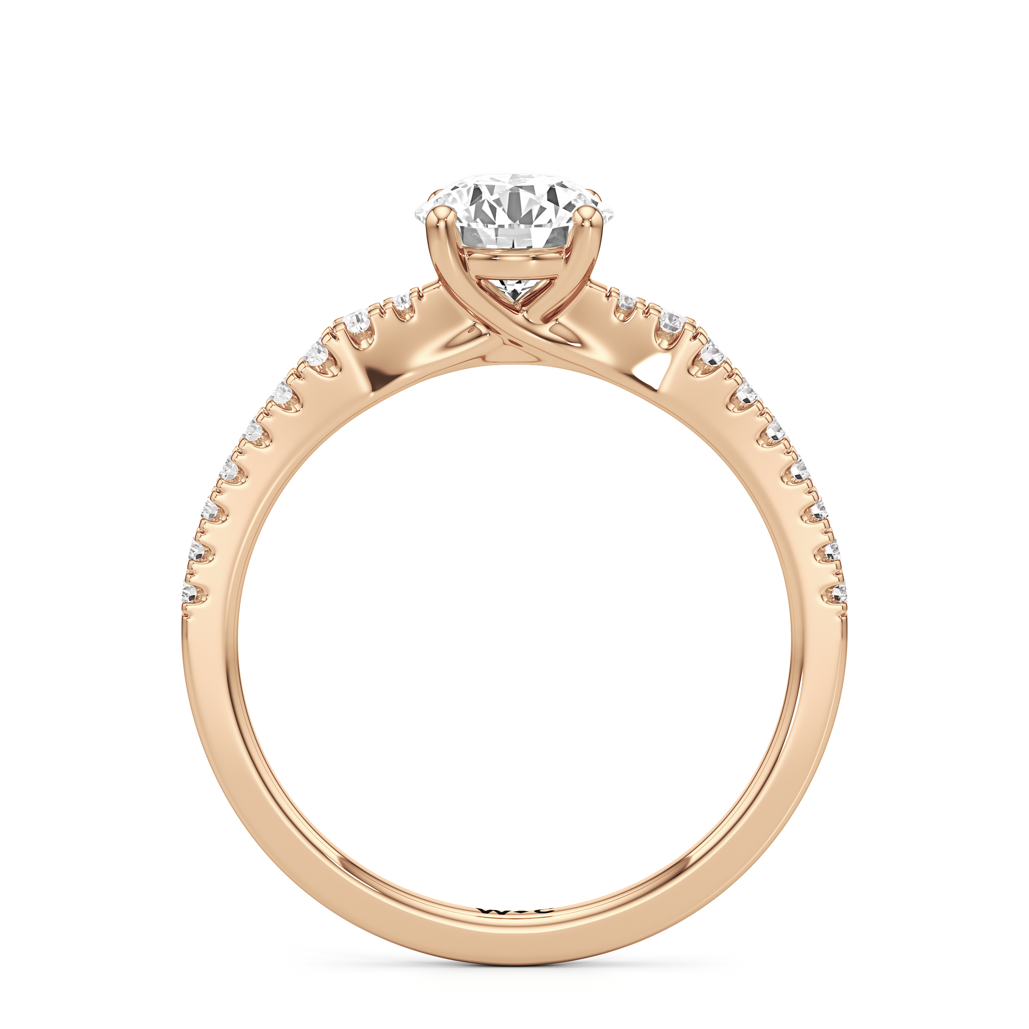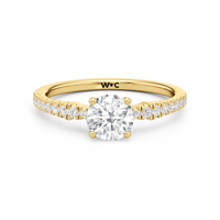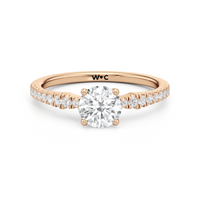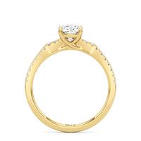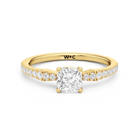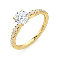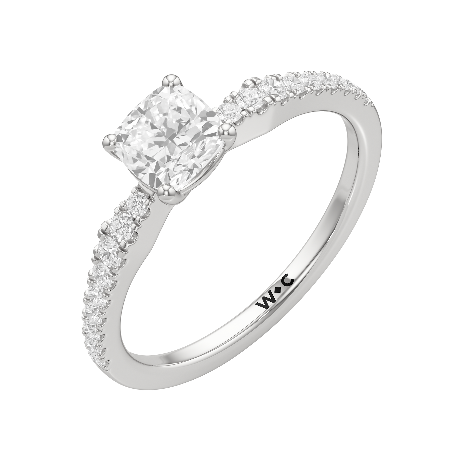 The Hazel Engagement Ring presents an elevated take on a classic solitaire. It is designed with a pinched shank topped with striking diamond centre. The focal gem is held in place by a cross-over prong setting. The band's shoulders feature an angular profile complemented by the radiant shine of pave diamonds. This ring's streamlined style embraces modernity and minimalism without veering too far away from tradition.