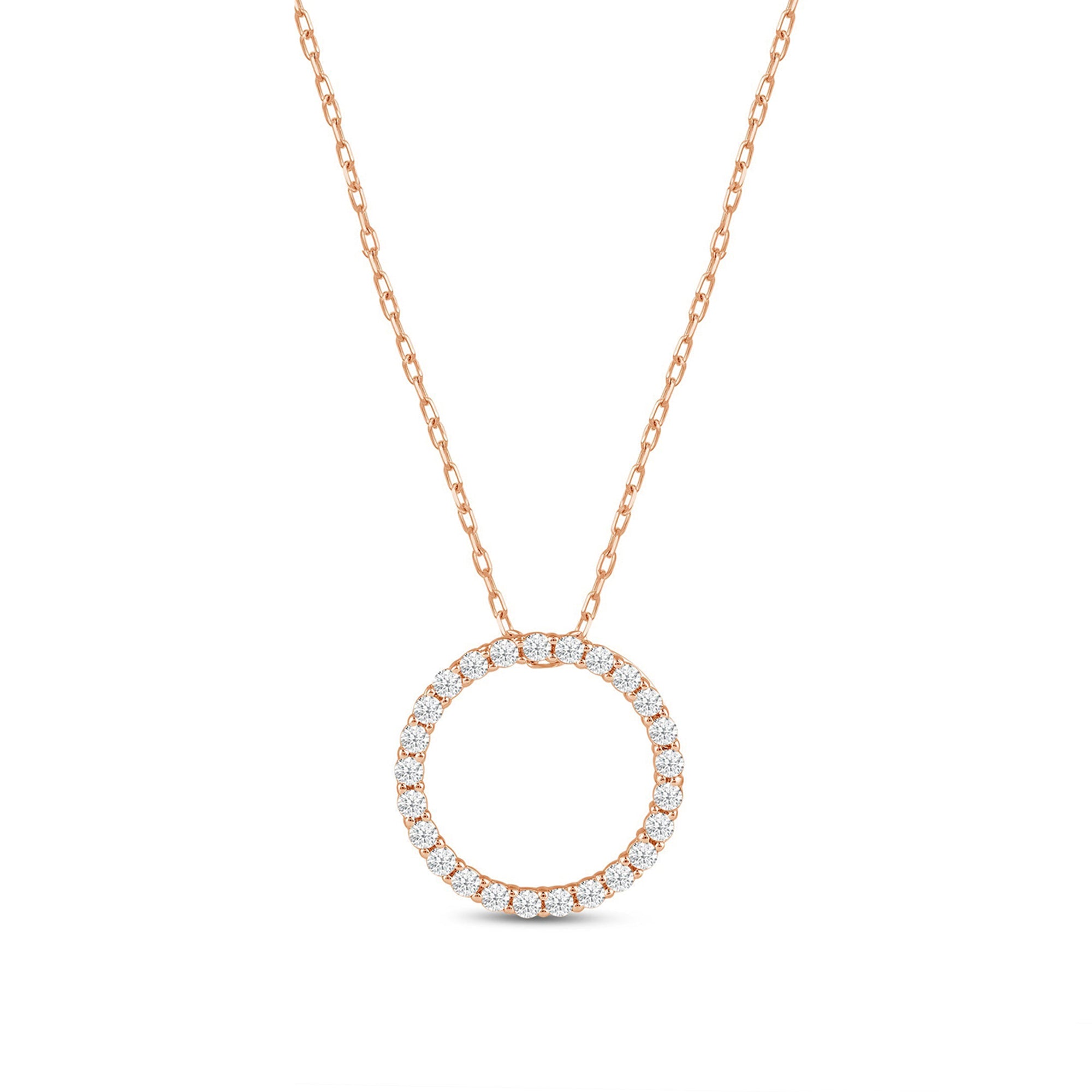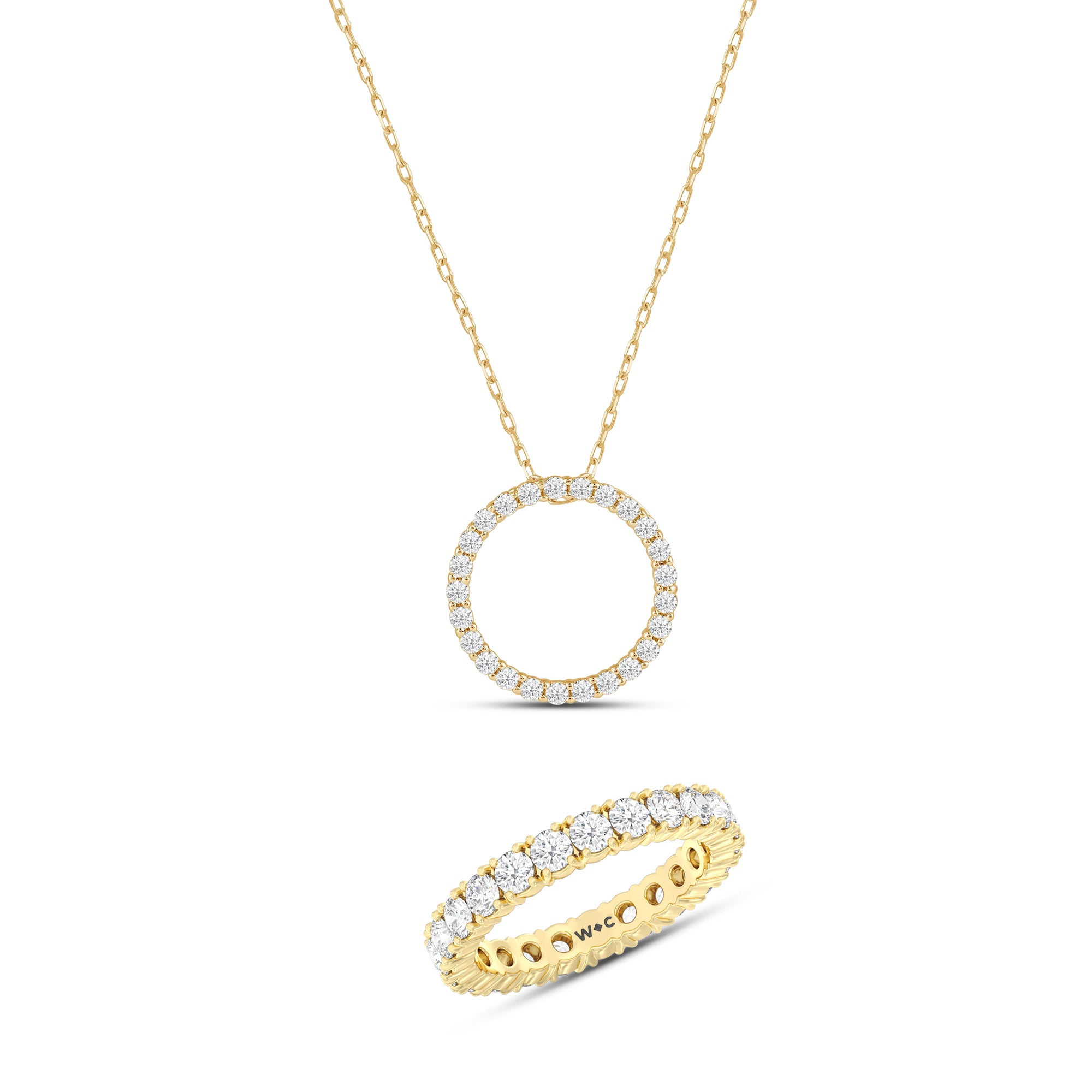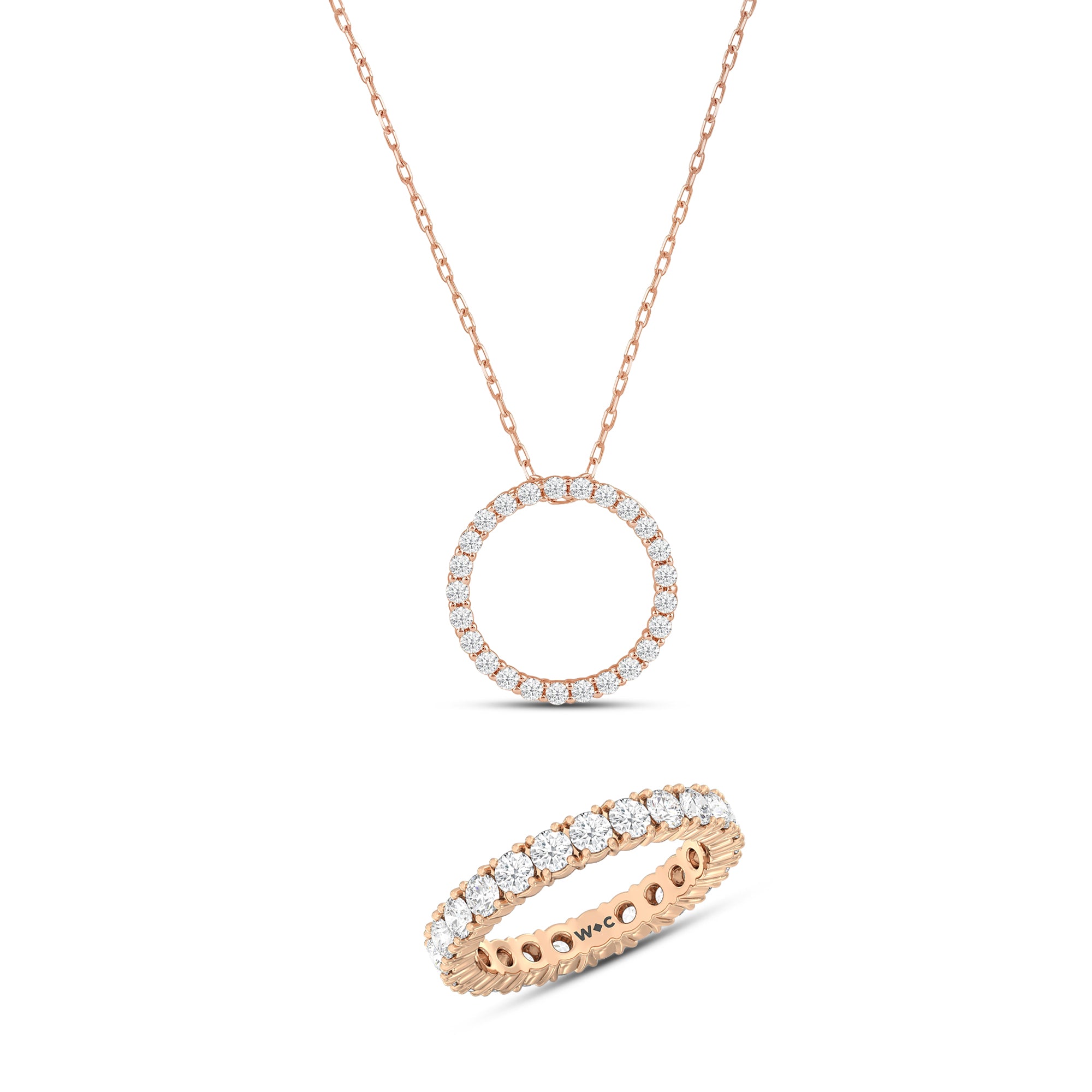 This minimalistic jewelry set complements any outfit. The duo features an eternity ring with carefully chosen diamonds covering its entire circumference. The necklace's pendant is a ring outline of more petite round diamonds. Effortlessly versatile, the necklace and the ring can be worn alone or harmoniously paired together.