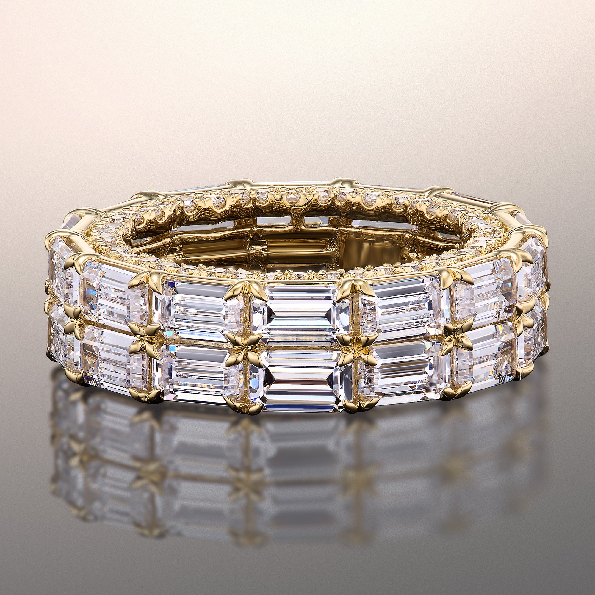 An undoubtedly sophisticated and bold choice. This ring features two rows of emerald-cut diamonds running along the band's circumference. Bringing an extra dazzling effect to the ring is a scalloped detail on the shank's inner edge, fully dotted with round diamonds. Pick this ring if you're looking for a statement-making jewelry gift for the discerning maximalist in your life.