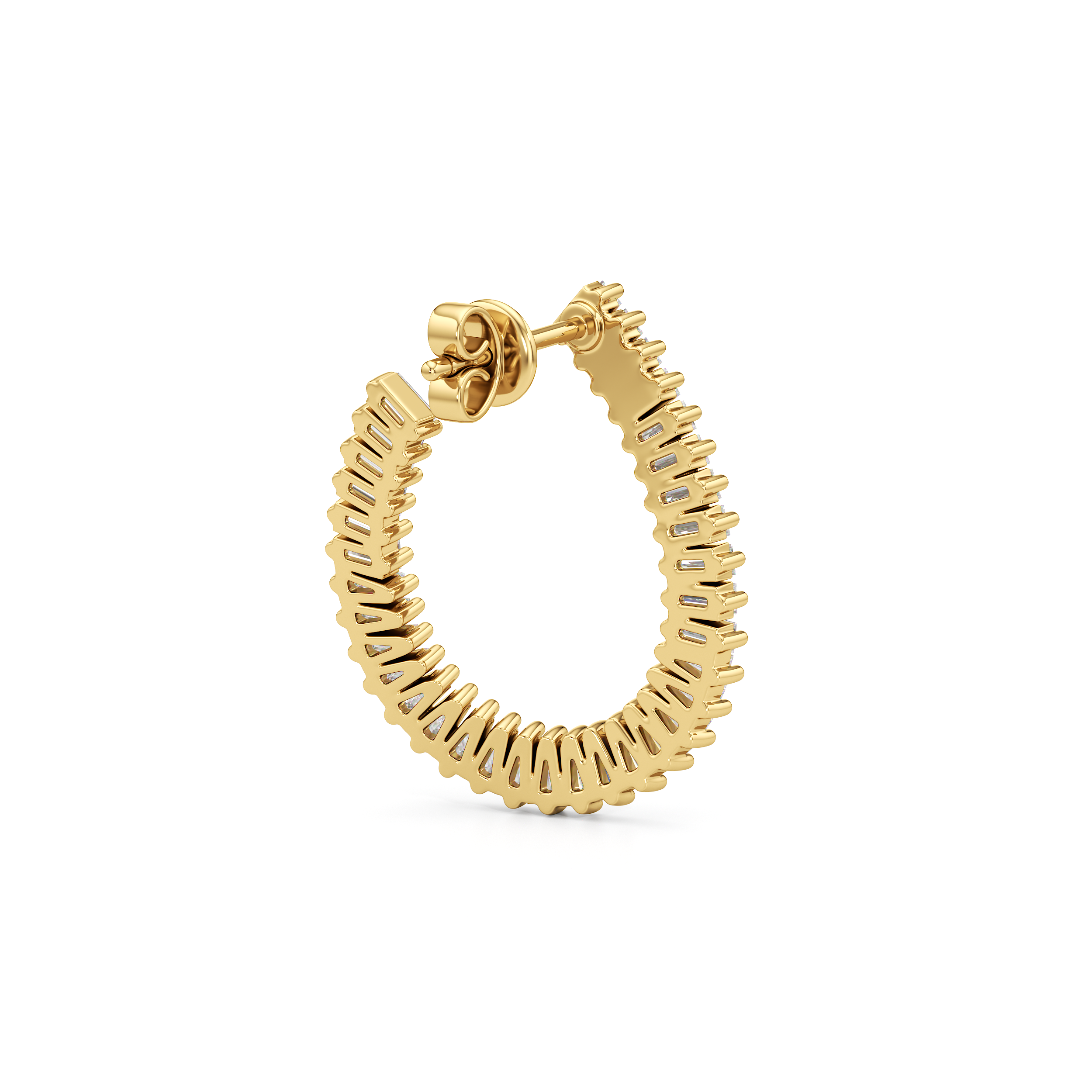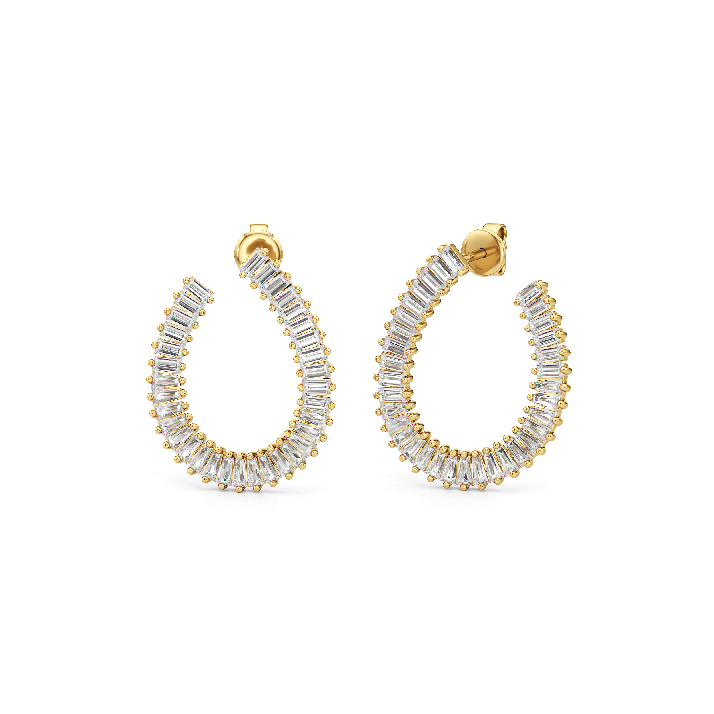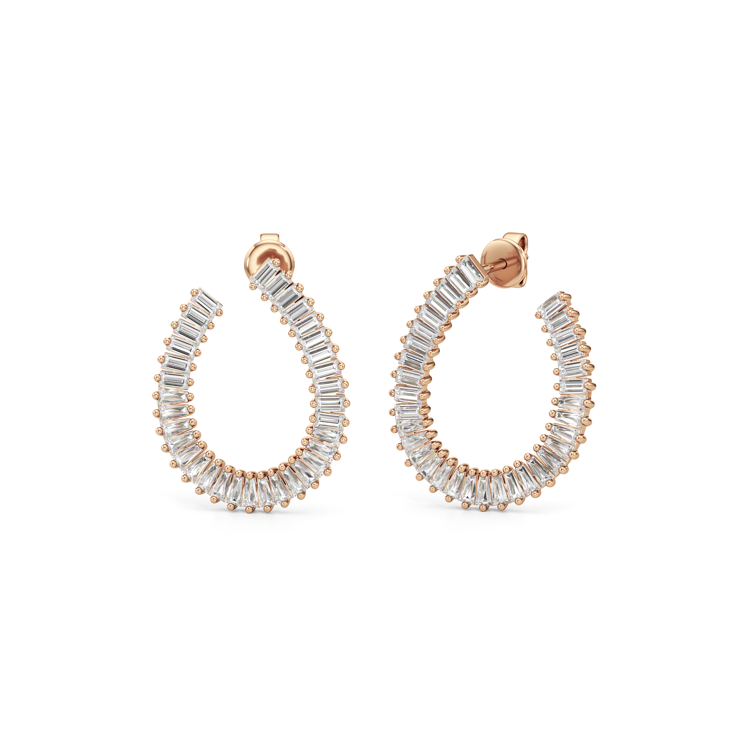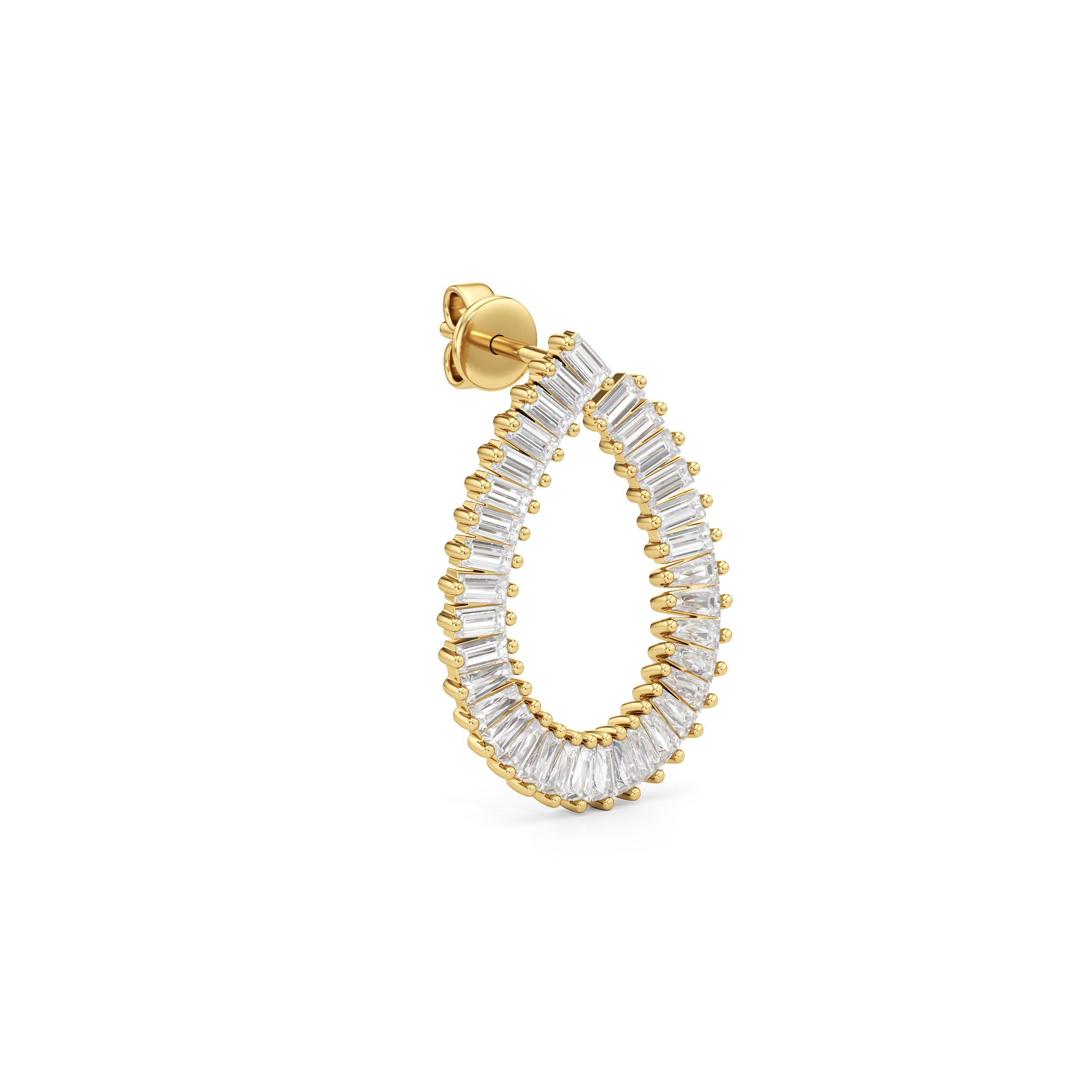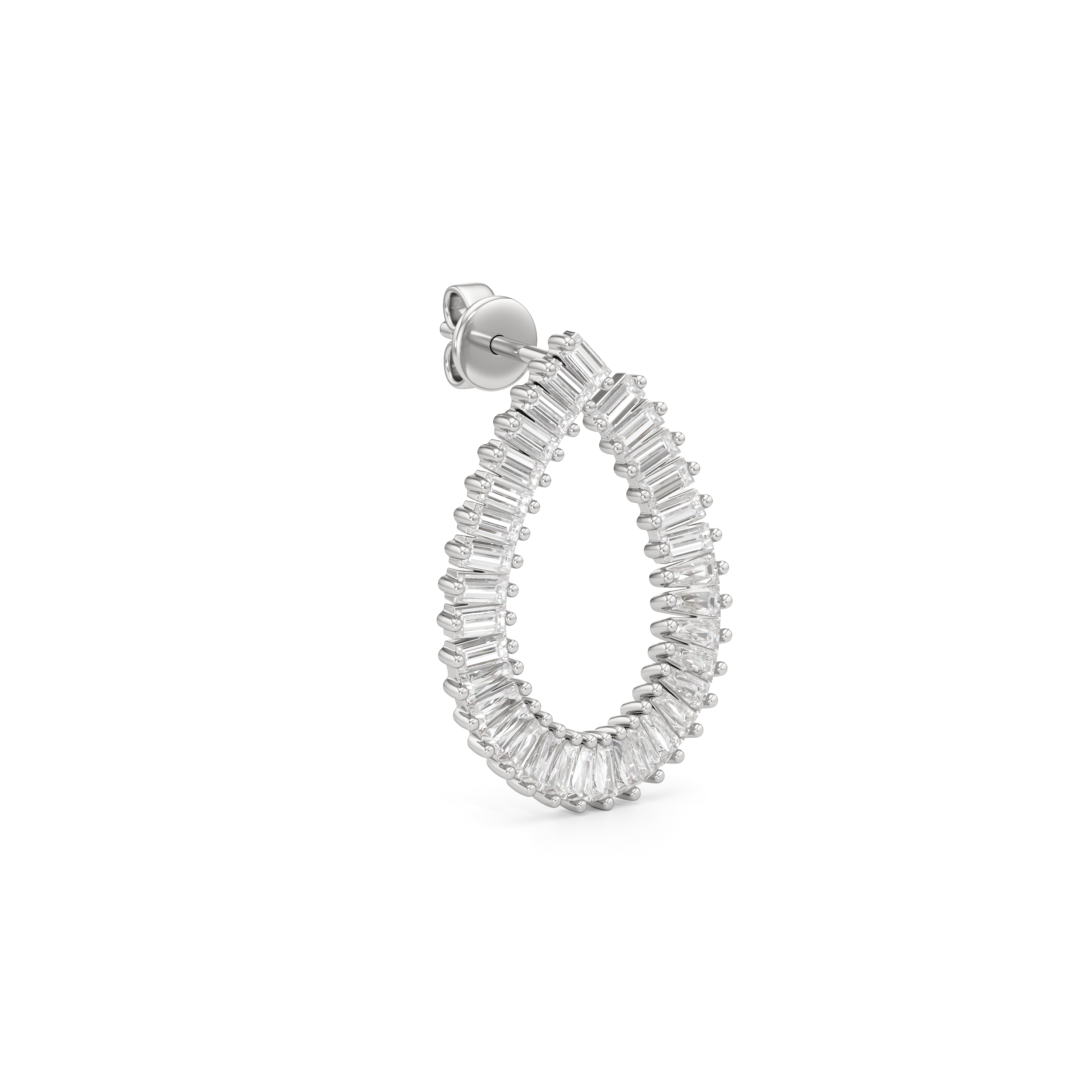 Round and round the baguette diamonds go. This pair of earrings showcases step-cut diamonds in a mesmerizing configuration. The precise placement of each precious stone accentuates its brilliance, resulting in a clean and refined aesthetic that elevates any ensemble.
