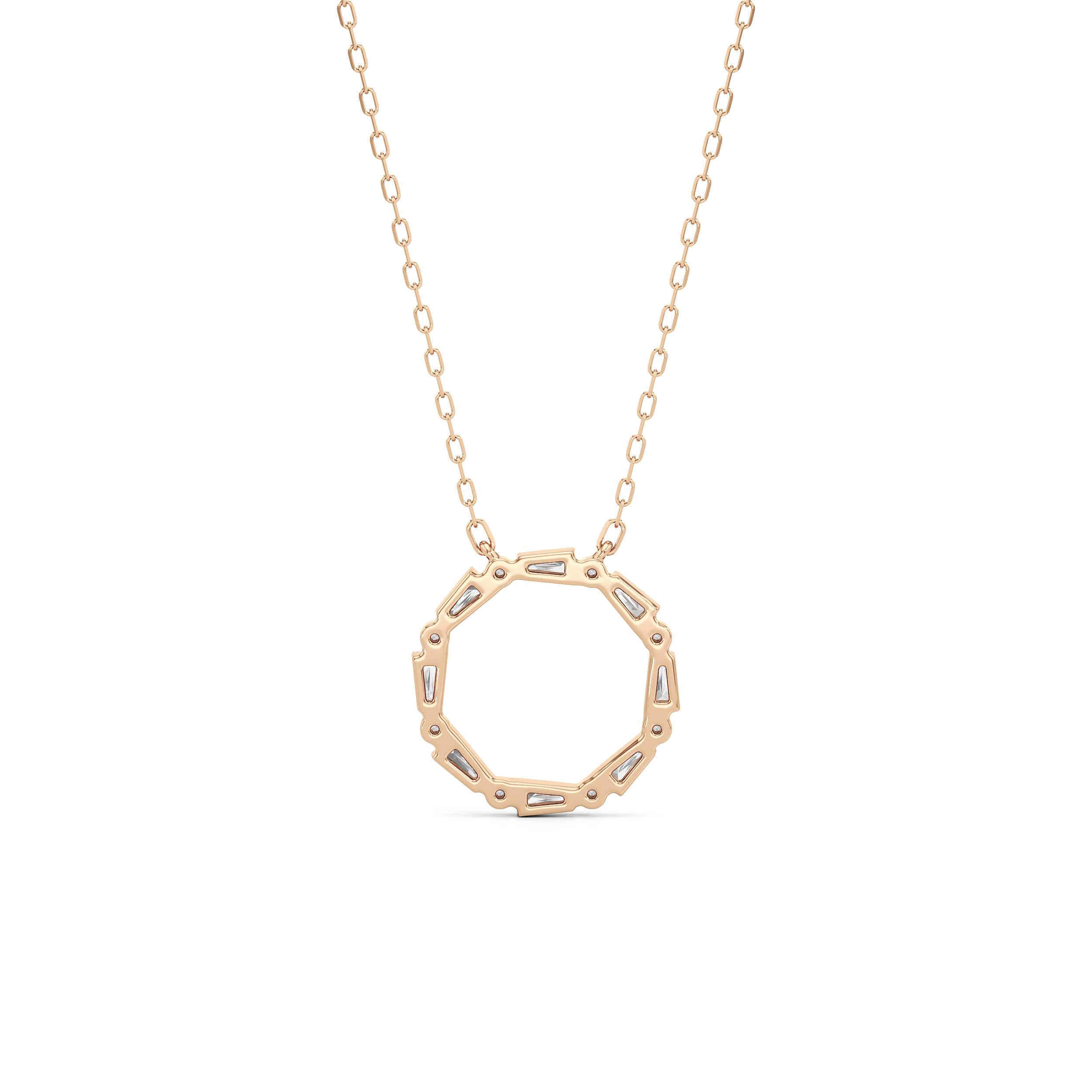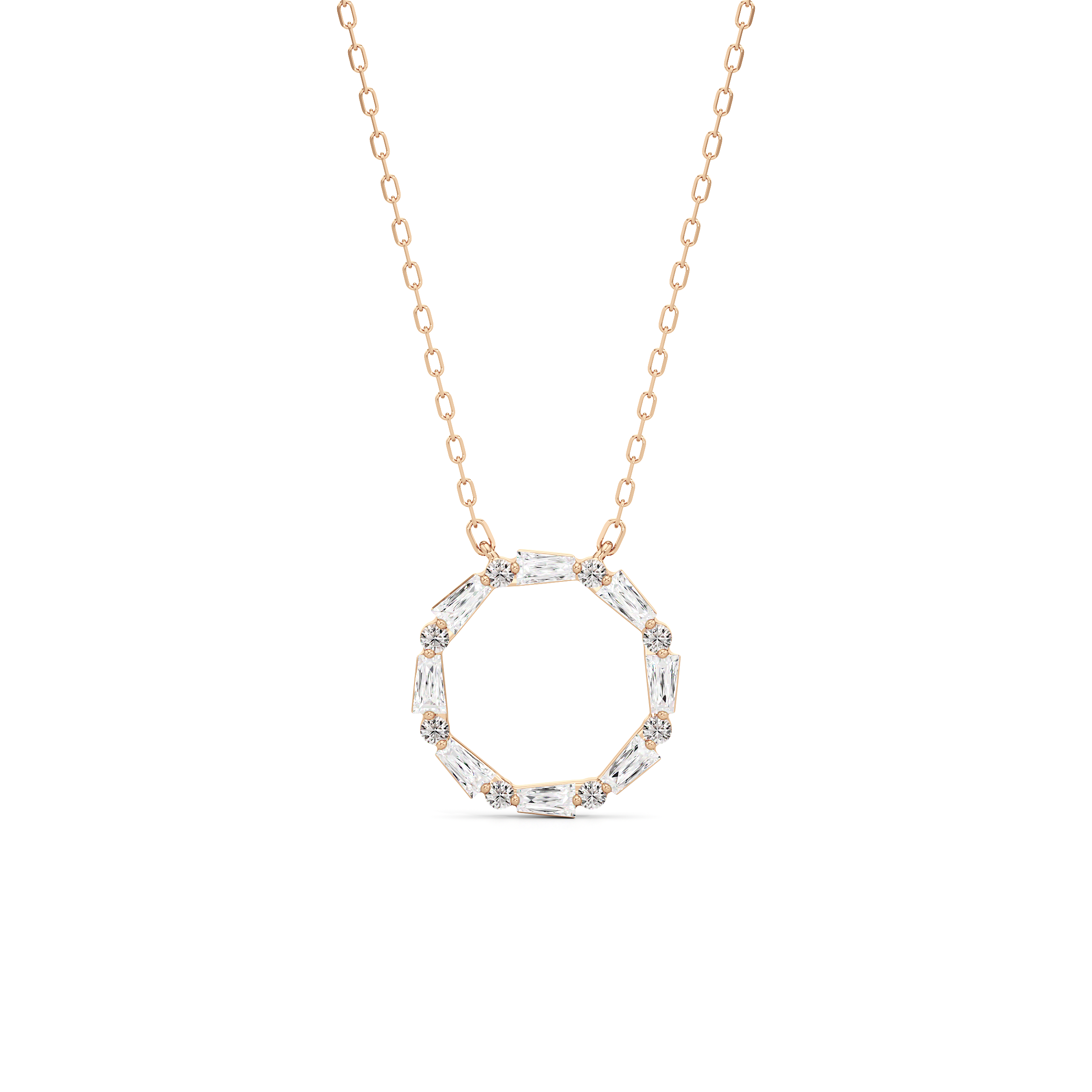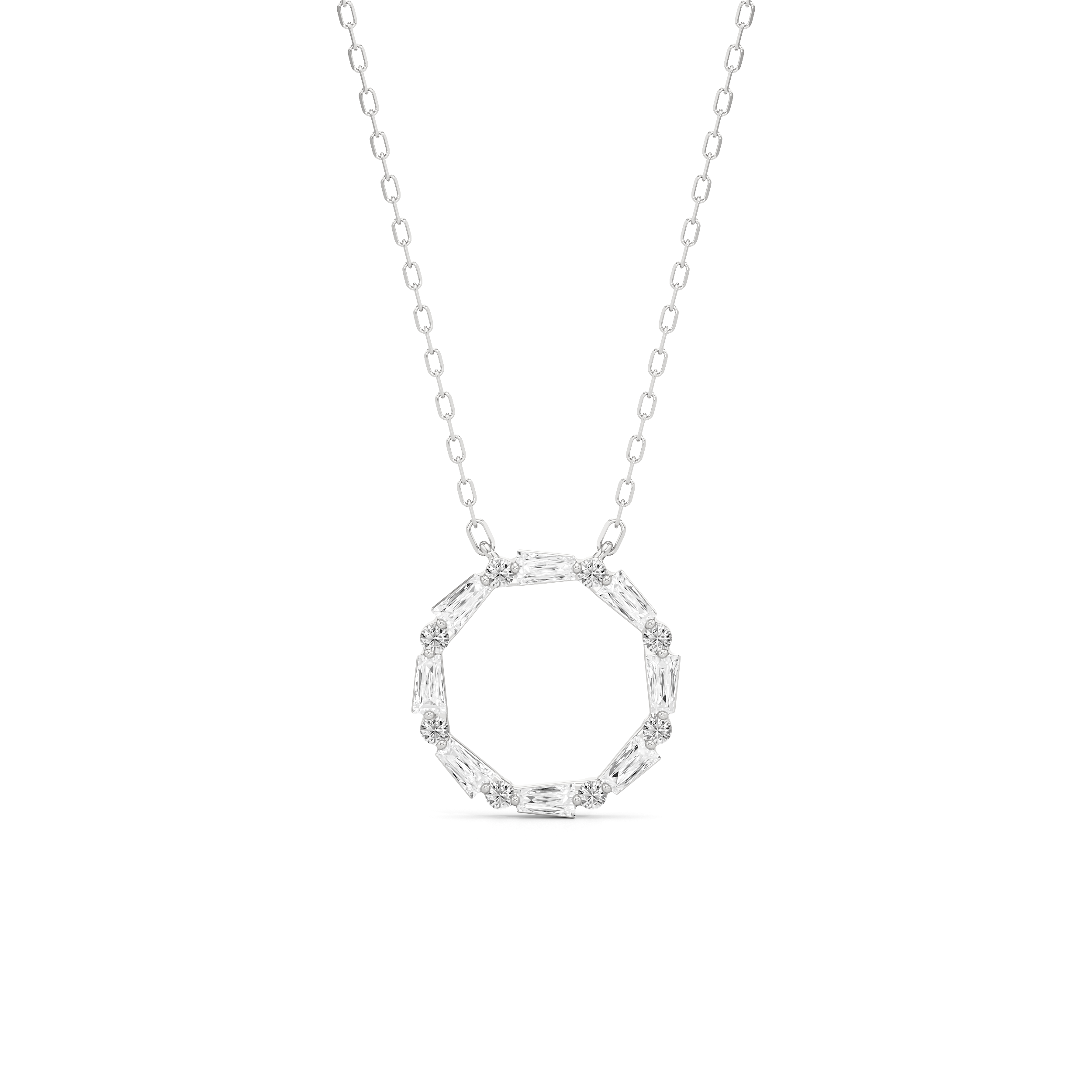 Contrast and dimension join the circle, giving this necklace its crisp, geometric elegance. Round diamonds and tapered baguette diamonds are alternately set on a round frame. This jewel can be paired with just about everything in your wardrobe.